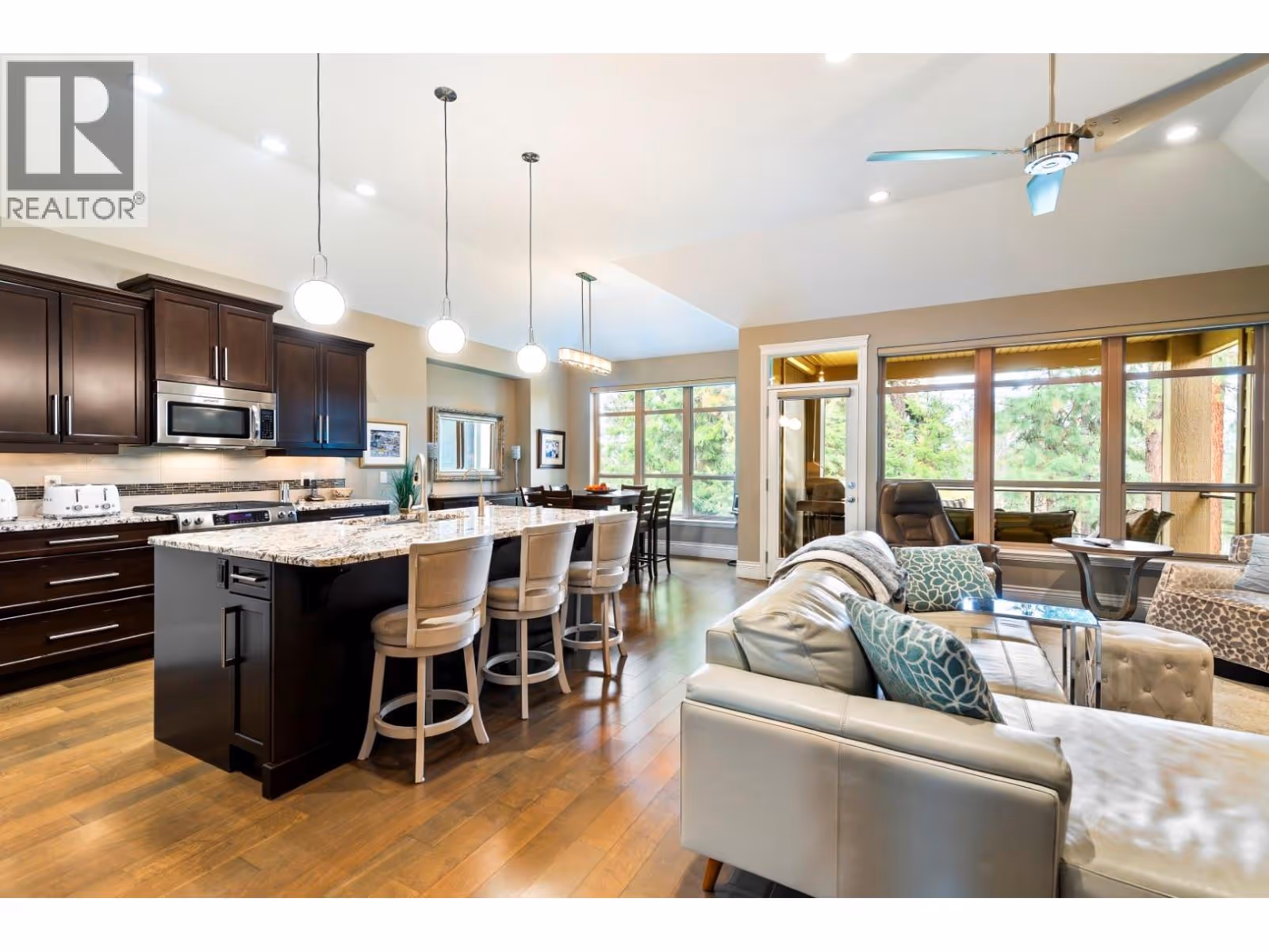 Welcome to this gorgeous custom-built home positioned on the 15th hole in the prestigious Gallaghers Canyon community. Set in a peaceful and private retreat-like setting, this beautifully appointed home features an entertainer’s kitchen with rich maple cabinetry, KitchenAid Architect Series appliances, a walk-in pantry, and a large sit-up granite island. The open-concept design is enhanced by soaring 11-foot ceilings on the main floor and flows seamlessly to the outdoor patio, perfect for summer entertaining. The main floor primary suite includes deck access, a spa-inspired ensuite with heated tile floors, a large soaker tub with handheld shower, a beautifully tiled walk-in shower, separate toilet with washlet and a spacious walk-in closet. A flex room on the main floor offers versatility as a guest bedroom or home office. Downstairs, you’ll find a warm and inviting entertainment area featuring a wet bar, walk-in wine room, another full bathroom, two additional bedrooms, and walk-out access to your private hot tub and putting green—perfect for unwinding or practicing your short game. Additional highlights include engineered hardwood floors, stylish lighting, Front-load washer/dryer, High Efficiency Lennox furnace and A/C system, massive lower-level storage room and an oversized garage with durable acrylic flooring. Enjoy all that Gallaghers Canyon has to offer: a clubhouse, indoor pool and spa, fitness centre, workshop, and two spectacular golf courses. (id:62999)
