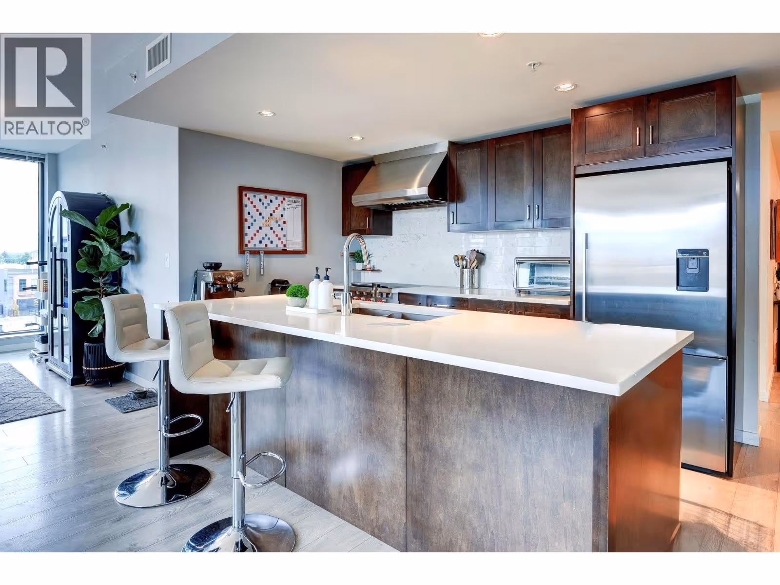 Welcome to luxury living in the heart of Pandosy Village! This beautifully designed 3 bedroom + den condo in the prestigious Sopa Square offers stunning panoramic views of the city, Okanagan Lake, and surrounding mountains. The open concept floor plan boasts a bright and airy living space with walls of floor to ceilings windows. The high end kitchen seamlessly connects to the living room and dining room. With access directly from the living area, enjoy morning coffee or evening sunsets on the spacious wraparound deck, perfect for entertaining or relaxing. High end finishes are used throughout, seen in the kitchen and bathrooms where beautiful dark wood is matched with light stone countertops and stainless steel appliances. The airy interior and stylish mix of natural textures make this condo one of a kind. Secure parking, a gym, meeting room, terrace, pool and hot tub round off this great property. Don’t miss the chance to live in one of Kelowna’s most desirable areas only steps from the best beaches, shops, restaurants, and close to many schools. (id:62999)