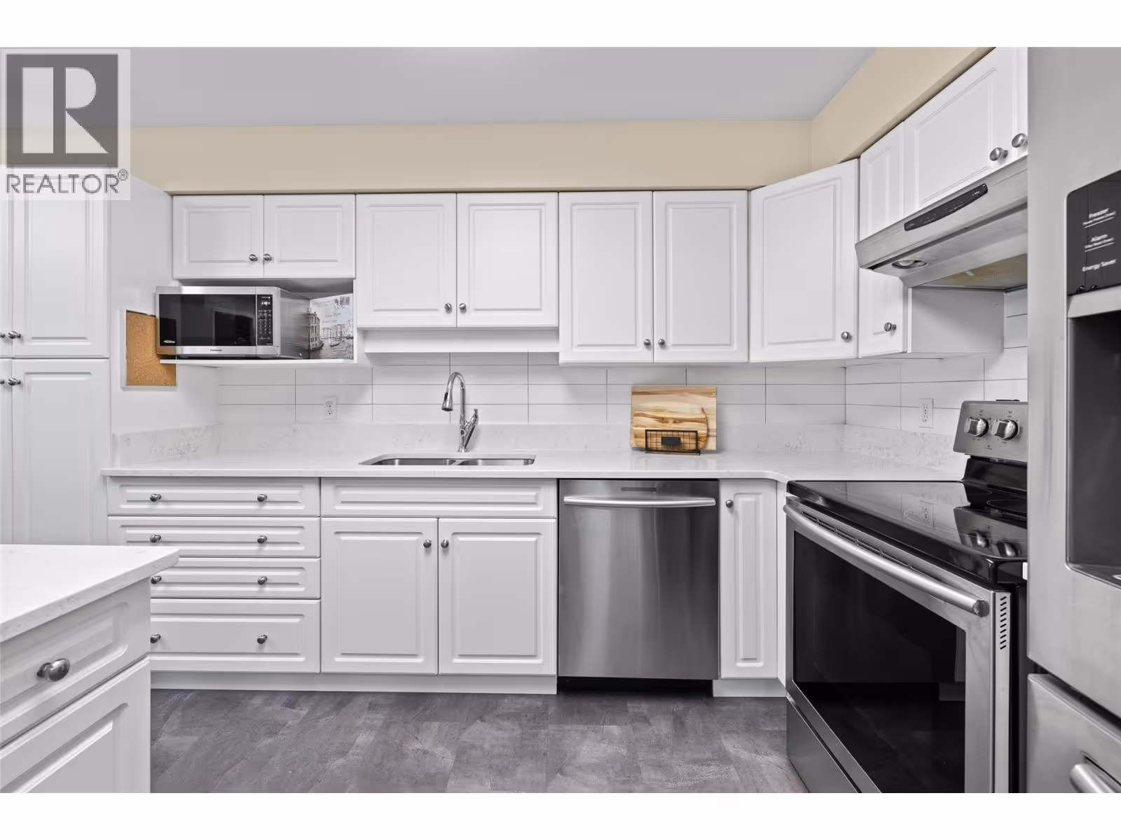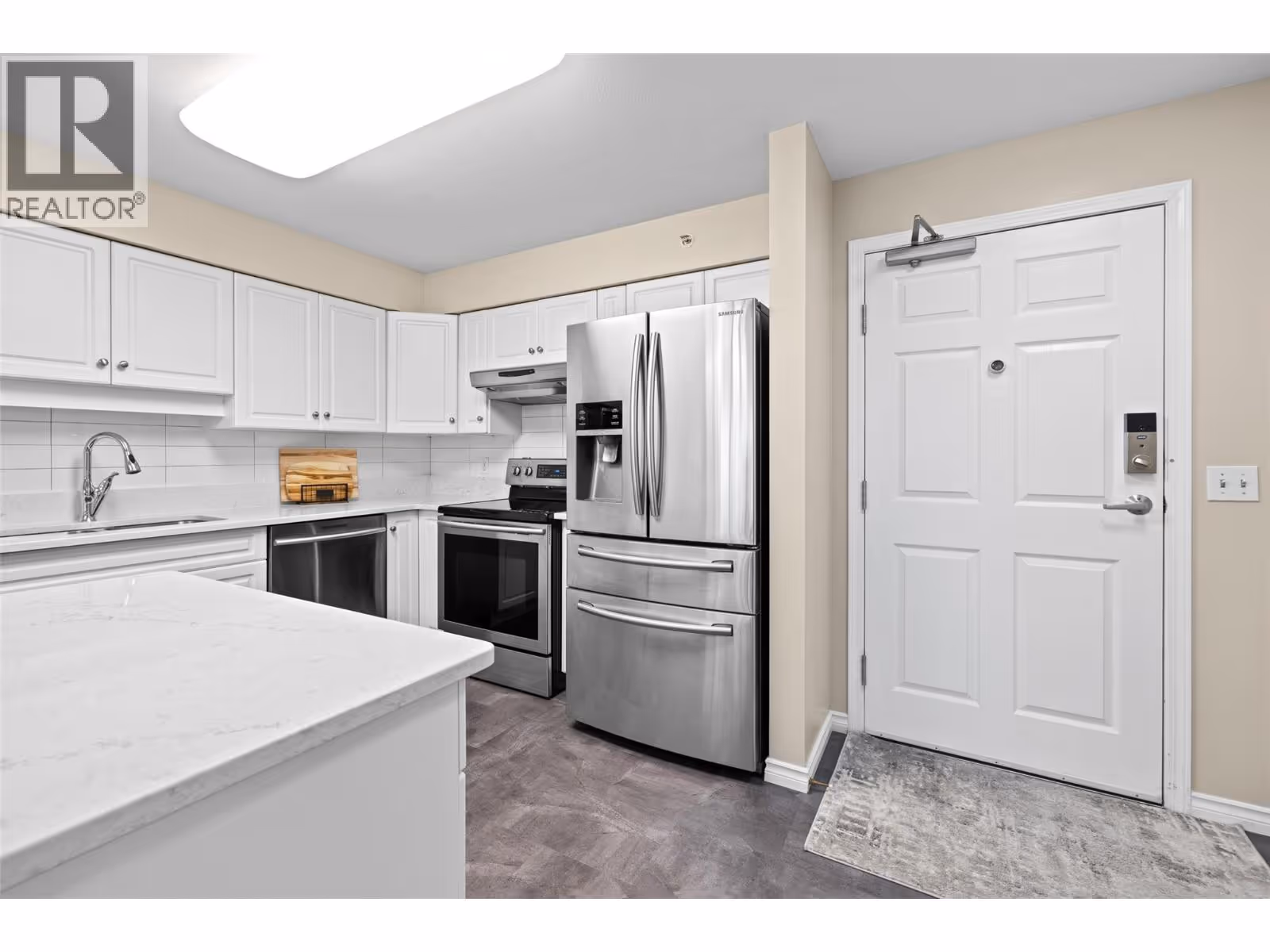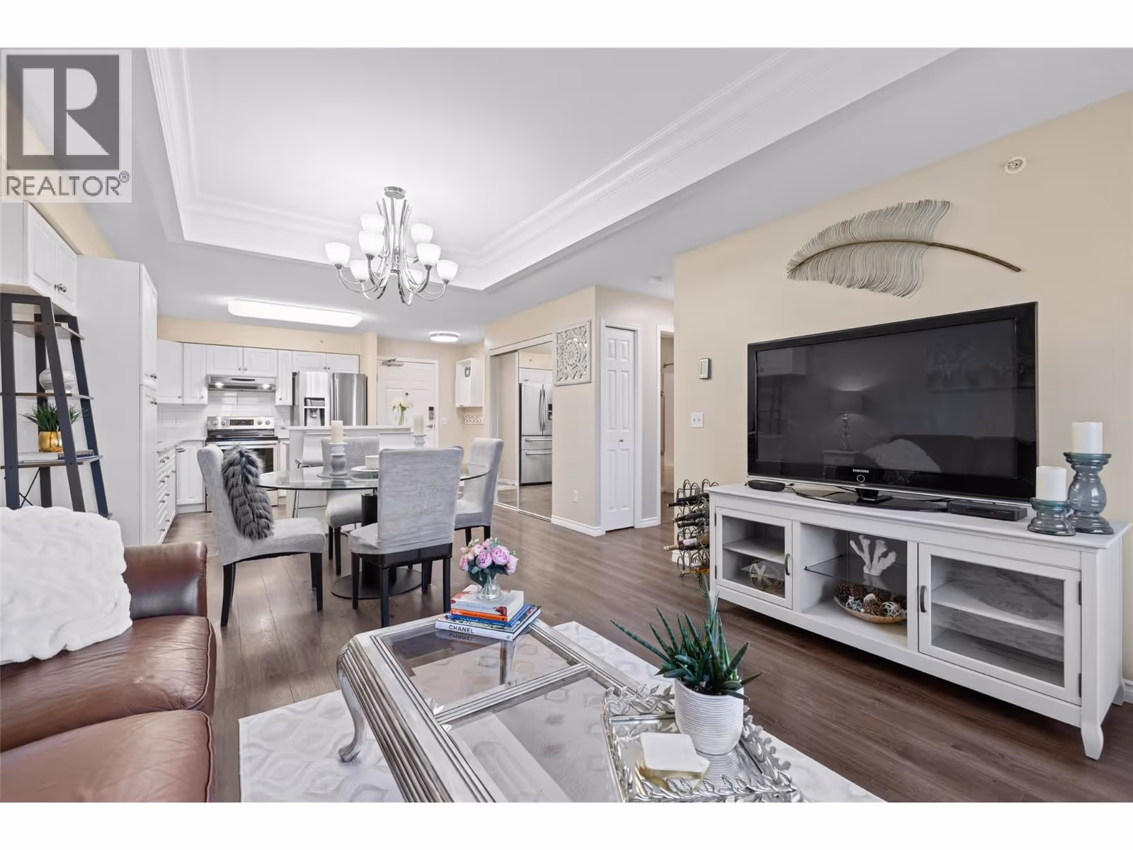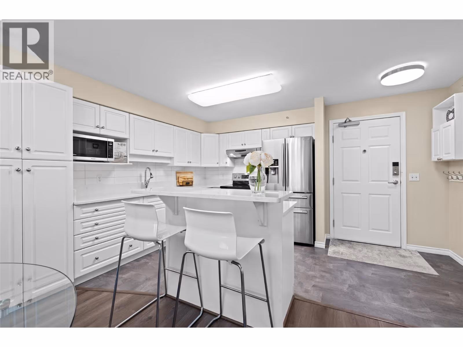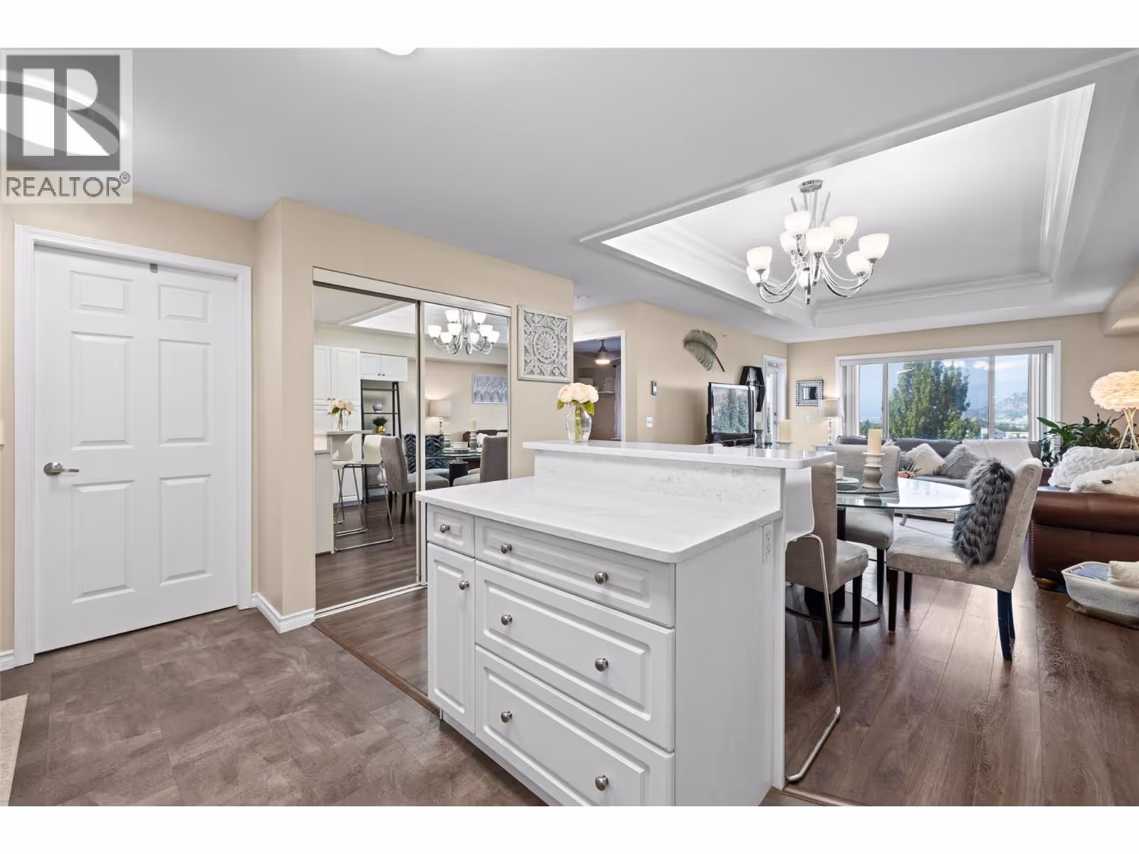 Tastefully updated top-floor 1 bed, 1 bath home in a 55+ community. Professionally renovated with attention to detail, this bright and spacious unit features soaring tray ceilings, granite countertops, stainless steel appliances, Hunter Douglas blinds, and a new lighting package. Enjoy breathtaking city and mountain views from your living room and private patio. The well-designed layout offers both comfort and style. Includes 1 underground parking spot and a storage locker. Just steps from grocery stores, restaurants, and all essential amenities—everything you need is right outside your door. Call today—I’d love to help you make this beautiful home yours! (id:62999)