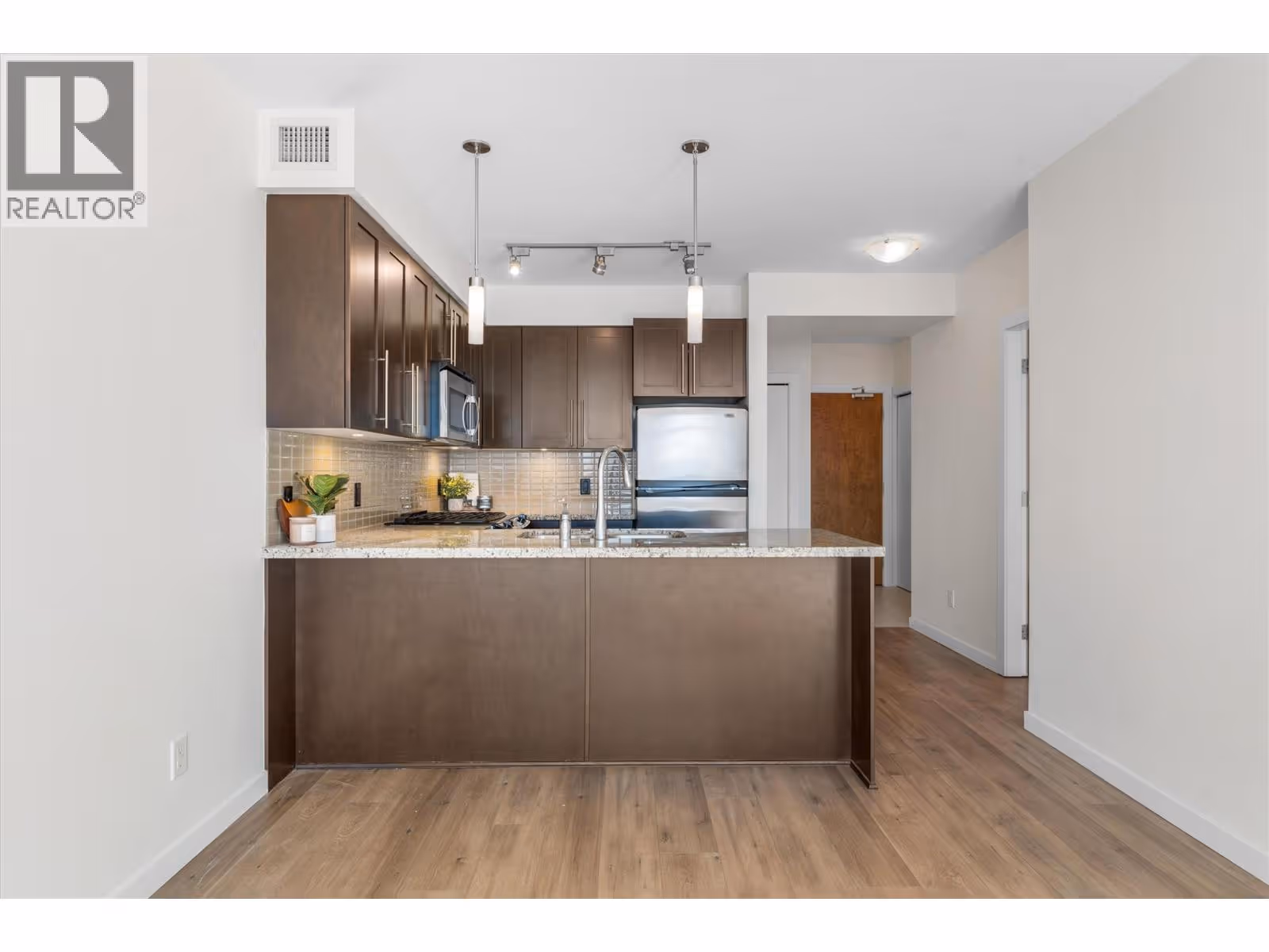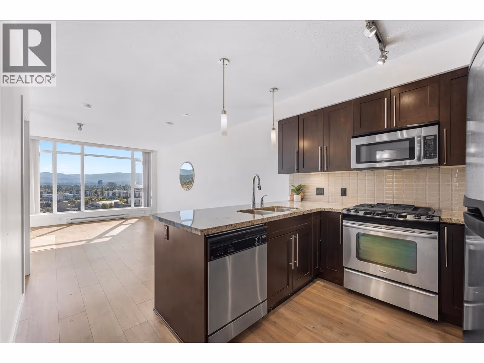 Live the downtown Kelowna lifestyle in this spacious & bright 1 bedroom plus den 14th-floor condo. Located in the sought-after Skye Tower at Waterscapes, offering views of the city, mountains, and the lake. Perfectly situated, this dog friendly condo combines comfort and convenience in one of Kelowna’s most desirable communities. Inside you'll find an open concept floor plan with bright southeast facing windows, plus upgrades including hard surface flooring throughout, granite countertops, and stainless steel appliances. The building offers secure underground parking for both residents and guests, along with fob-controlled access to each floor for added peace of mind. As a resident you enjoy access to the Cascade Club featuring a private fitness room, billiards lounge, outdoor pool, two hot tubs and BBQ area. You also get access to rentable furnished guest suites. Everything you need is within walking distance — restaurants, shopping, hotels and Prospera Place for hockey games and events. Nature lovers will appreciate nearby Knox Mountain Park with its scenic trails and unbeatable lake views. Your new home awaits. (id:62999)