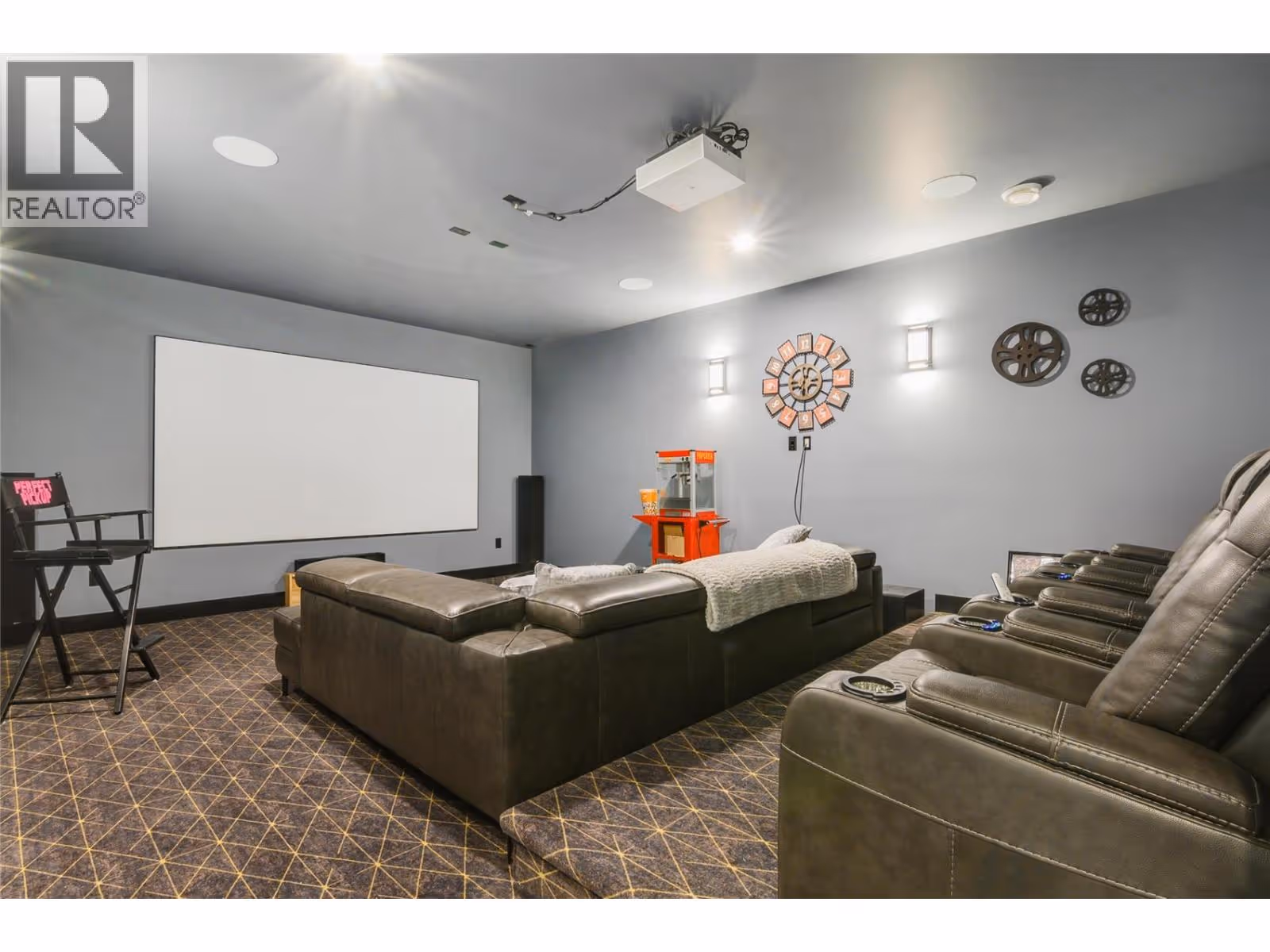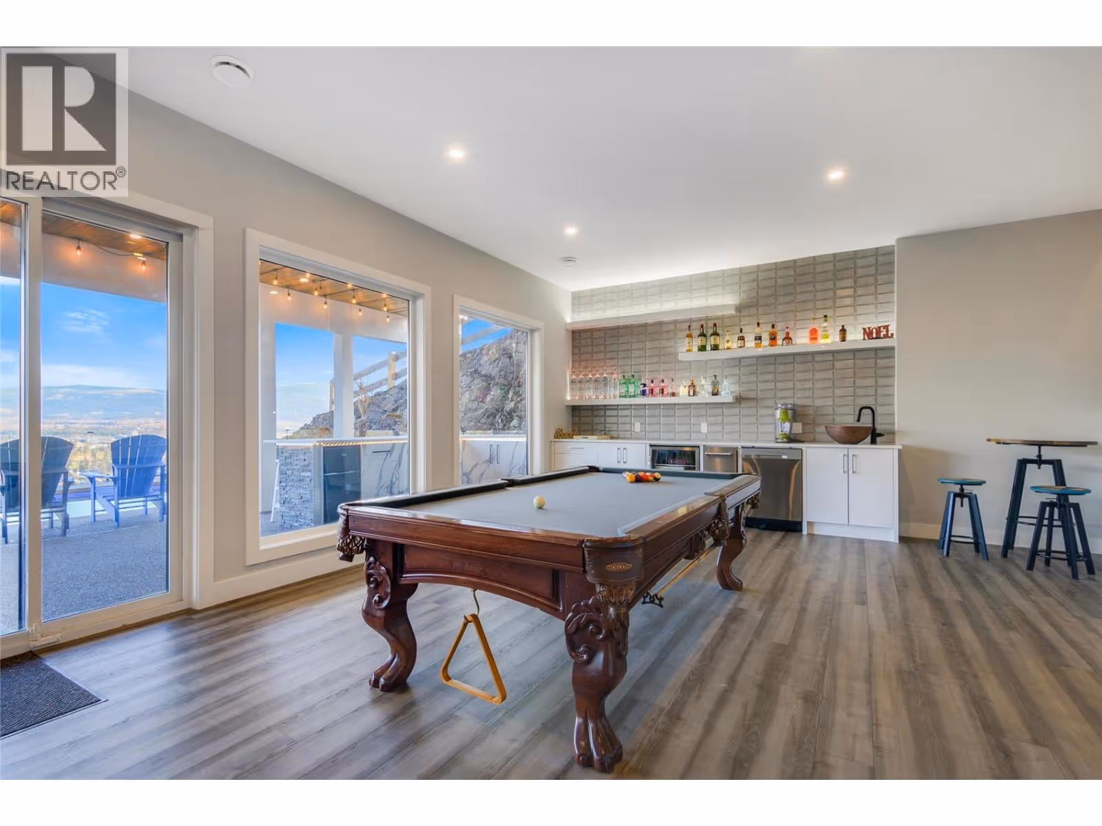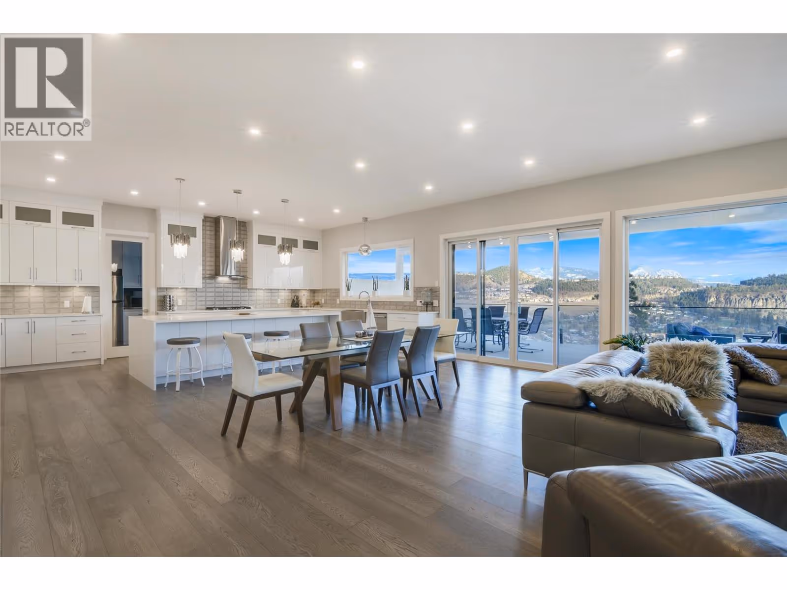 Perched high on the coveted cliffs of Highpointe Terrace, this architectural showpiece captures the essence of luxury living. Every detail reflects masterful design and craftsmanship, while breathtaking panoramas stretch across lush orchards, the rugged beauty of Dilworth Mountain, and the sparkling waters of Okanagan Lake. Spanning three levels of refined living, this residence offers four spacious bedrooms—three with private ensuites—along with two additional bathrooms. The main floor is designed for both everyday living and unforgettable entertaining, anchored by a dramatic open-concept layout. At the heart of the home, a chef’s kitchen shines with a massive 10-foot island, premium gas range, hidden butler’s pantry, Bosch stainless steel appliances, and the crown jewel: a Sub-Zero fridge/freezer combo. The lower level transforms into an entertainment retreat, complete with a sleek wet bar, pool table area, fully soundproofed theater, a striking wine feature wall, and a private gym. Outdoors, the lifestyle continues with a temperature-controlled pool and soothing hot tub—both perfectly positioned to capture sweeping valley views. Practicality meets prestige with a four-car garage and ample on-site RV parking, making this estate as functional as it is extraordinary. A true one-of-a-kind offering, this Highpointe residence redefines refined living in the Okanagan. (id:62999)