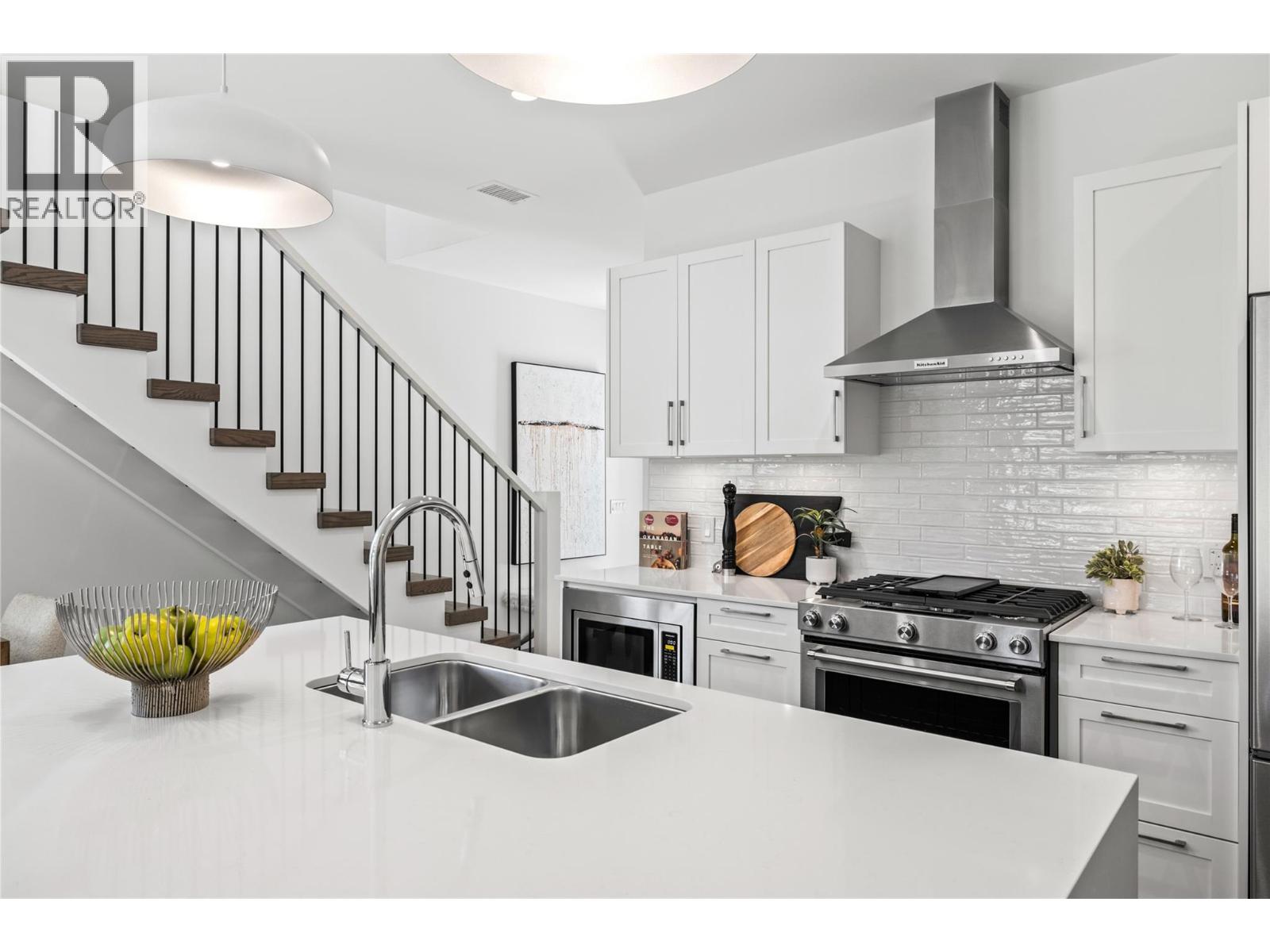 Move In Now. Close Later. Experience the Lifestyle Bridge Program at Quail Landing. Golf course living at your doorstep. Move-in ready, award-winning townhomes on the 18th hole of the Quail Course. Quiet but convenient location near YLW, UBC-Okanagan and the growing University/Airport district shopping/dining area. Approx.1,950 sq ft, featuring a main floor primary with two additional bedrooms and a den/flex area upstairs. Designer details including the open tread wood staircase, German-made laminate flooring on the main floor, LED lights and an open floorplan. The kitchen includes KitchenAid appliances, 5-burner gas stove, quartz countertops, waterfall island with storage on both sides, and shaker cabinetry with under cabinet lighting. Your living extends outside to your covered patio with natural gas bbq hook up and Lake Views. Plus, take advantage of BUYING NEW with PTT Exemption of approx $14,998 (conditions apply). Photos & virtual tour may be of a similar home in the community. Showings by appointment. Move In Now. Close Later. Only a few homes remain, priced from $849,900. (id:62999)
