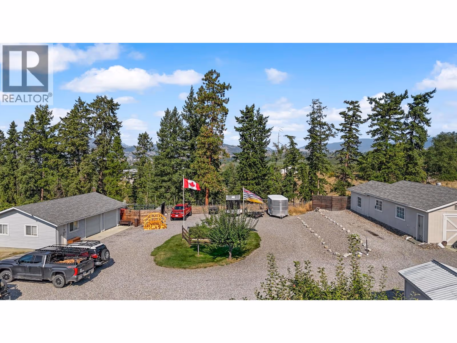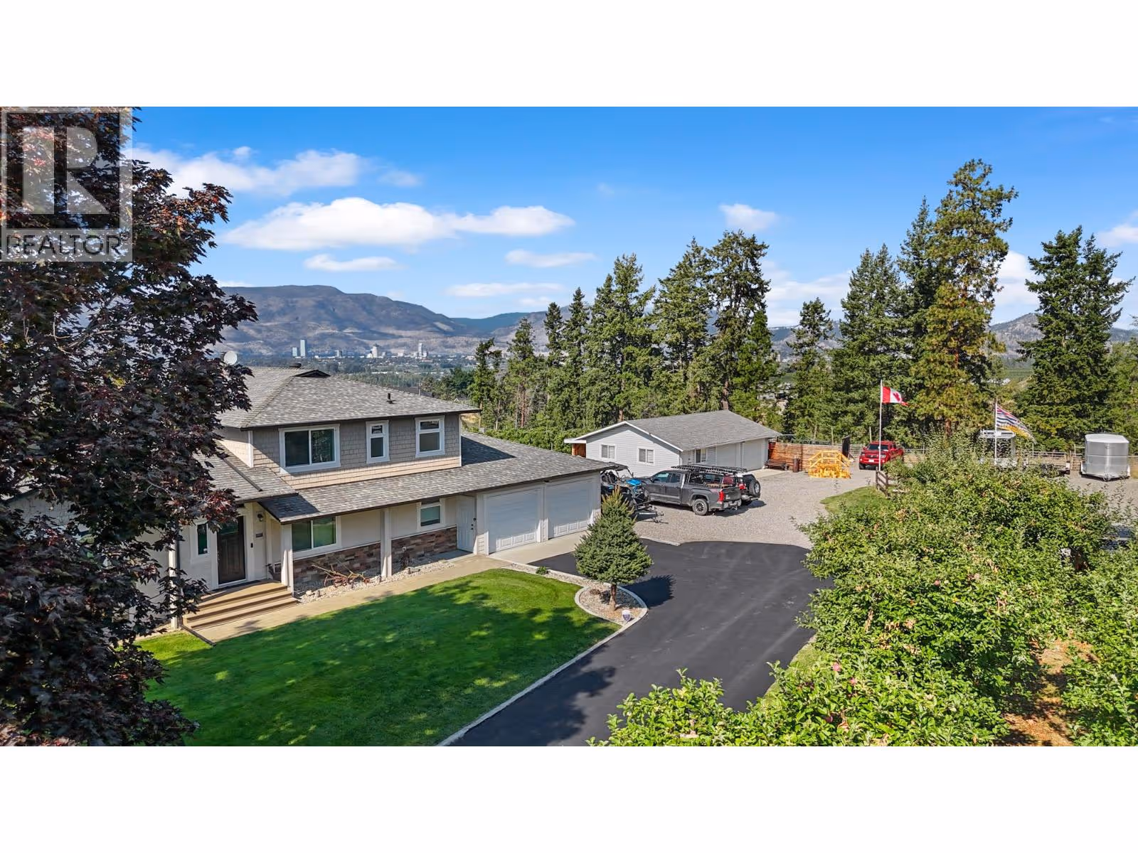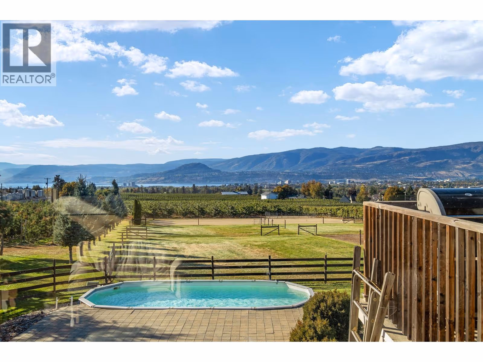 Immerse yourself in some of the most captivating views Kelowna has to offer from this sought-after East Kelowna estate acreage. Gaze across Okanagan Lake as it winds from Peachland to Knox Mountain, framed by sparkling city lights and mountain silhouettes. Set amid orchard and vineyard estates, this location is just minutes from Orchard Park and downtown Kelowna. The renovated 4,280+ sq. ft. home is in pristine condition, thoughtfully designed to showcase the sweeping views—especially from the expansive kitchen, where view facing cabinets sit below window height for uninterrupted sight lines. A bright, inviting sunroom quickly becomes everyone’s favourite spot to relax. The versatile layout suits family living with multiple open concept gathering spaces, four bedrooms, a mudroom with dog wash, and a lower level easily suite-ed thanks to a summer kitchen. New roof just completed. Outdoors, unwind in the above-ground pool with its professionally designed deck and micro hot tub—perfect after a day of riding. The upper-level primary suite enjoys the home’s best view, featuring large windows, his-and-hers closets, and a spa-style ensuite with separate tub and shower. Equestrians will love the two paddocks with shelters, riding ring, and two substantial shops—one with a heated tack room—plus an oversized double garage and several outbuildings. A modern apple and cherry orchard provides farm status for low taxes and easy, low-impact farming, all on this incredible 7 acre estate. (id:62999)