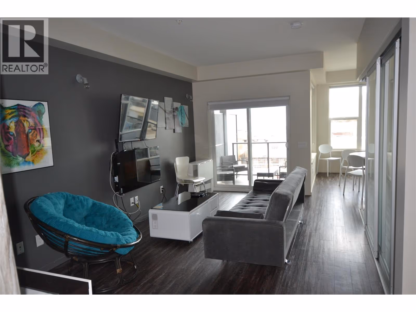This amazing 5th floor condo is in the sought after Sole building in the heart of Kelowna's cultural district. This centrally located 2 bedroom (or Den) 1 bath condo with views to Knox Mountain, has quartz counters, vinyl plank flooring, stainless appliances, washer, dryer and roller blinds. Smart spaces, edgy design and located within easy walking distance to the new UBCO downtown campus, library, pubs, restaurants, art walk and Prospera Place. The 6th floor offers great fitness facilities and a beautiful outdoor rooftop patio with a view to the lake and city; ideal for entertaining. Walk to all major amenities and the fabulous beaches of Okanagan Lake in minutes. Pet friendly building. Can be fully furnished or not. This building is zoned for short term rentals so can be rented (with a city license) if it is your primary residence, or when short term rentals are permitted again. The unit is set up for STR with locking cabinets so is perfect if you live in the unit and regularly travel! (id:62999)
