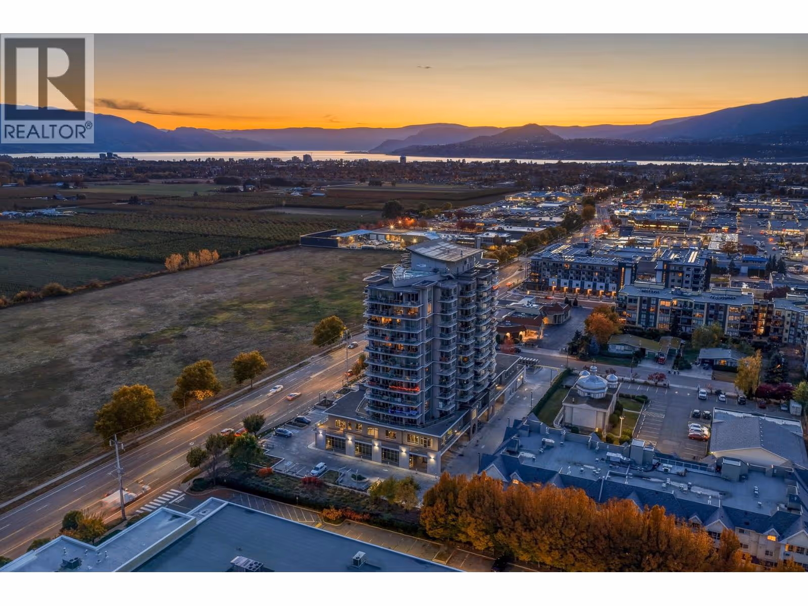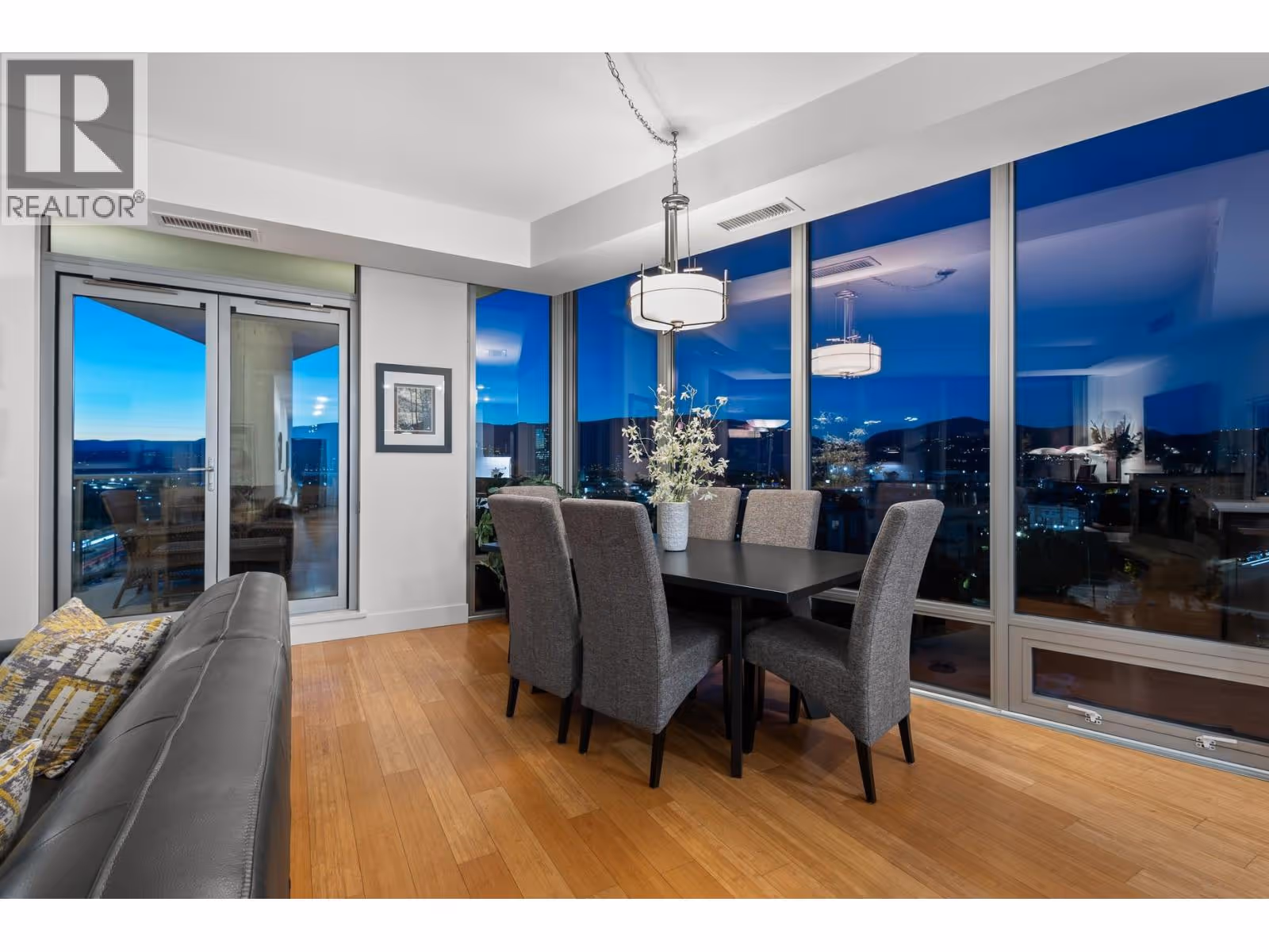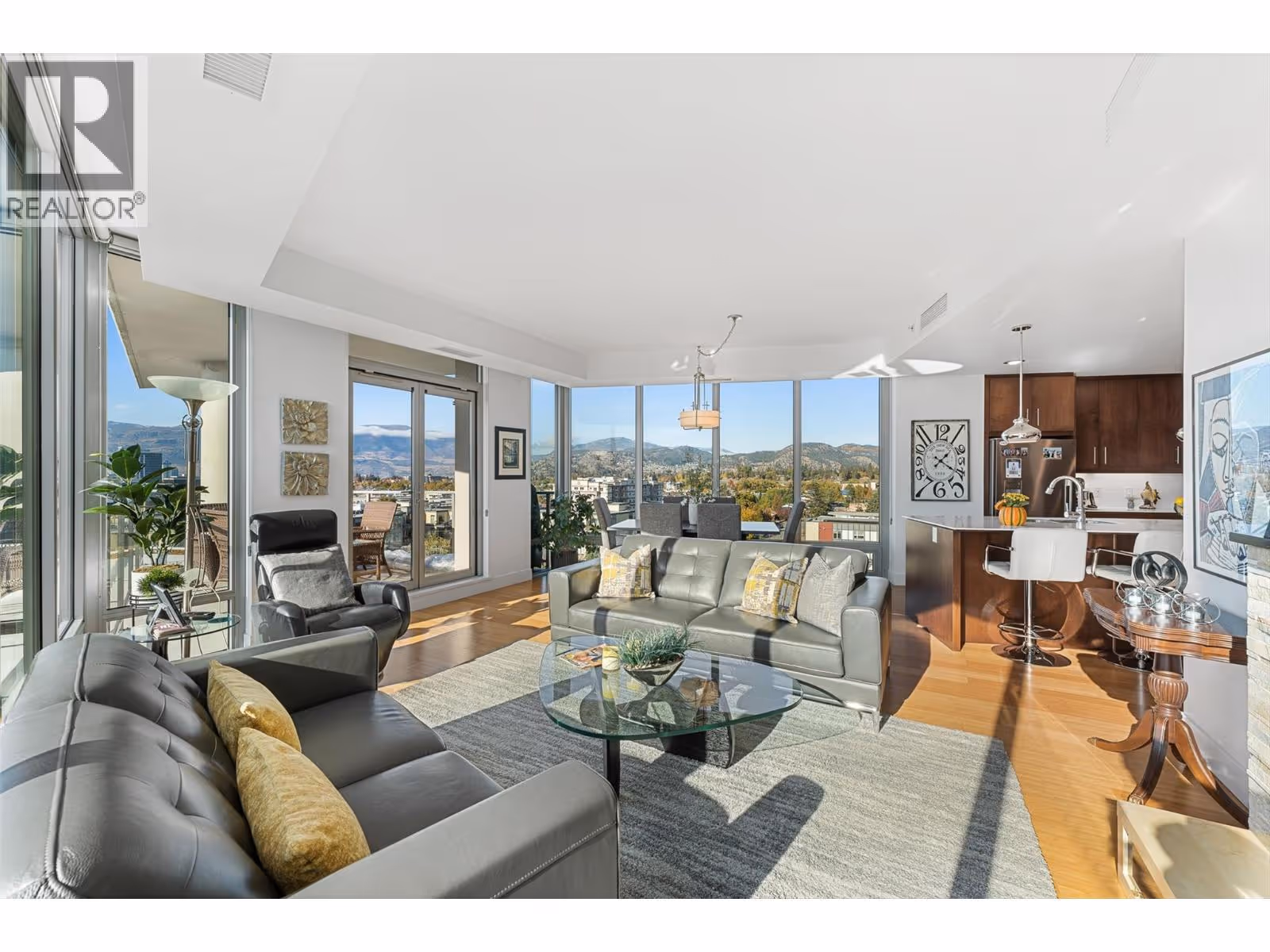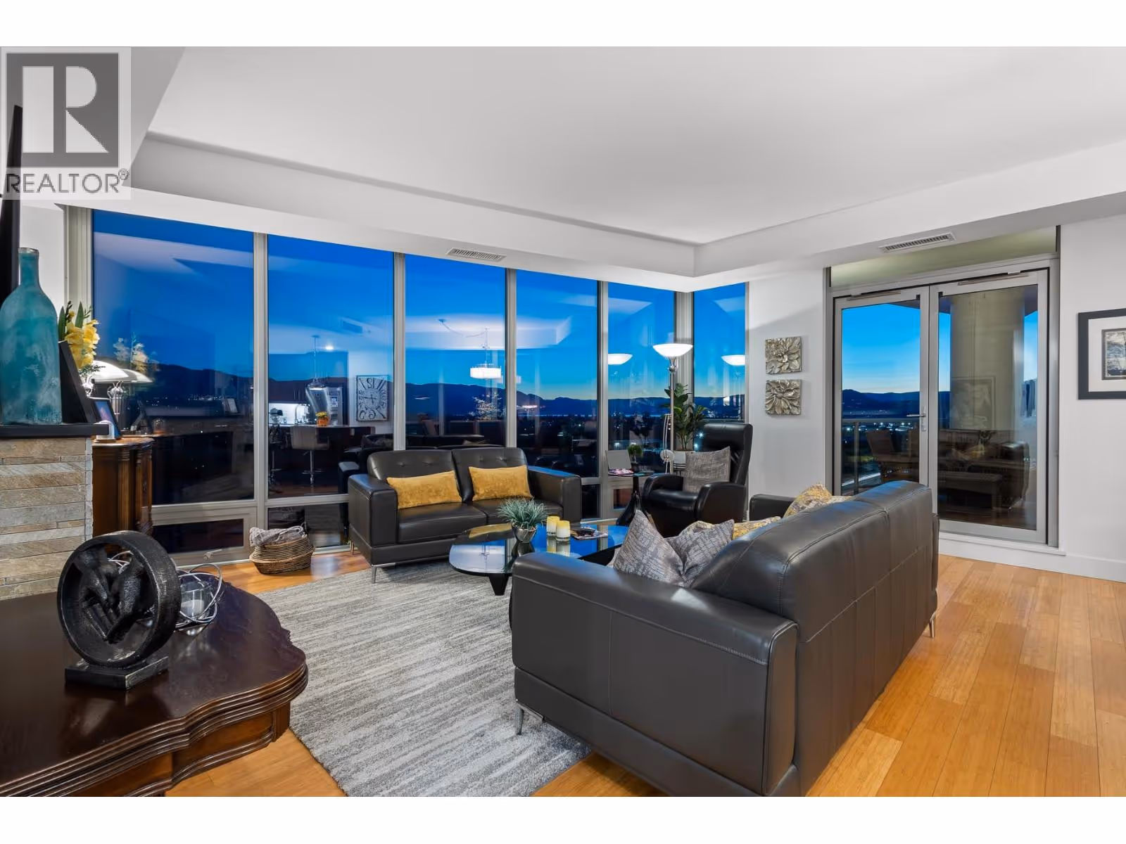 This desirable corner residence captures panoramic views of Kelowna’s cityscape, mountains, and shimmering lake views. Floor-to-ceiling windows fill the open-concept living space with natural light, creating a seamless connection between the indoors and the stunning Okanagan landscape. The kitchen is beautifully appointed with rich toned wood cabinetry, quartz countertops, a large island with seating for three, and premium appliances including a Fisher & Paykel fridge and Whirlpool range. Entertain effortlessly in the adjoining dining area beneath a contemporary chandelier, or relax in the living room beside the sleek linear fireplace framed by a stone and quartz finish. The primary suite is a private retreat with a walk-in closet, spa-inspired ensuite featuring two vessel sinks and a spacious glass shower plus direct access to a covered deck with northwest-facing city and mountain views. A second bedroom and full bath provide an ideal setup for guests. Two covered decks extend the living space outdoors—perfect for morning coffee or sunset gatherings—with gas hookup and glass railings to maximize the view. Additional features include in-suite laundry with built-in cabinetry, hardwood flooring, and ample storage throughout. Residents enjoy resort-style amenities, including a rooftop heated pool, hot tub, and fireplace patio, a fitness studio with sauna and steam rooms, underground parking with wash bays and a dog wash station, plus two private guest suites for visitors. (id:62999)