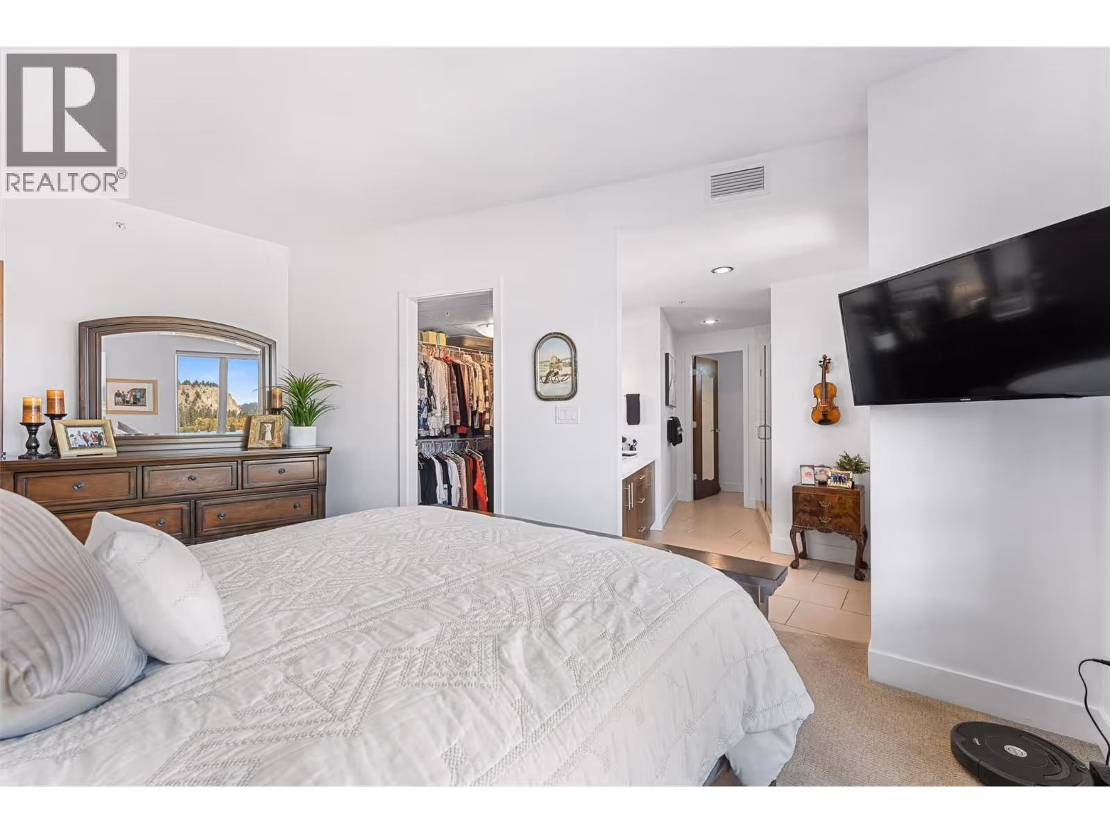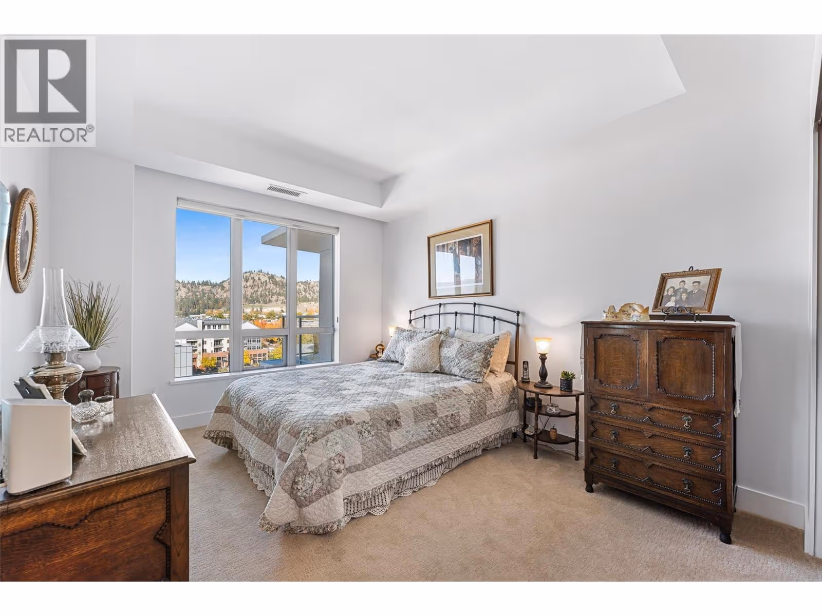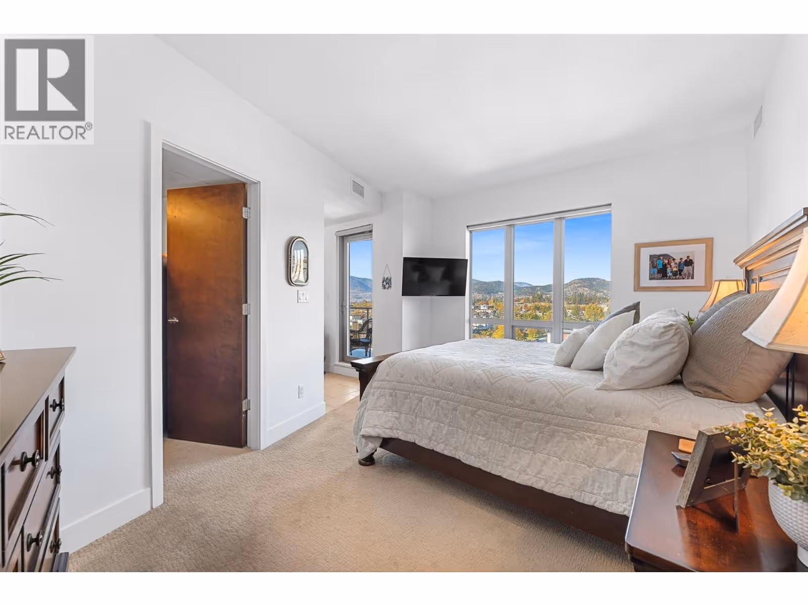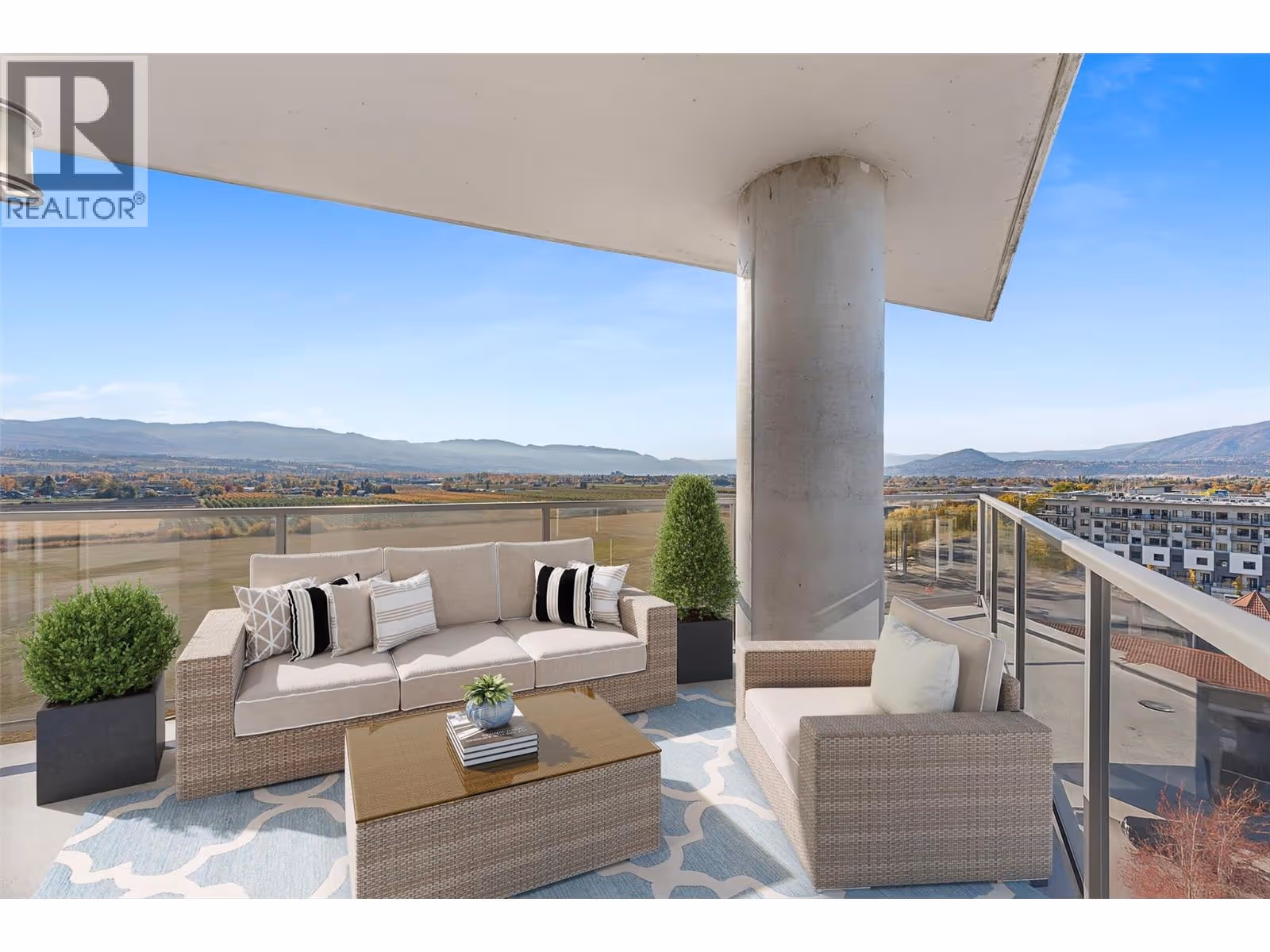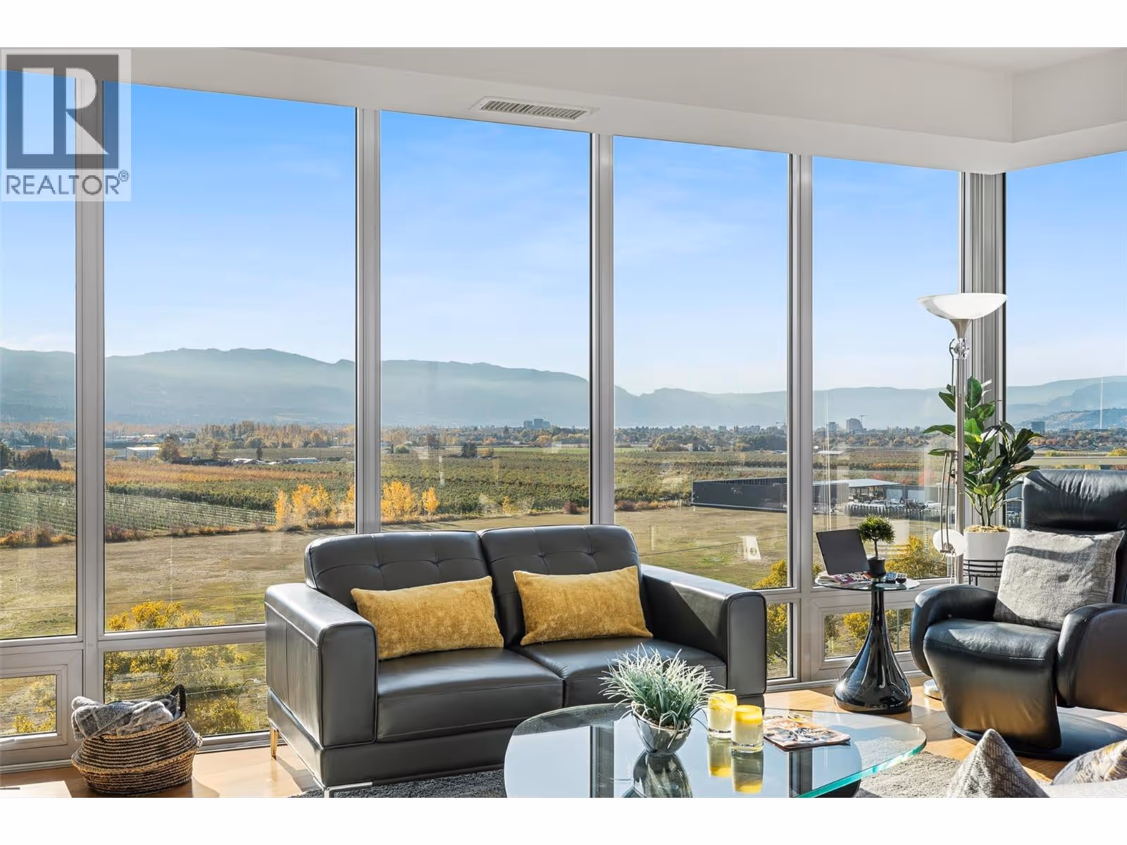 This desirable corner residence captures panoramic views of Kelowna’s cityscape, mountains, and shimmering lake views. Floor-to-ceiling windows fill the open-concept living space with natural light, creating a seamless connection between the indoors and the stunning Okanagan landscape. The kitchen is beautifully appointed with rich toned wood cabinetry, quartz countertops, a large island with seating for three, and premium appliances including a Fisher & Paykel fridge and Whirlpool range. Entertain effortlessly in the adjoining dining area beneath a contemporary chandelier, or relax in the living room beside the sleek linear fireplace framed by a stone and quartz finish. The primary suite is a private retreat with a walk-in closet, spa-inspired ensuite featuring two vessel sinks and a spacious glass shower plus direct access to a covered deck with northwest-facing city and mountain views. A second bedroom and full bath provide an ideal setup for guests. Two covered decks extend the living space outdoors—perfect for morning coffee or sunset gatherings—with gas hookup and glass railings to maximize the view. Additional features include in-suite laundry with built-in cabinetry, hardwood flooring, and ample storage throughout. Residents enjoy resort-style amenities, including a rooftop heated pool, hot tub, and fireplace patio, a fitness studio with sauna and steam rooms, underground parking with wash bays and a dog wash station, plus two private guest suites for visitors. (id:62999)
