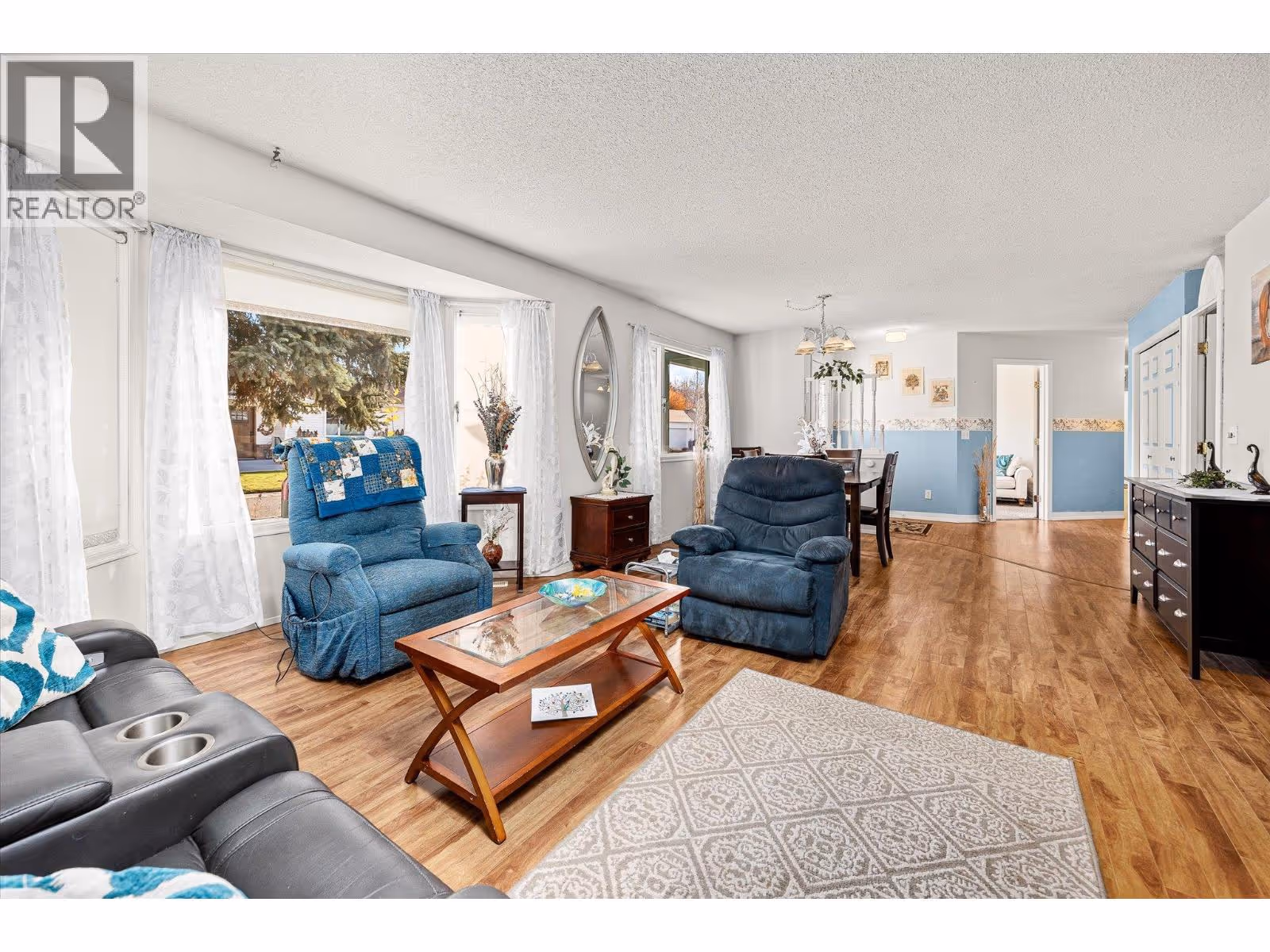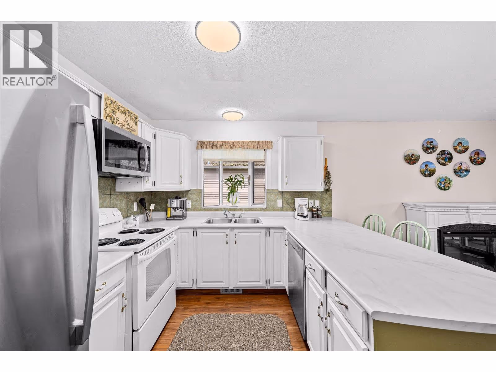 Vacant Fast Possession Possible. This immaculate 3-bedroom rancher sits on a desirable corner lot in Sunrise Village, a well-maintained 45+ adult community known for its central location close to all the local amenities! Offering a very private yard, this home is just steps to the clubhouse where you can socialize and enjoy summer afternoons by the pool and hot tub! Inside, the layout feels bright and spacious with a large dining and living room, complete with a cozy gas fireplace. The updated kitchen features new countertops and connects to a welcoming family room with direct access to a private outdoor patio—perfect for relaxing or entertaining! The primary bedroom offers a 3-piece ensuite and walk-in closet, while the two additional bedrooms are supported by a full 4-piece bathroom—ideal for guests, a home office, or hobby space. This home is built on a concrete foundation with a crawl space for storage and a 2 car garage. Please note: this home is on private leased land and the price does not include the land. Pad rent is currently $615 per month. Enjoy affordability in a prime location close to groceries, shopping, parks, transit, medical offices, KGH, Pandosy Centre and Guisachan Village! Recent upgrades include New Hot water tank Nov 2025, Kitchen Counters Nov 2025, Irrigation Controller May 2025, Air Conditioner July 2024, Microwave July 2024, Stove & Fridge Sept 2023, Gas furnace Nov 2019. (id:62999)