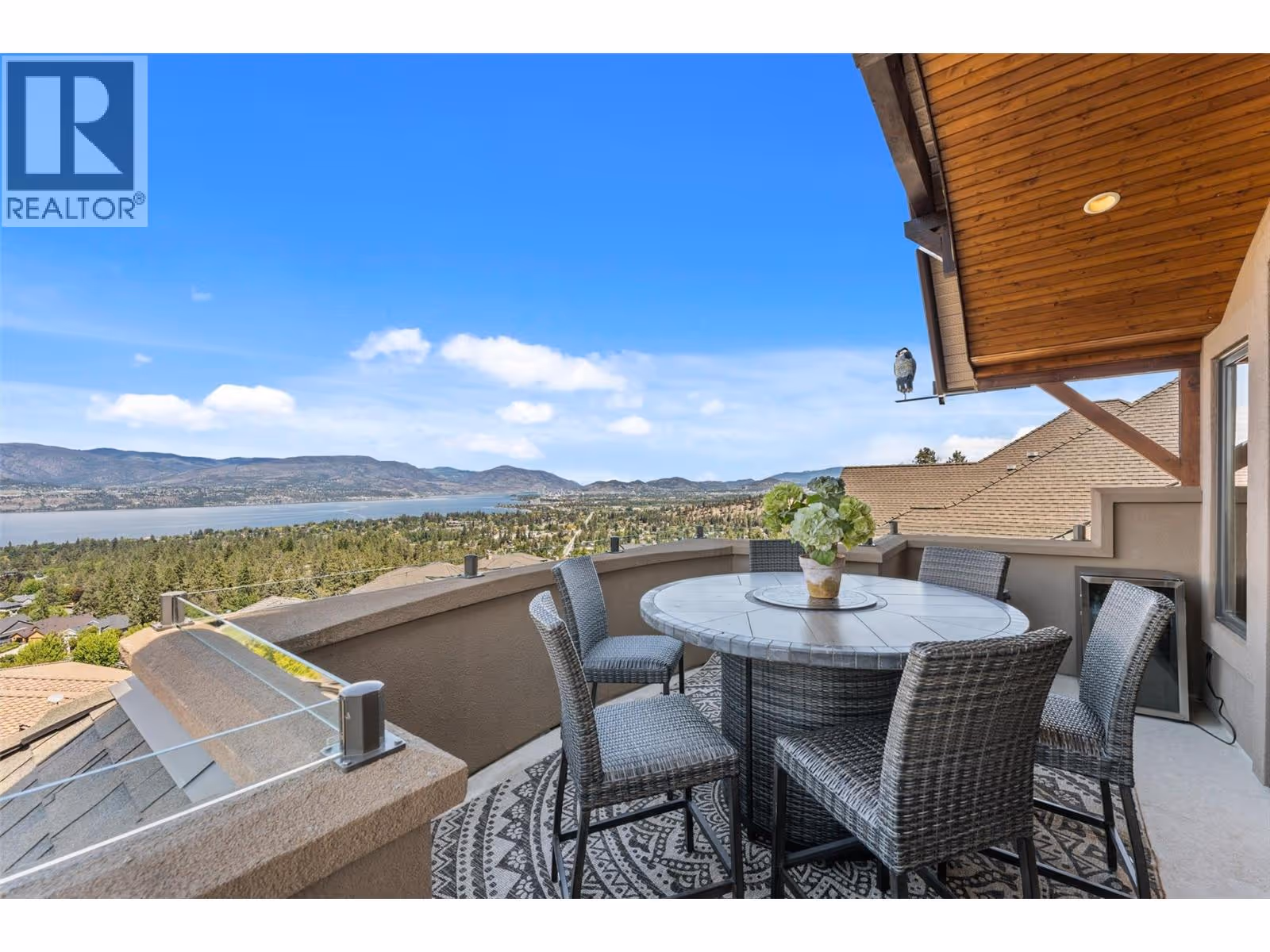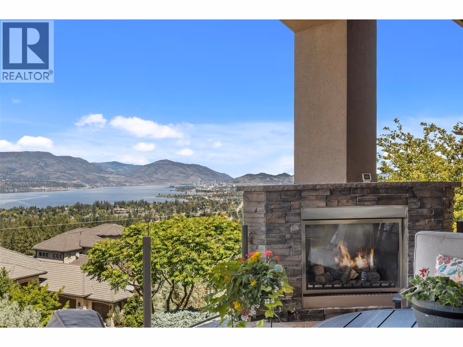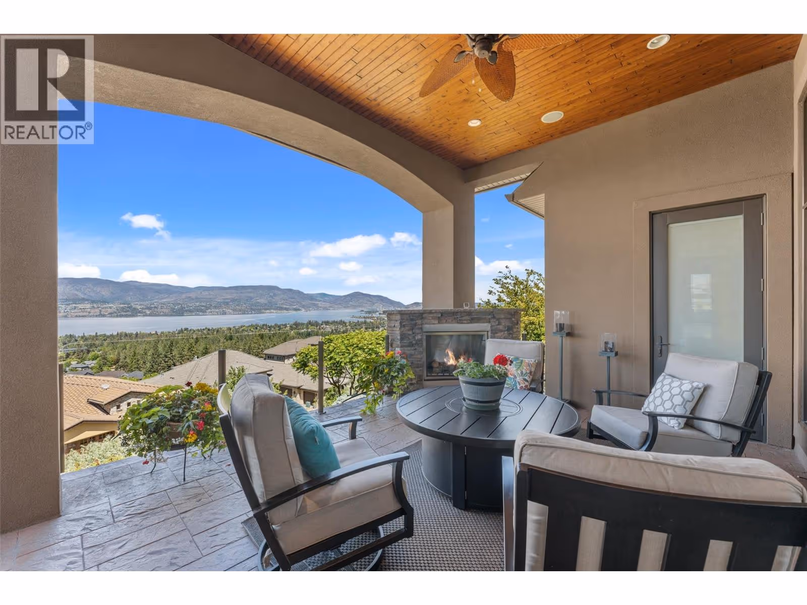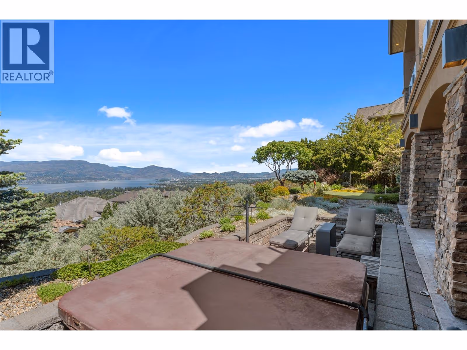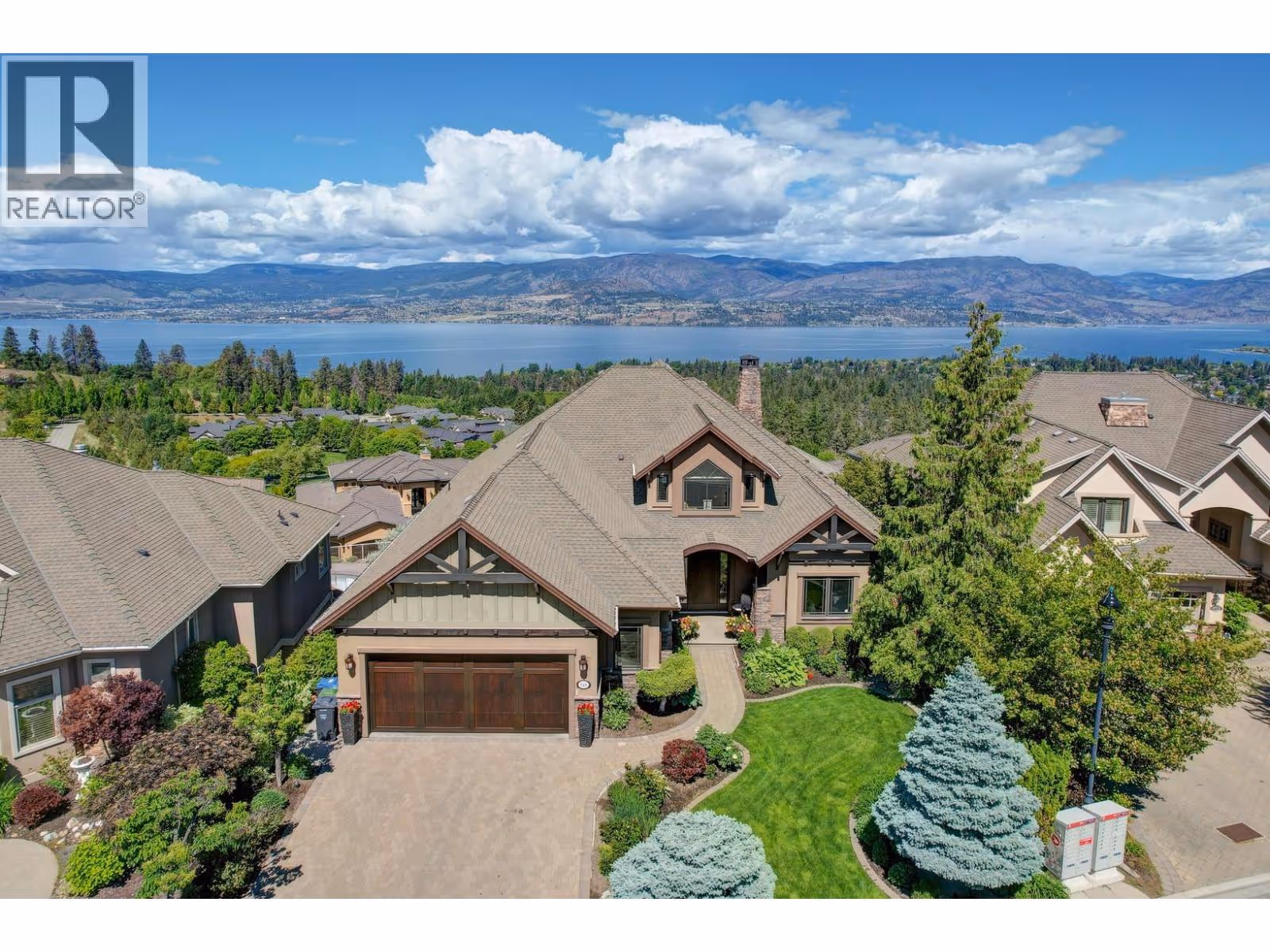 Unrivalled lake views stretch from Bear Creek to Peachland in this breathtaking Upper Mission residence. Showcasing over 5,500 sq. ft. of refined quality construction, this 5-bedroom, 5-bathroom estate is a masterclass in design, comfort, and craftsmanship and boasts lake views from all 3 levels. The main level offers effortless living with a grand great room, a chef-inspired kitchen with Thermador appliances and island seating for six, and a deluxe primary retreat featuring a spa-inspired ensuite with steam shower and private deck access. Automated with Control4 and designed for entertaining, enjoy the panoramic wraparound patio with fireplace above, or head to the lower level where a wet bar, theatre room, and spacious rec area await. Three additional bedrooms, each with ensuite access, open to a covered patio with a putting green, hot tub, tranquil water feature & private backyard. A vaulted loft with private balcony makes the perfect office or artist's escape. Thoughtful touches include a 4-car garage (2 deep), home-wide built-in speakers, and manicured, low-maintenance landscaping. Located only a couple mins from the new Upper Mission Shopping centre. This is lakeview living elevated—privacy, luxury, and lifestyle in perfect harmony. (id:62999)