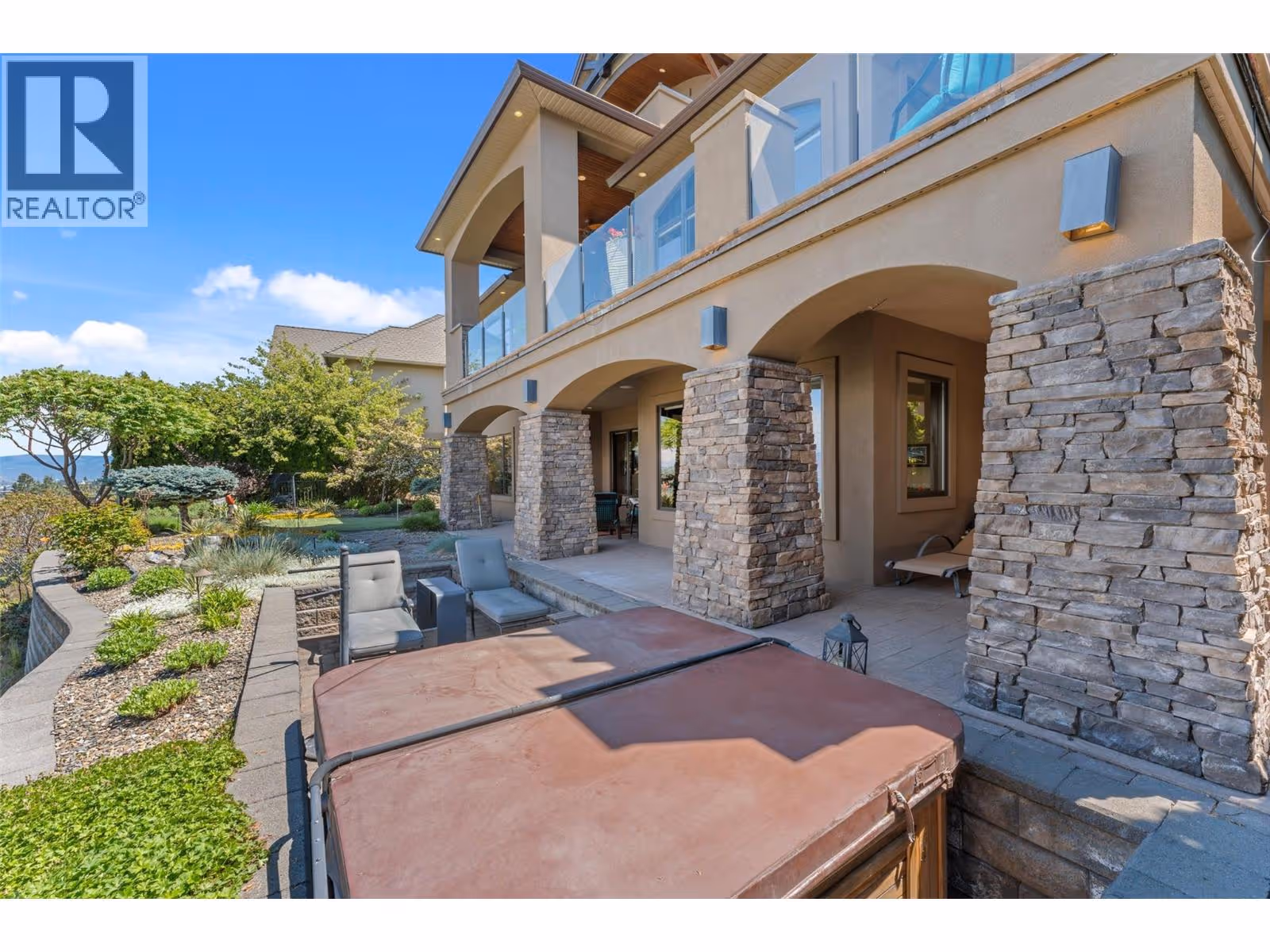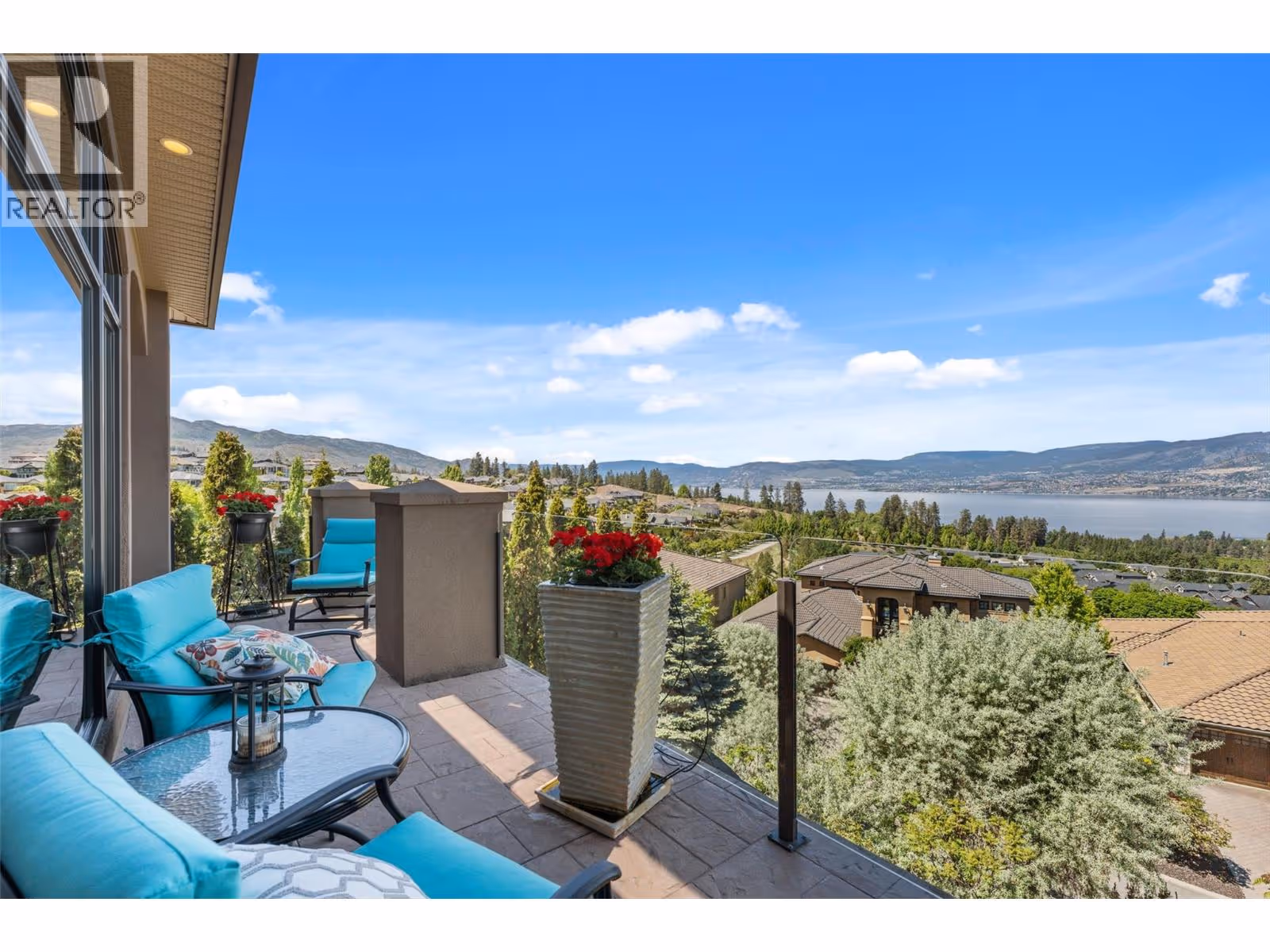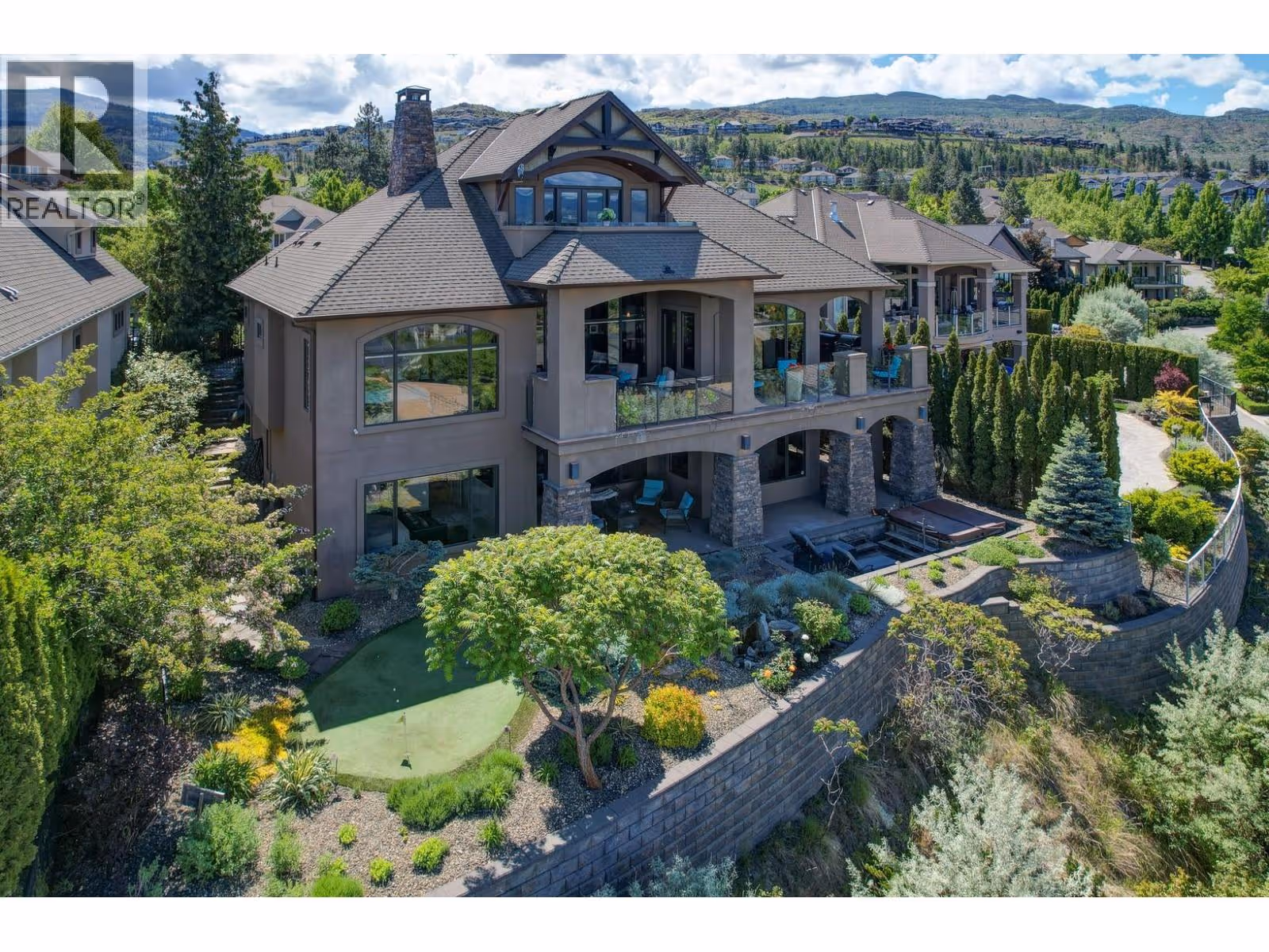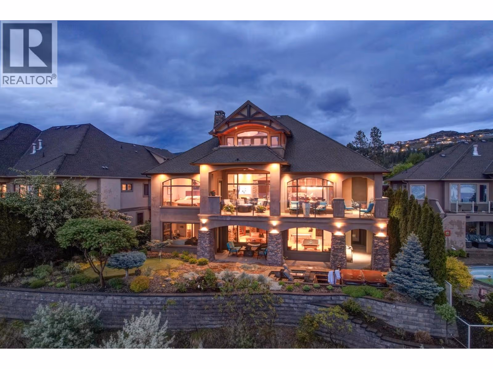 Unrivalled lake views stretch from Bear Creek to Peachland in this breathtaking Upper Mission residence. Showcasing over 5,500 sq. ft. of refined quality construction, this 5-bedroom, 5-bathroom estate is a masterclass in design, comfort, and craftsmanship and boasts lake views from all 3 levels. The main level offers effortless living with a grand great room, a chef-inspired kitchen with Thermador appliances and island seating for six, and a deluxe primary retreat featuring a spa-inspired ensuite with steam shower and private deck access. Automated with Control4 and designed for entertaining, enjoy the panoramic wraparound patio with fireplace above, or head to the lower level where a wet bar, theatre room, and spacious rec area await. Three additional bedrooms, each with ensuite access, open to a covered patio with a putting green, hot tub, tranquil water feature & private backyard. A vaulted loft with private balcony makes the perfect office or artist's escape. Thoughtful touches include a 4-car garage (2 deep), home-wide built-in speakers, and manicured, low-maintenance landscaping. Located only a couple mins from the new Upper Mission Shopping centre. This is lakeview living elevated—privacy, luxury, and lifestyle in perfect harmony. (id:62999)