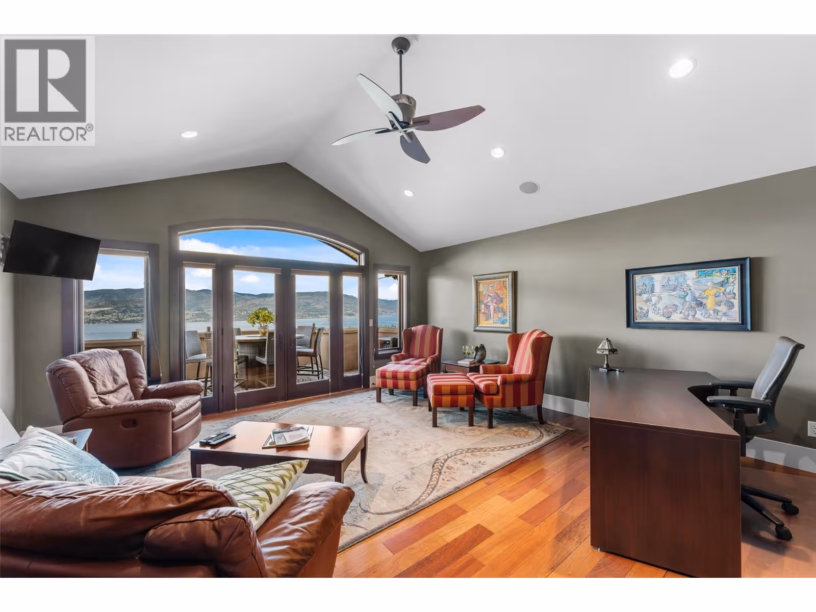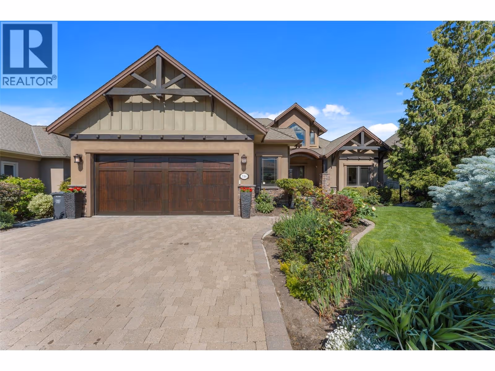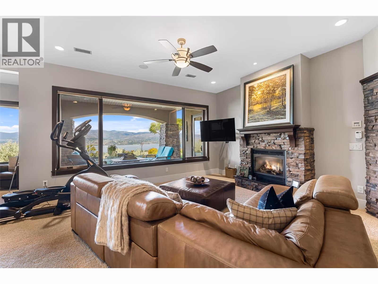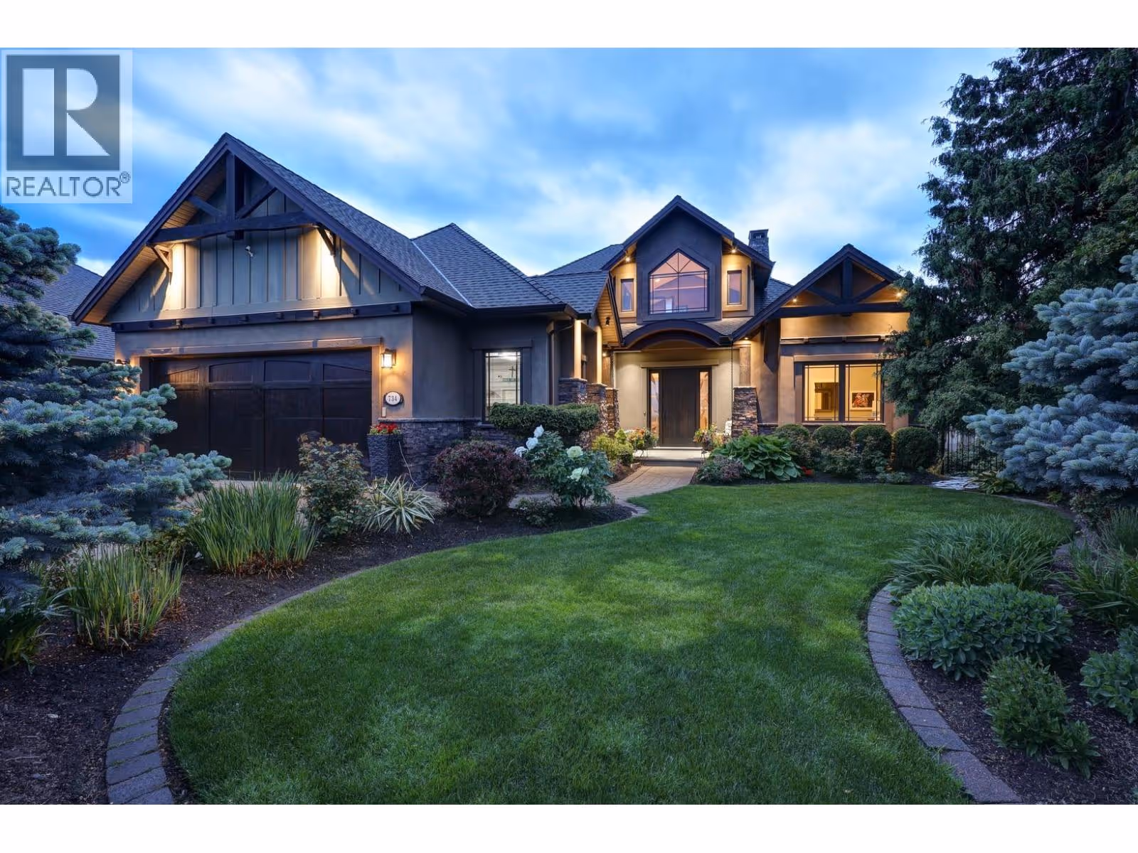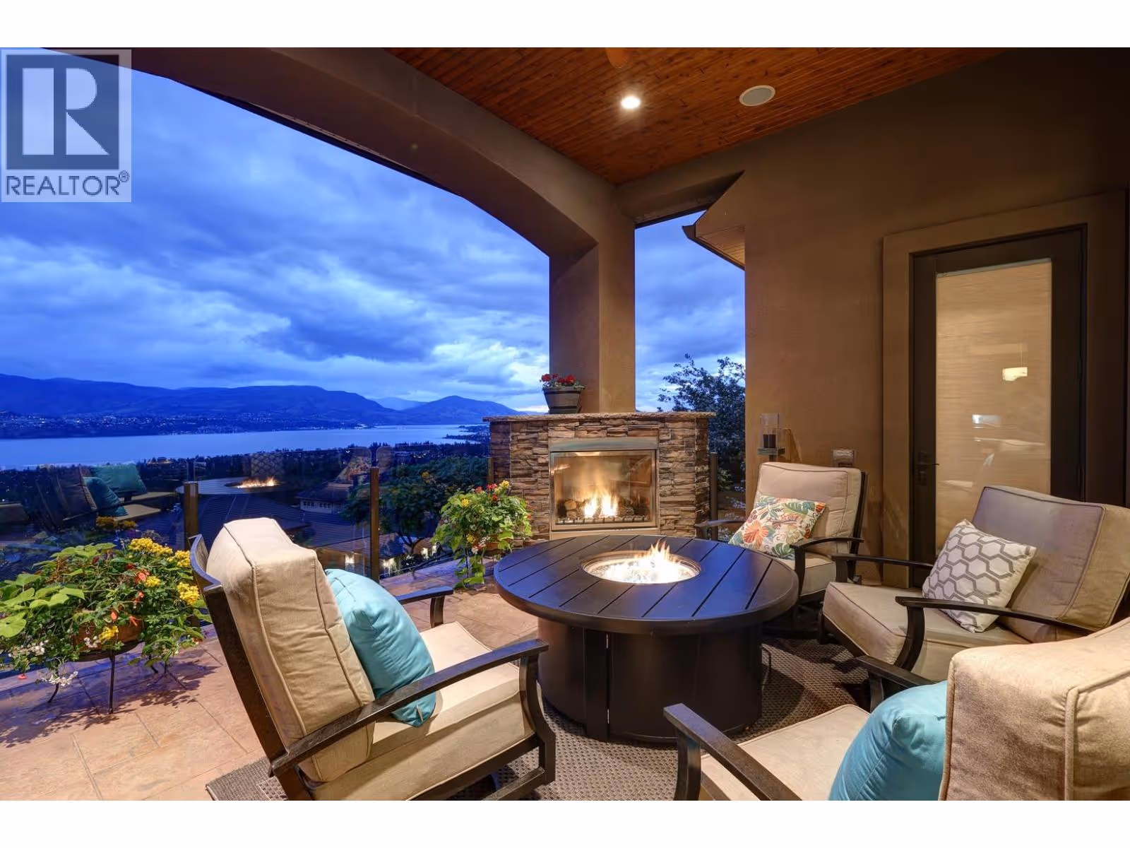 Unrivalled lake views stretch from Bear Creek to Peachland in this breathtaking Upper Mission residence. Showcasing over 5,500 sq. ft. of refined quality construction, this 5-bedroom, 5-bathroom estate is a masterclass in design, comfort, and craftsmanship and boasts lake views from all 3 levels. The main level offers effortless living with a grand great room, a chef-inspired kitchen with Thermador appliances and island seating for six, and a deluxe primary retreat featuring a spa-inspired ensuite with steam shower and private deck access. Automated with Control4 and designed for entertaining, enjoy the panoramic wraparound patio with fireplace above, or head to the lower level where a wet bar, theatre room, and spacious rec area await. Three additional bedrooms, each with ensuite access, open to a covered patio with a putting green, hot tub, tranquil water feature & private backyard. A vaulted loft with private balcony makes the perfect office or artist's escape. Thoughtful touches include a 4-car garage (2 deep), home-wide built-in speakers, and manicured, low-maintenance landscaping. Located only a couple mins from the new Upper Mission Shopping centre. This is lakeview living elevated—privacy, luxury, and lifestyle in perfect harmony. (id:62999)