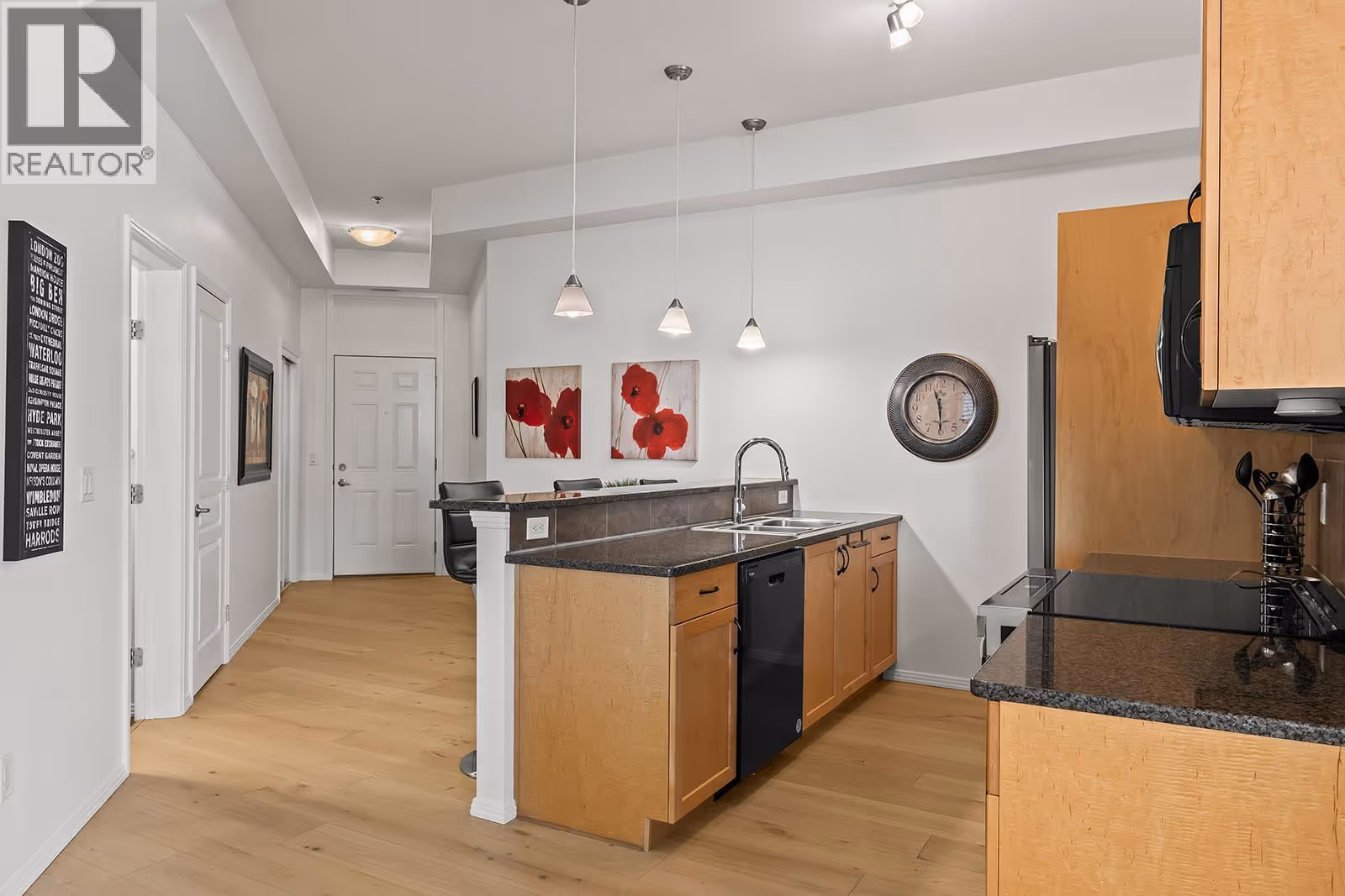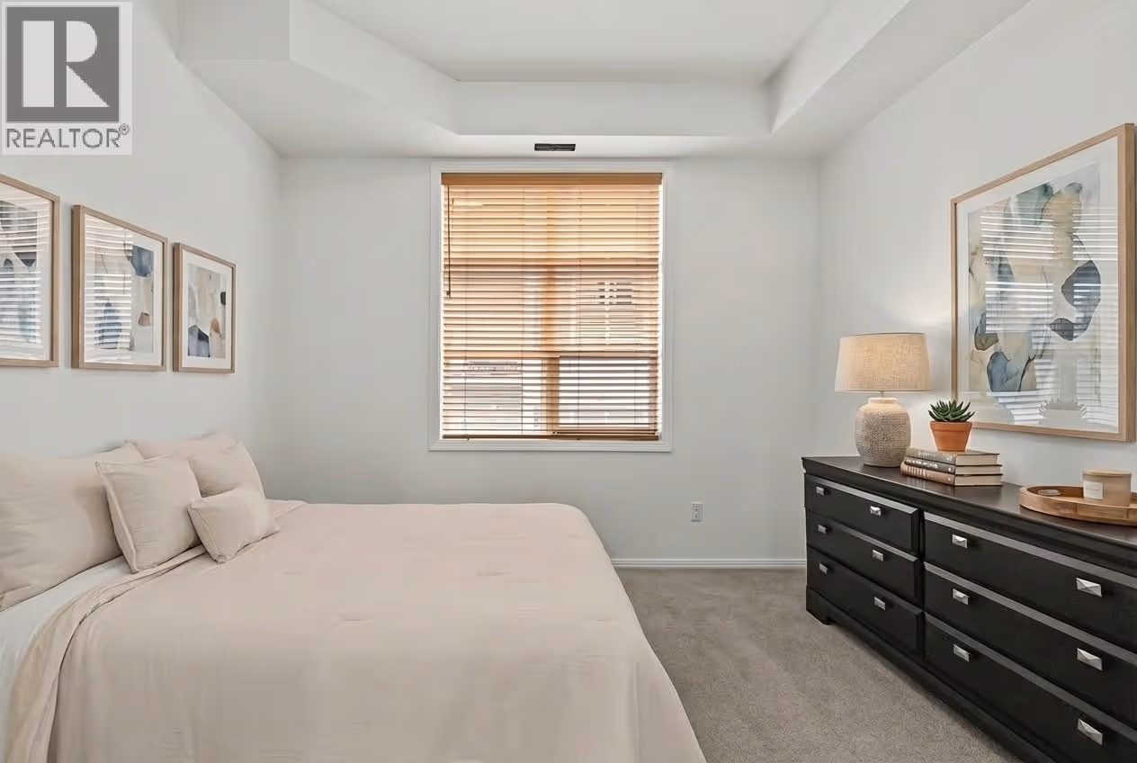 Step into this bright and beautifully upgraded 2-bedroom, 2-bath corner condo offering the perfect blend of comfort, style, and convenience. Soaring 10’ ceilings and large windows flood the space with natural light while framing stunning mountain and city views. The kitchen features granite countertops, a raised eating bar, ample maple cabinetry, and custom-built desk and storage upgrades—ideal for those who work or study from home. Enjoy the warm feel of upgraded hardwood plank flooring and the freshly repainted interior. Well maintained, this condo has a recently replaced furnace, A/C unit, fridge, stove and dishwasher. Relax or entertain on your spacious covered deck complete with a BBQ hook up. Additional perks include extra storage and secure underground parking. Live the vibrant downtown lifestyle—just steps from the lake, trendy restaurants, and boutique shops. This is stylish, affordable urban living at its best! (id:62999)