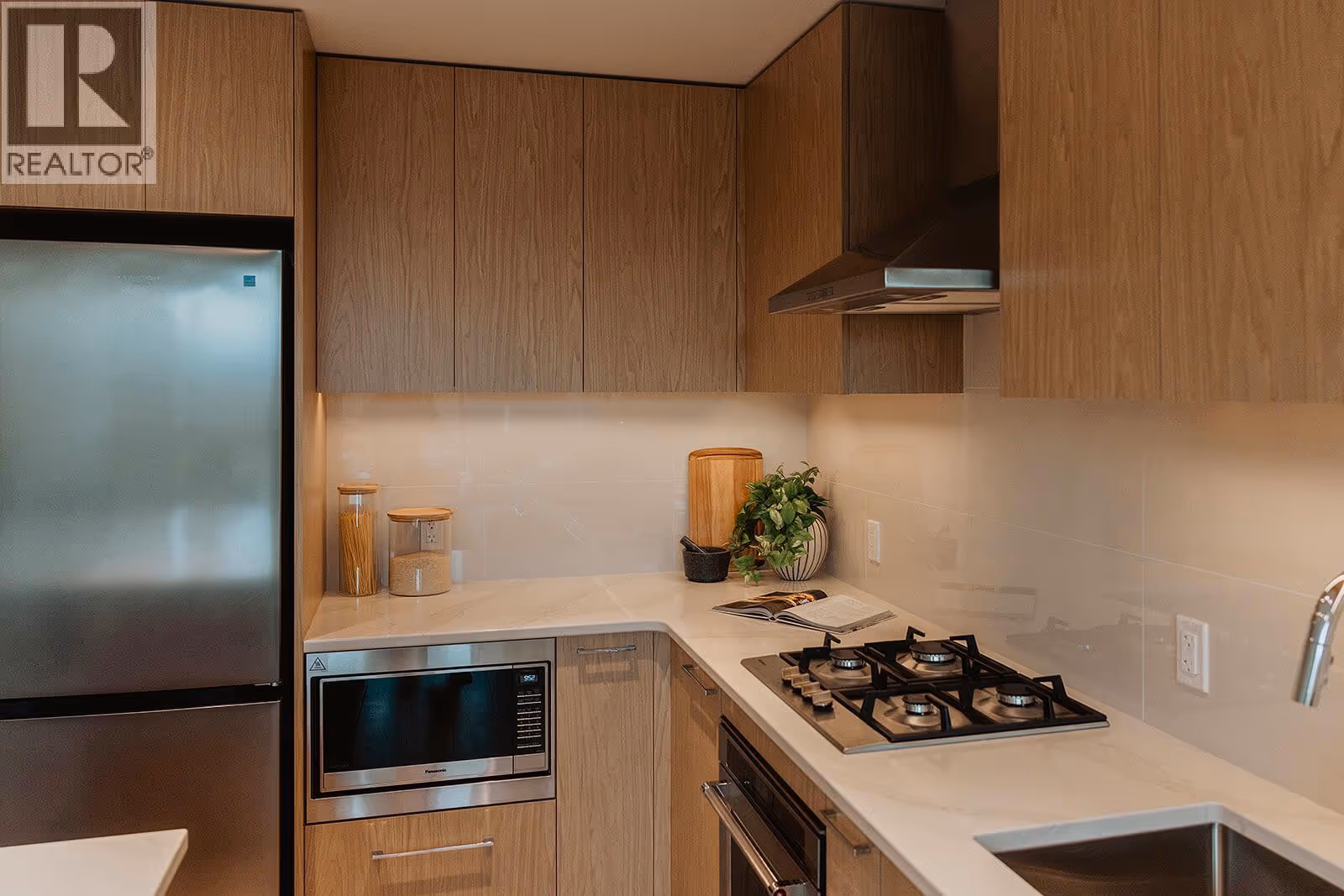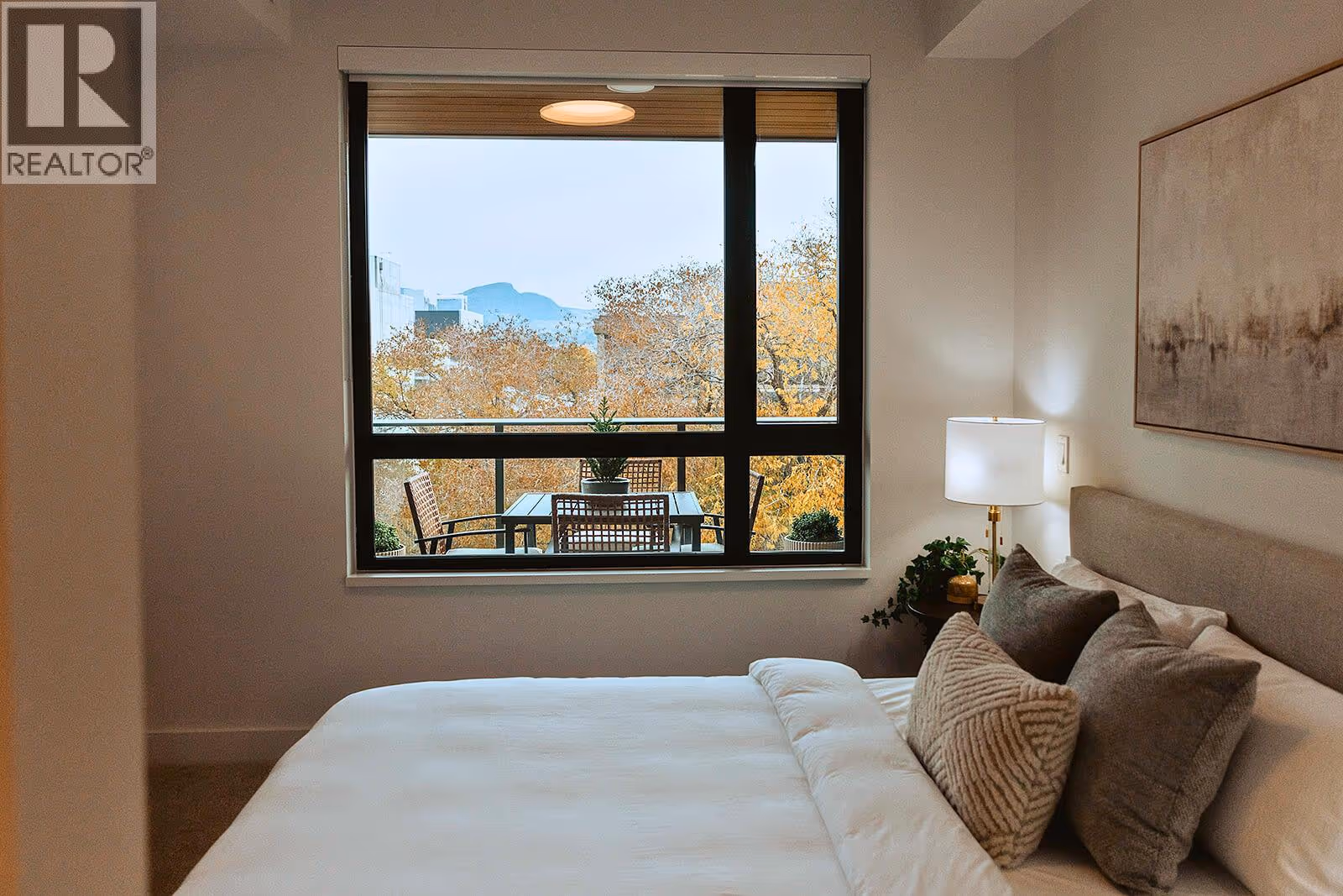 Welcome to ALMA, proudly developed by Mission Group. This bright east-facing 1-bed, 1-bath home offers over 540 sqft of interior space and 100 sqft of exterior space, this home blends thoughtful design with elevated finishes in the heart of the Lower Mission. The modern kitchen showcases flat-panel wood-grain cabinetry, a quartz waterfall dining island and stainless-steel appliances. The open-concept layout is ideal for both daily living and entertaining, highlighted by large windows that invite natural light, durable laminate flooring throughout the main living areas, and woven broadloom carpeting in the bedroom. The primary bedroom features a walk-thru closet, while the spa-inspired ensuite offers large-format tile, a rainfall shower, custom-tiled niche, and soft ambient lighting to create a relaxing, retreat-like atmosphere. Additional features include modern roller shades on every window and individually controlled heating and cooling for comfort in all seasons. Residents can enjoy amenities incl. an 8,000 sqft lakeview terrace w/firepits, BBQs, and community gardens as well as a fully equipped fitness center, dog wash, & bike maintenance station. With a walk score of 93, you’re steps from transit, KGH, shops & restaurants of vibrant Pandosy Village, and beautiful Okanagan Lake. Sqft and room sizes are approximate and may vary. Photos may be of a similar home and layout. This home is newly constructed and move-in ready. Priced well below assessed value of $577,000! (id:62999)