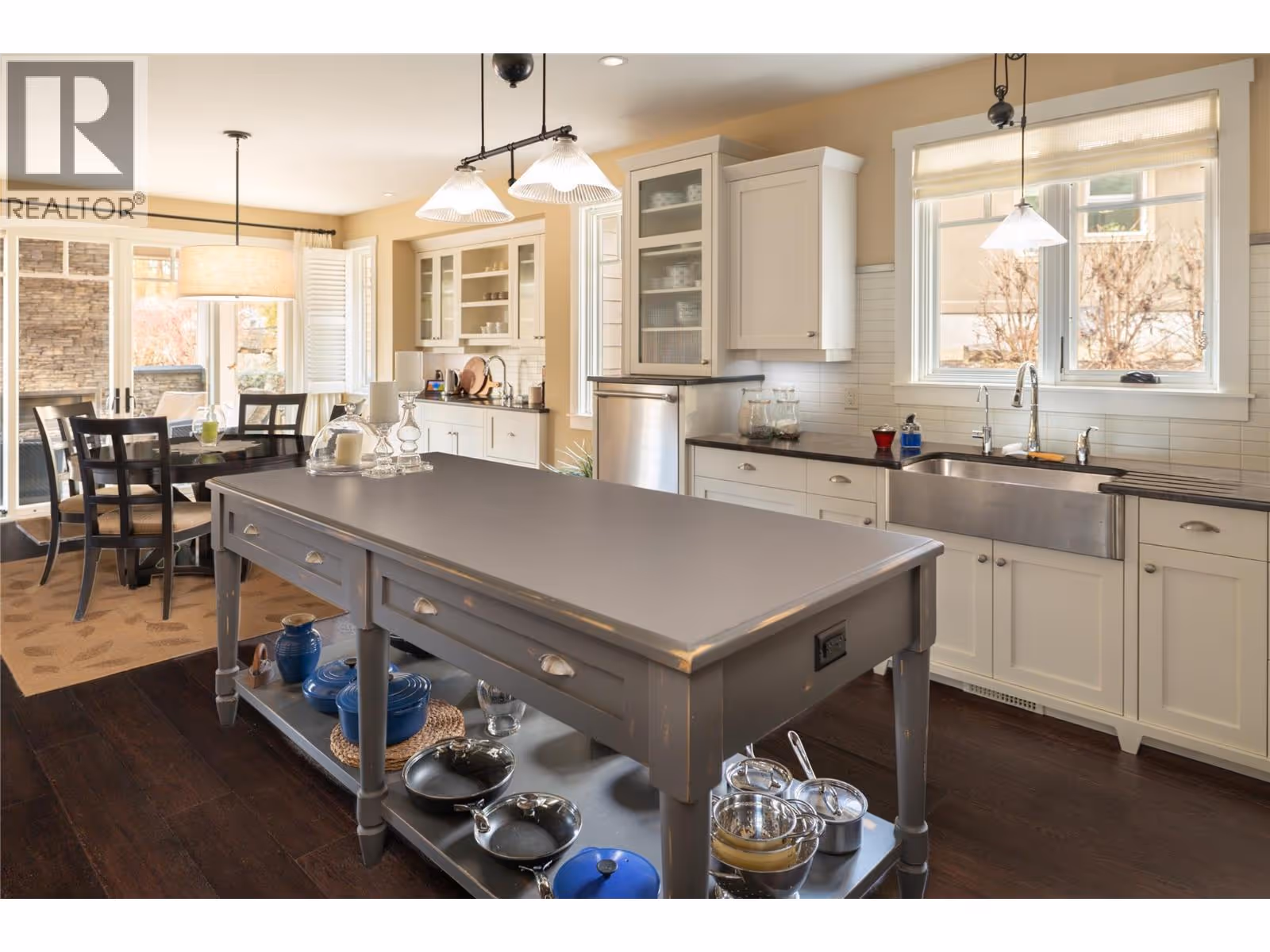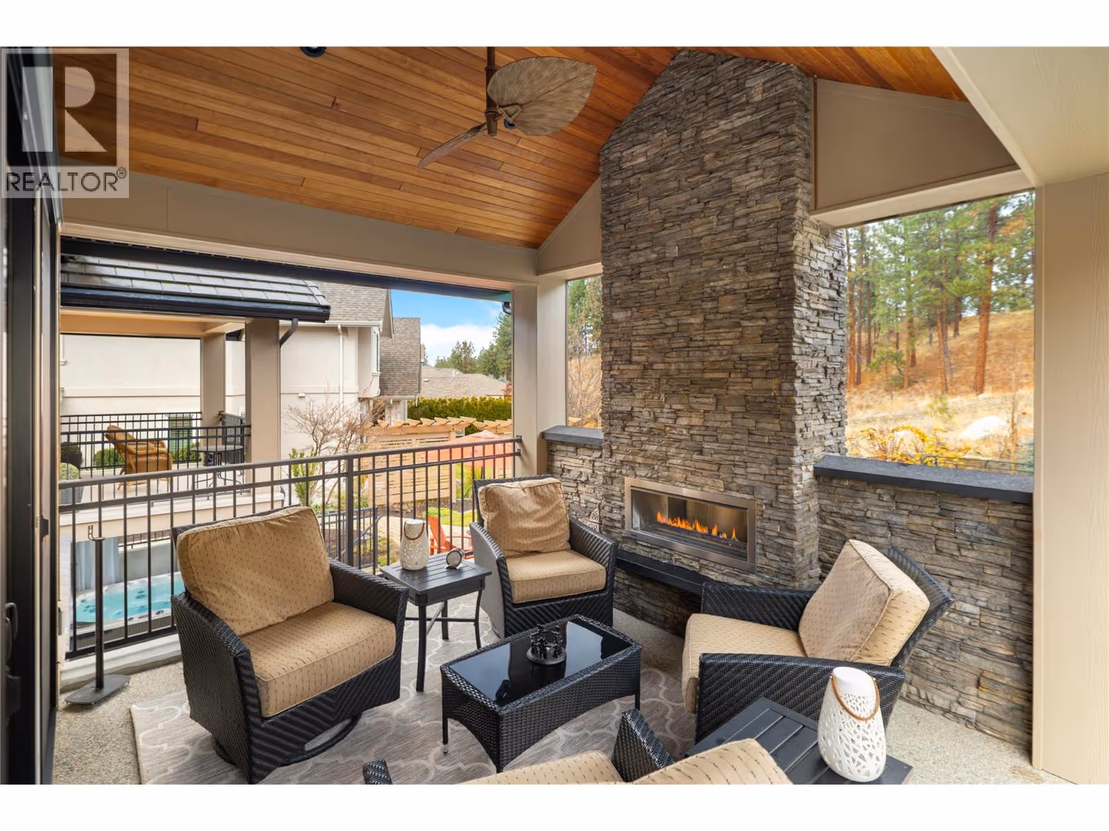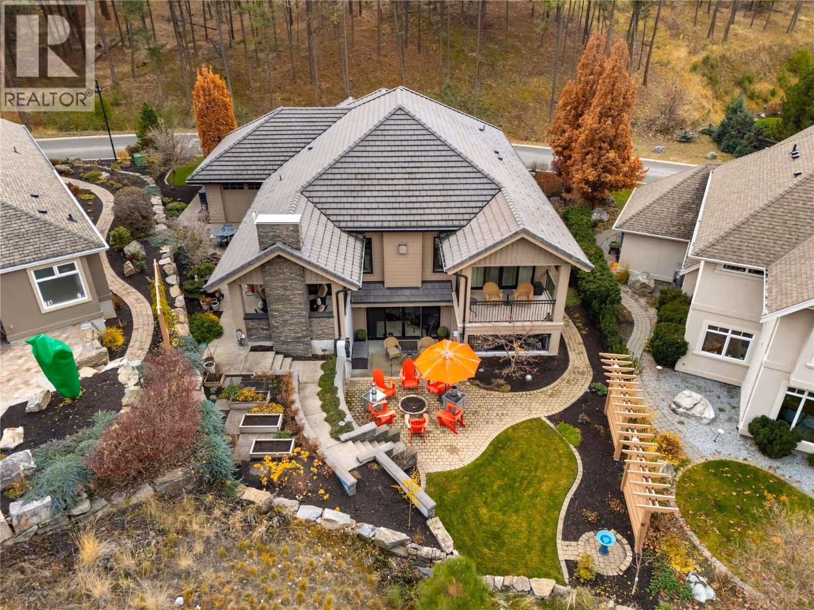 Privately positioned in an exceptionally quiet setting with no neighbours in front or behind, this thoughtfully designed residence is surrounded by mature trees and meticulous landscaping, offering a rare sense of seclusion. Built with longevity and quality in mind, the FireSmart Hardie Board exterior, concrete tile roof, Loewen windows, and handcrafted fir front door set the tone for the level of finish carried throughout. Engineered hardwood flooring, solid core doors, and all-wood casings create a cohesive, timeless interior. The kitchen is the heart of the home, featuring Brazilian soapstone countertops, solid maple cabinetry, an expansive custom island, six-burner gas range, Thermador appliance package, and a dedicated beverage centre. Indoor-outdoor living is seamless with a covered upper deck complete with gas fireplace and BBQ hookup. The walk-out lower level offers impressive ceiling heights, a custom wet bar, gas fireplace, theatre room, and access to a private patio with Beachcomber hot tub and Restoration Hardware fire bowl. A hybrid heat pump/gas furnace, EV-ready 3 car garage, grade-level windows, and thoughtful accessibility features further enhance this exceptional home designed for comfort, privacy, and everyday enjoyment. Set within the prestigious Gallaghers Canyon community, residents enjoy an unmatched lifestyle with world-class golf, scenic walking trails, and a strong sense of community—just minutes from Kelowna’s amenities. A rare combination of privacy, craftsmanship, and lifestyle — this is a must-see to be fully appreciated. (id:62999)
