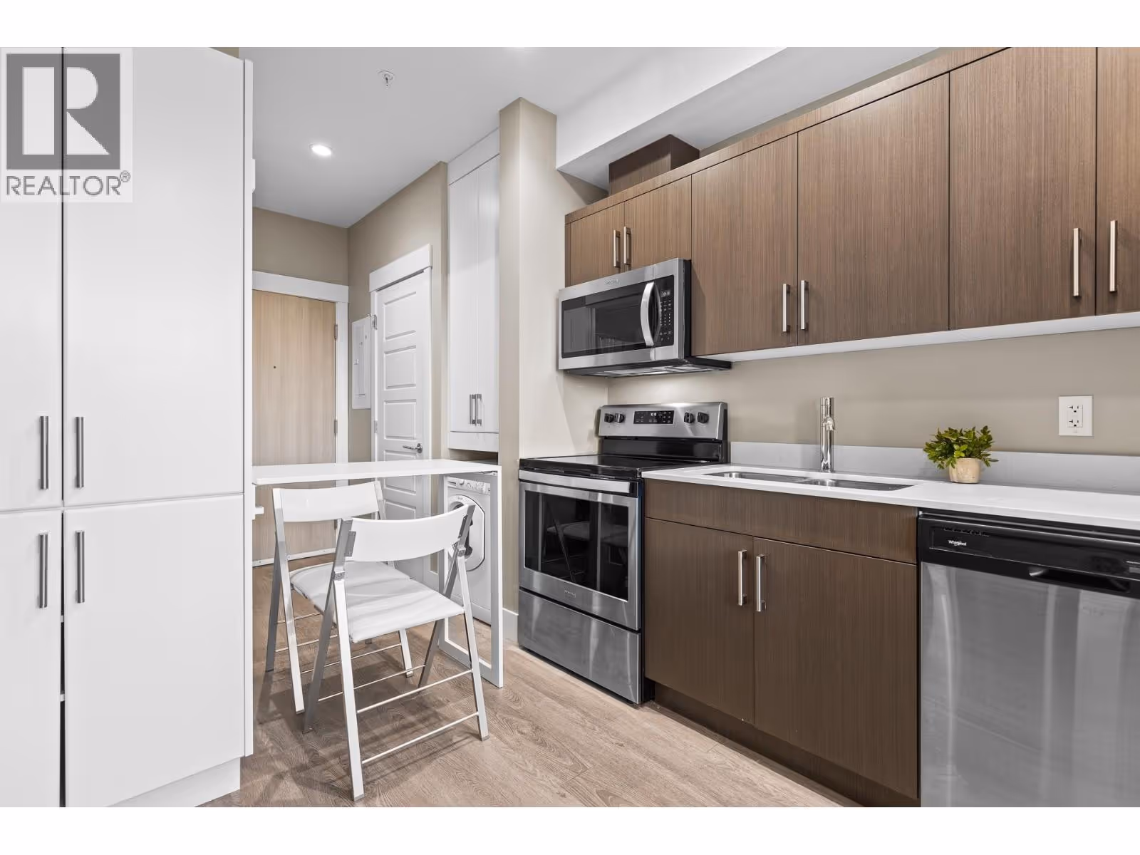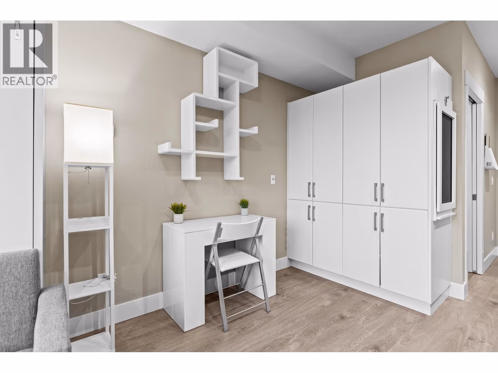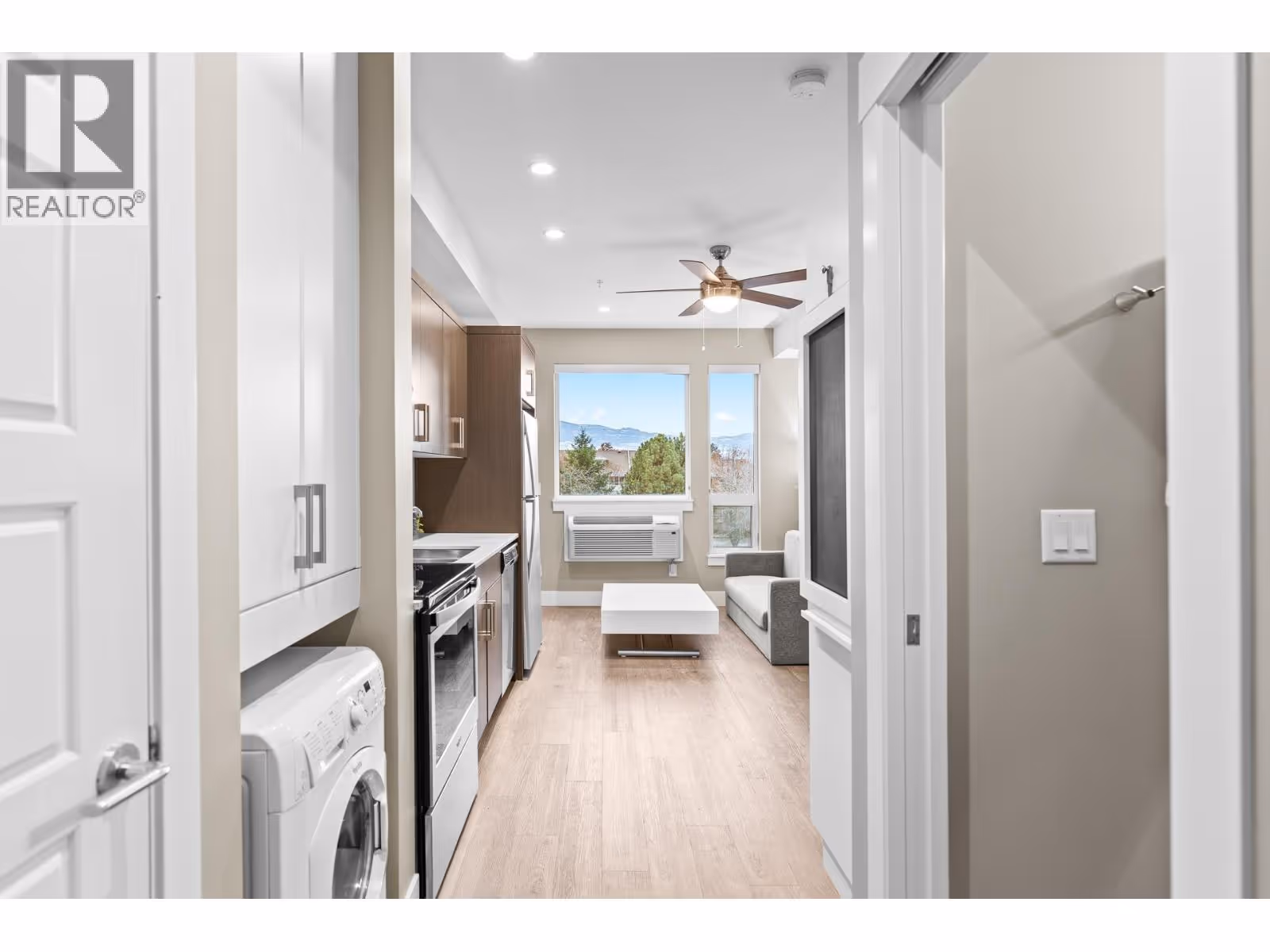 Welcome to Cambridge House - offering exceptional urban convenience in the heart of Kelowna. This 319 sq ft south-facing micro suite has been thoughtfully upgraded to maximize function and comfort featuring a custom Murphy Bed and built-in storage. The home is freshly painted and offered fully furnished, including sofa, TV, standing lamps, desk, chairs, and more, providing a turnkey living opportunity for owners or investors. The efficient layout includes stainless steel appliances, durable vinyl plank flooring, an in-suite washer/dryer, a 3-piece bathroom, and an in-wall heat pump/AC unit for year-round climate control. A covered parking stall and convenient same-floor 3' x 4' storage locker are included. Residents of Cambridge House enjoy an impressive selection of amenities, including a fully equipped fitness centre, residents’ lounge with games and seating areas and a landscaped garden terrace with BBQ area. The building is also pet-friendly (up to two pets, max 25 lbs each). Located steps from downtown, transit, and everyday amenities, this property appeals to first-time buyers, students, and investors seeking low-maintenance living in a central location. (id:62999)