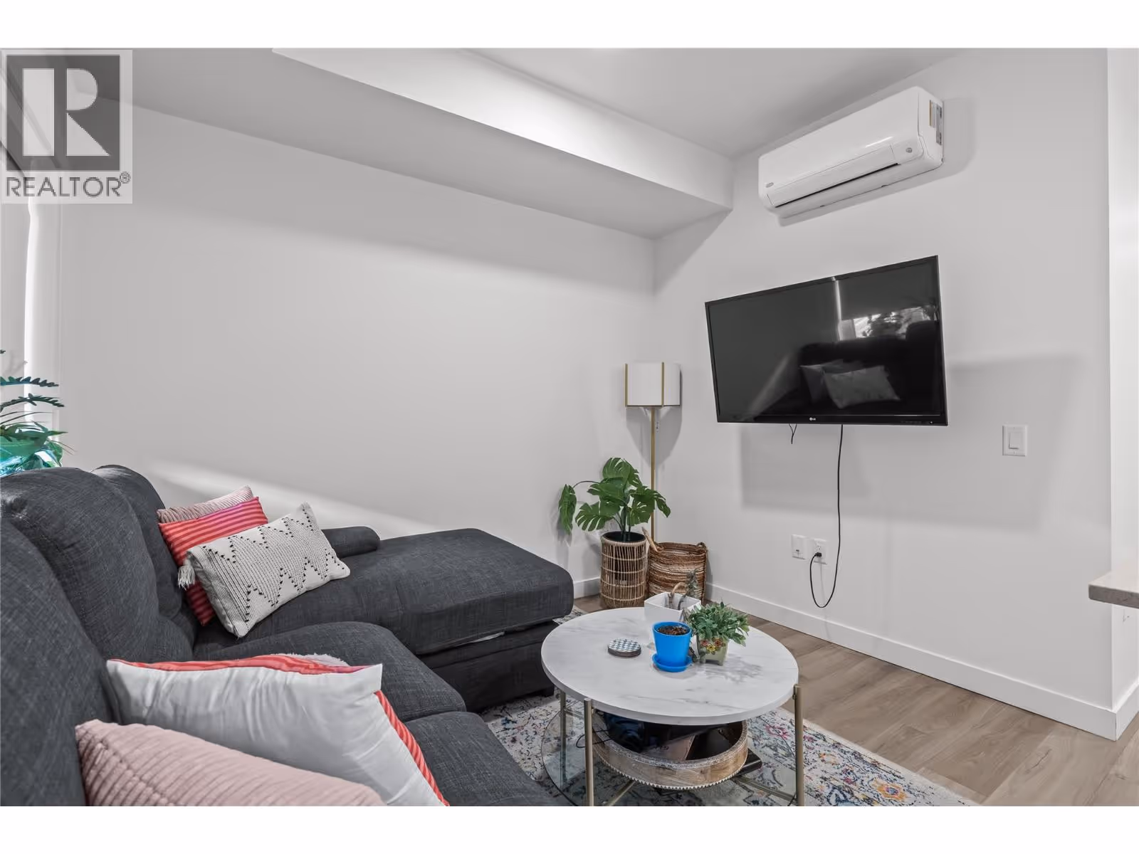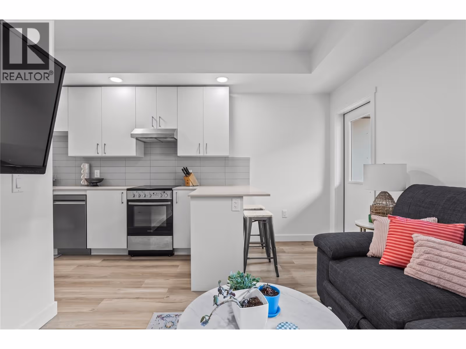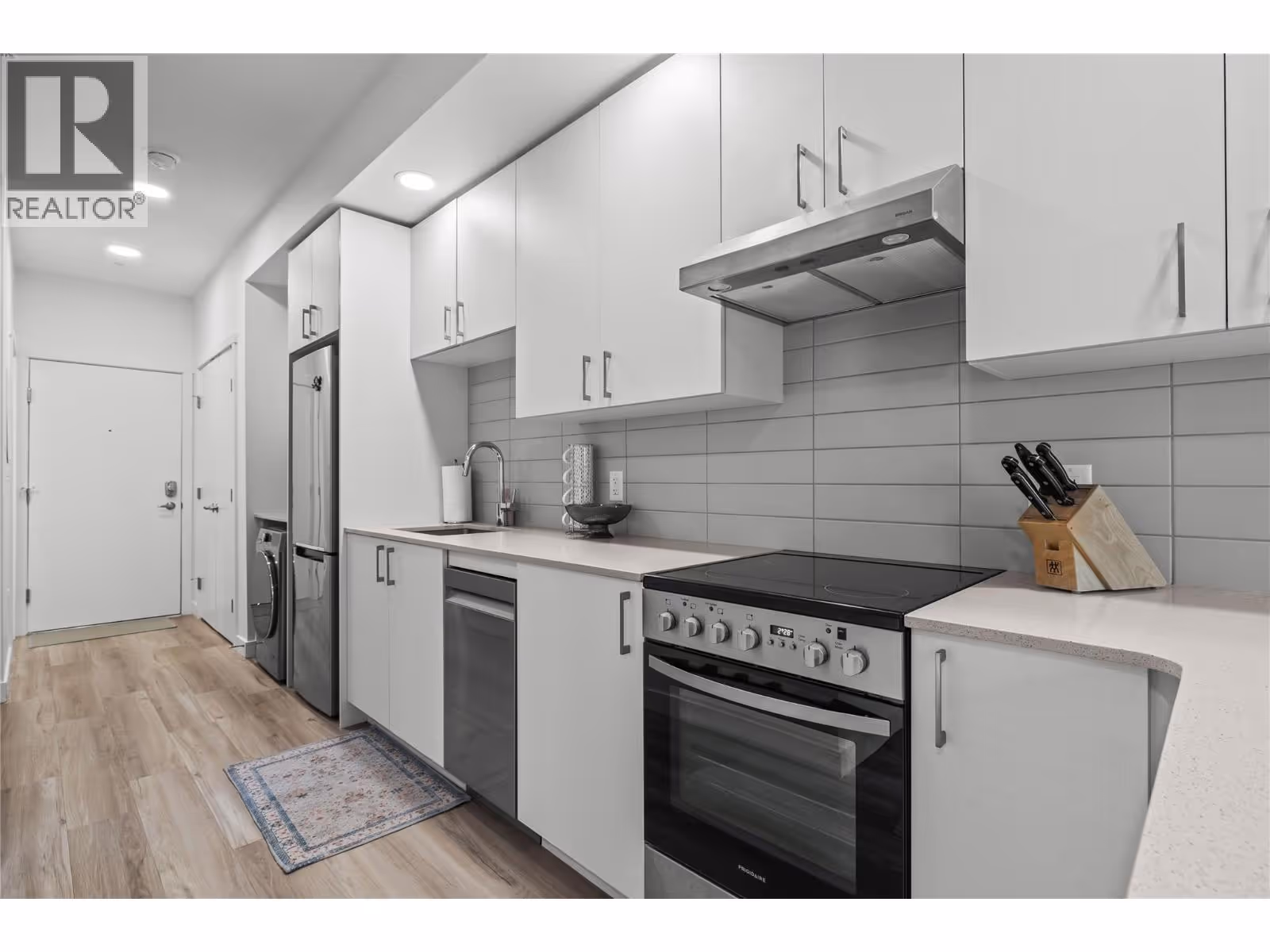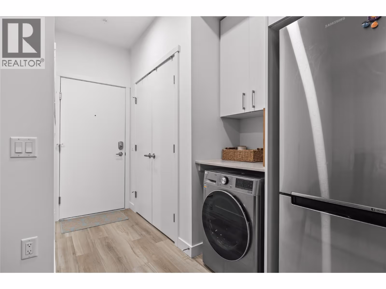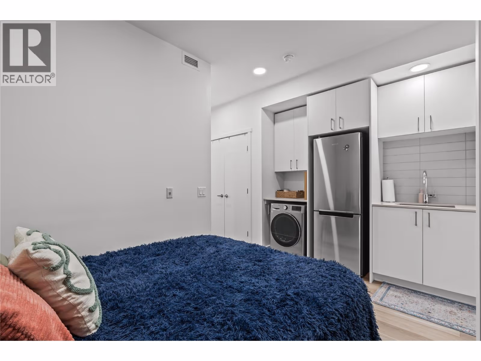 406 sqft studio at Ascent, in Kelowna's Upper Mission feels more like a one-bedroom condo, where the bedroom space is separate from the living area. Approximately 406 sq ft, this studio condo blends open living with thoughtful separation, where the sleeping area is offset from the main space for added privacy. Vinyl plank floors anchor the bright interior, while the kitchen features stainless steel appliances, an L-shaped quartz countertop, and bar seating that connects naturally to the living area. Clean lines, modern finishes, and a comfortable flow make the most of every square foot, with in-home laundry adding everyday ease. Step out from the living space to a nicely sized patio, ideal for quiet mornings or winding down in the evening. One surface parking stall is included, and residents enjoy access to a well-equipped community centre with a gym, lounge, games area, and kitchen for social gatherings, plus No GST! Set in sought-after Upper Mission, this location sits directly across from Mission Village at the Ponds, offering Save-On-Foods, Shoppers Drug Mart, Starbucks, Bosleys, and more just steps away. A great fit for first-time buyers or downsizers seeking low-maintenance condo living in a connected, amenity-rich community. (id:62999)
