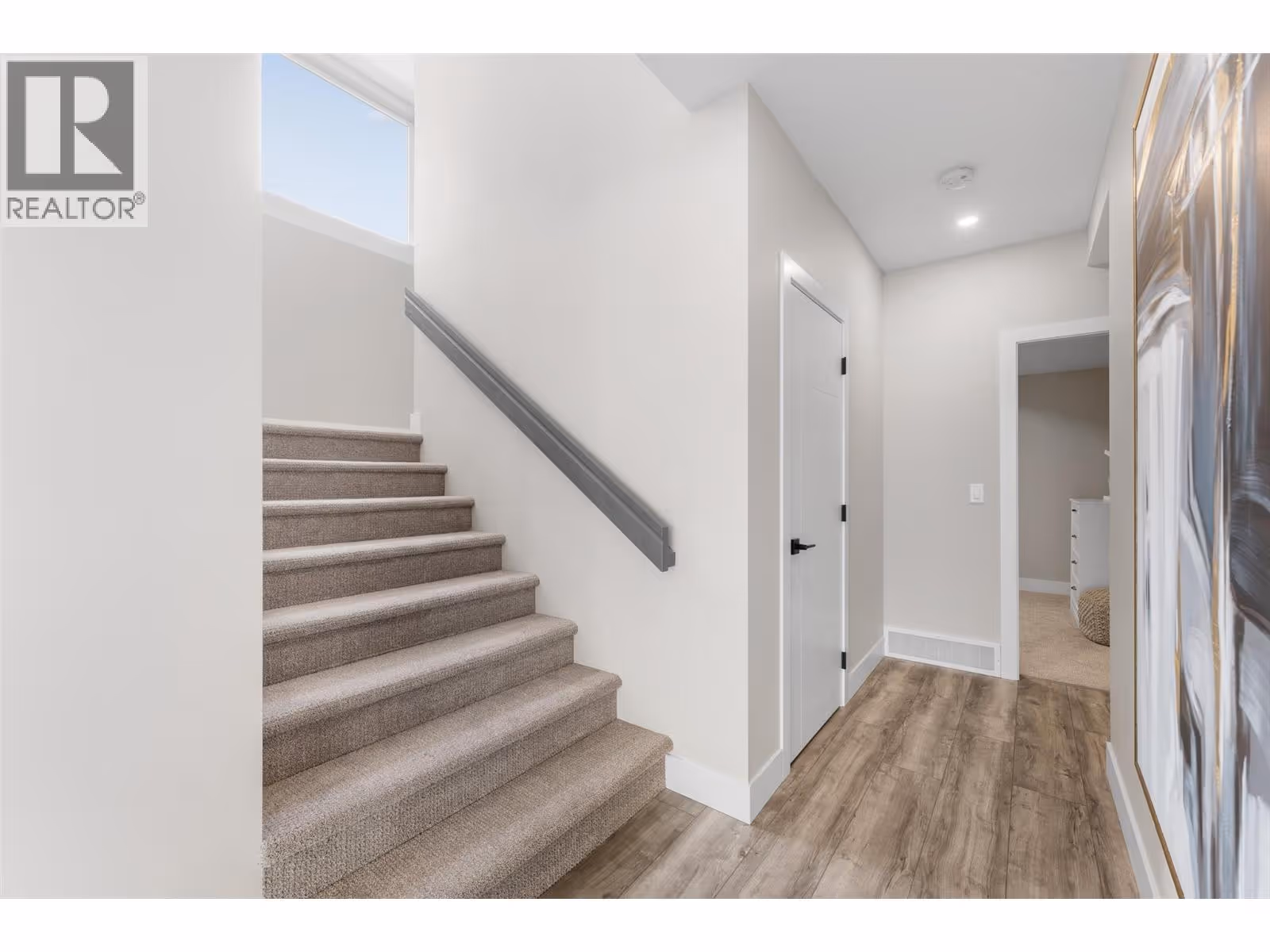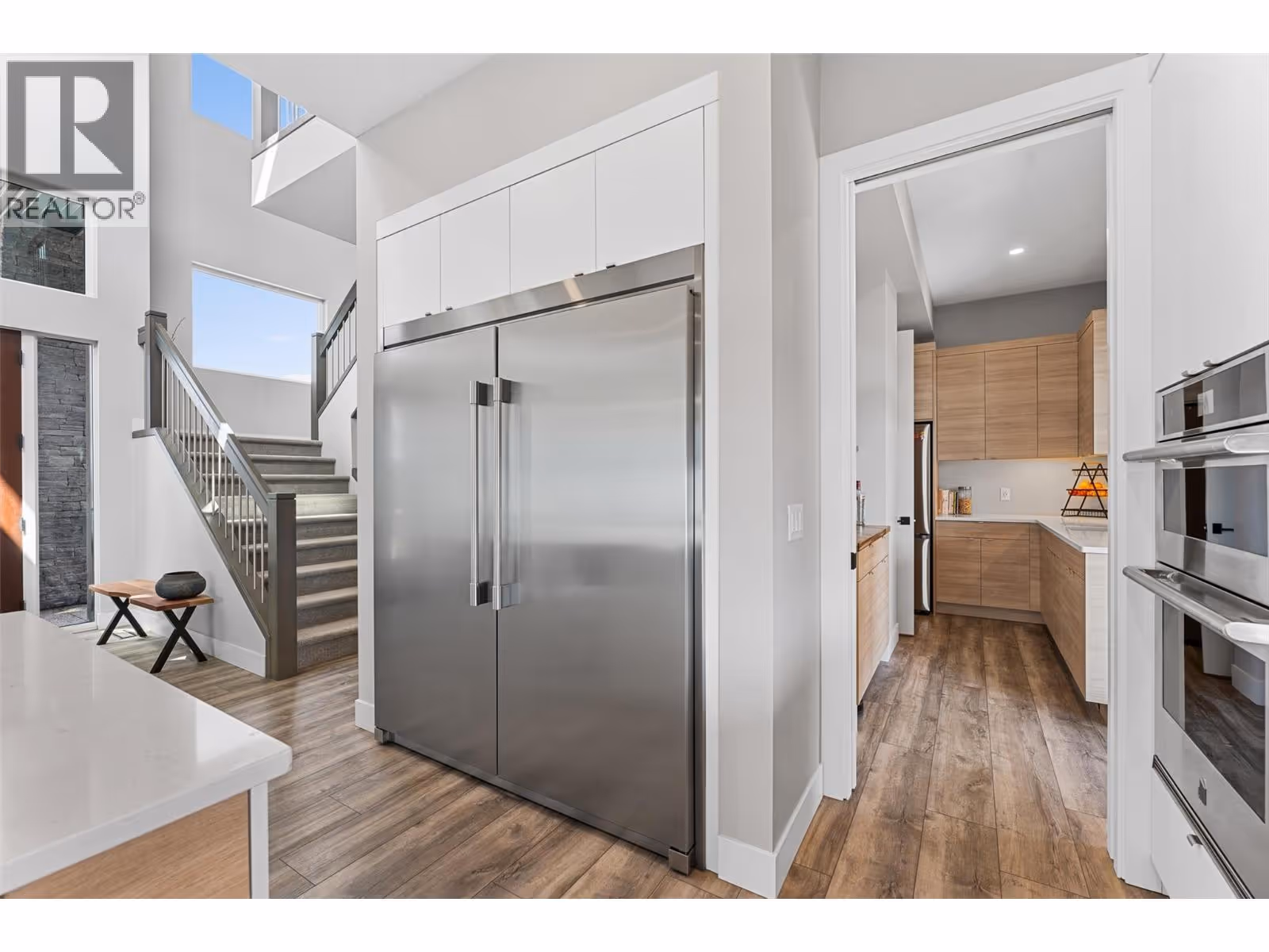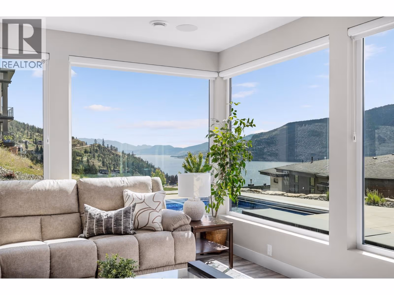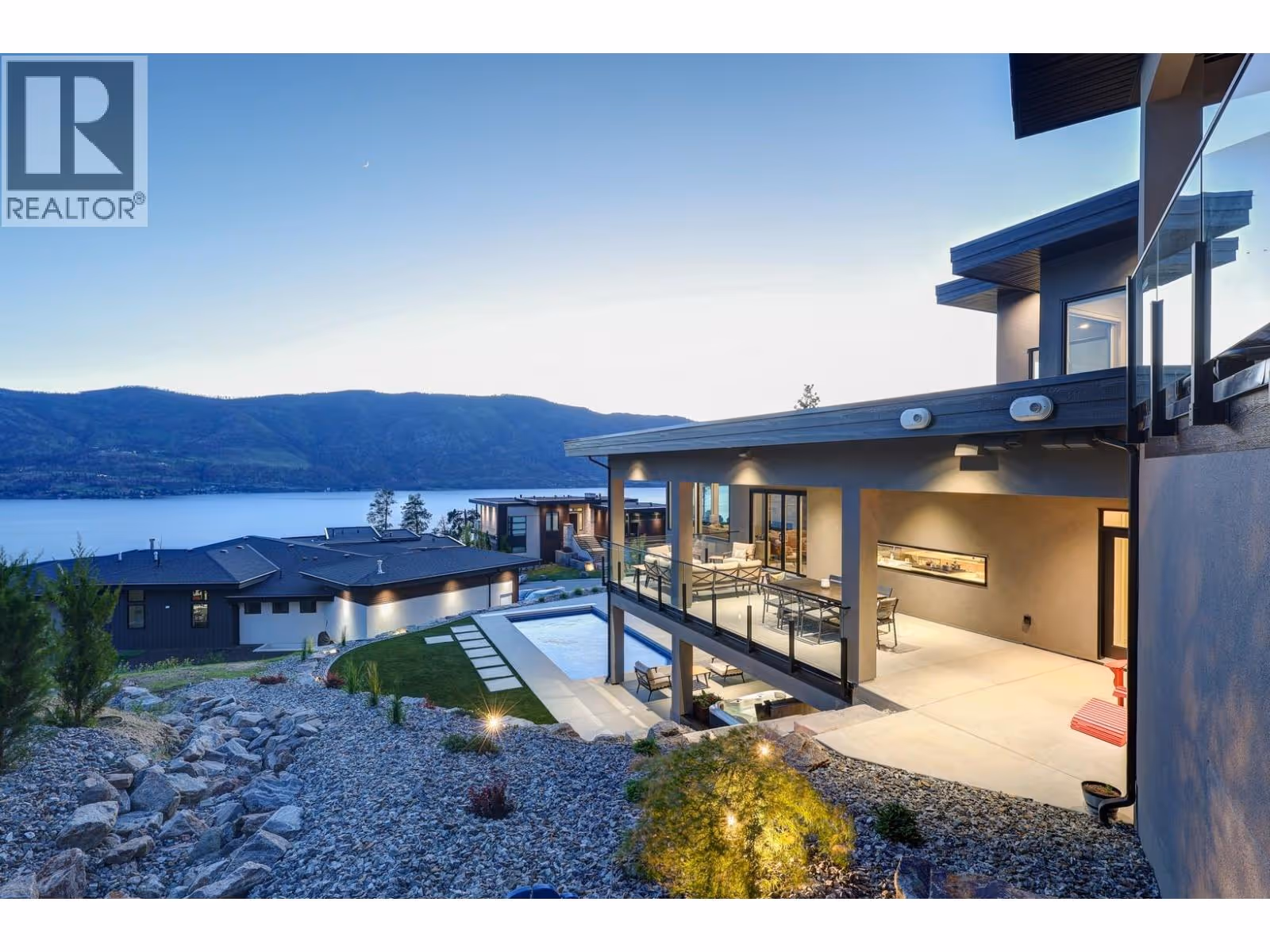 Gorgeous modern home in McKinley Beach where elevated Okanagan living meets thoughtful design & panoramic lake views. Situated on a rare 0.374-acre lot, this estate boasts a spacious family layout with resort-style amenities, expansive indoor-outdoor living, & a self-contained 2 bed/1 bath legal suite. The main level impresses with soaring ceilings, a chef’s kitchen featuring JennAir appliances, a massive island, & a seamless connection to the covered deck—perfect for al fresco dining. The luxurious primary suite enjoys sweeping lake &valley views, a spa-inspired ensuite, & a walk-through dressing room. A bright office, large pantry, powder room, & laundry complete this level. Downstairs, entertain in style with a rec room, wet bar with pass-through windows, wine cellar, & direct walkout access to the backyard oasis, featuring a heated saltwater pool, hot tub, & built-in firepit. Three additional beds & two baths offer flexibility. Upstairs, a versatile loft space is ideal for a home office or gym. The legal suite offers privacy & comfort with a separate deck, laundry, & private entrance. A highlight of this home is the 1300+ sq ft garage with cabinets, separate heat, & hard wired for network. Located minutes from the marina, airport, UBCO, wineries, & golf. Residents enjoy exclusive access to McKinley’s amenity centre with gym, pool, hot tub, pickleball, & more. This is a rare opportunity to own one of the most versatile & beautifully appointed homes in McKinley Beach. (id:62999)