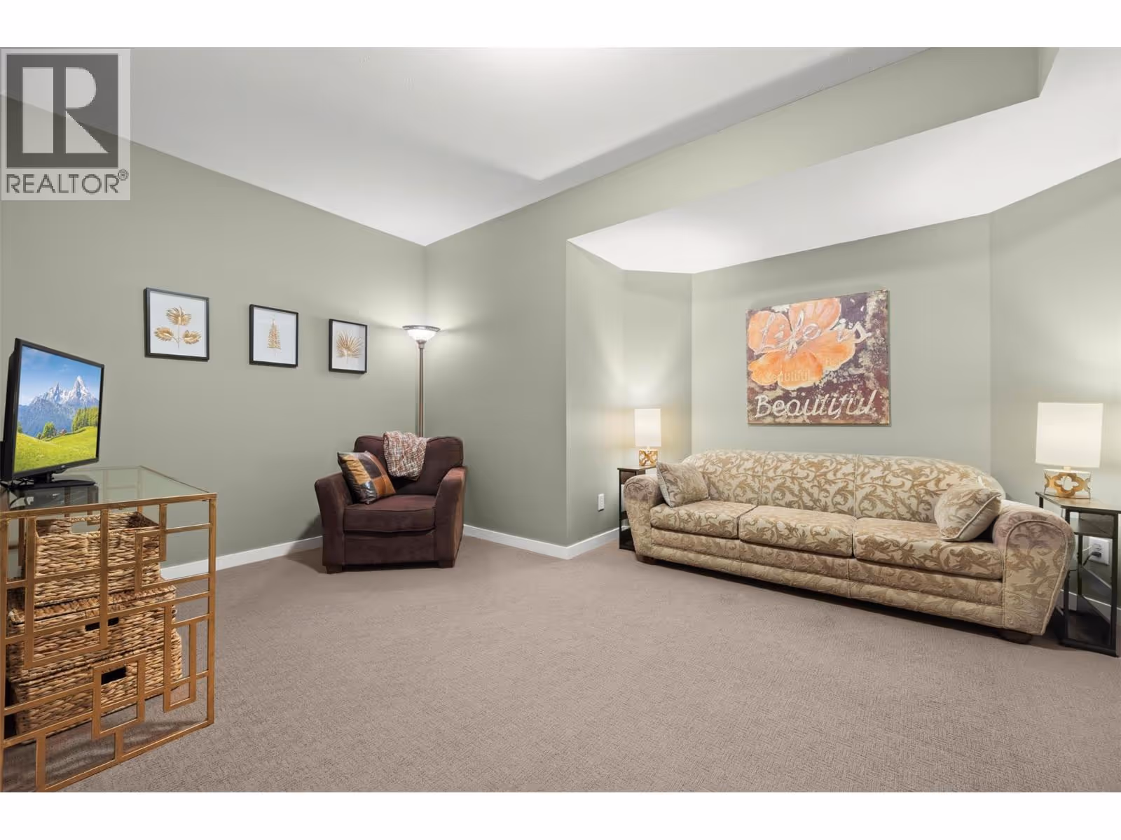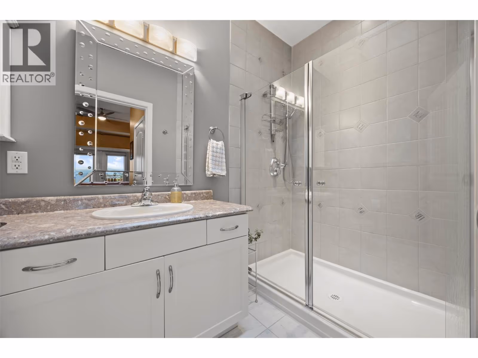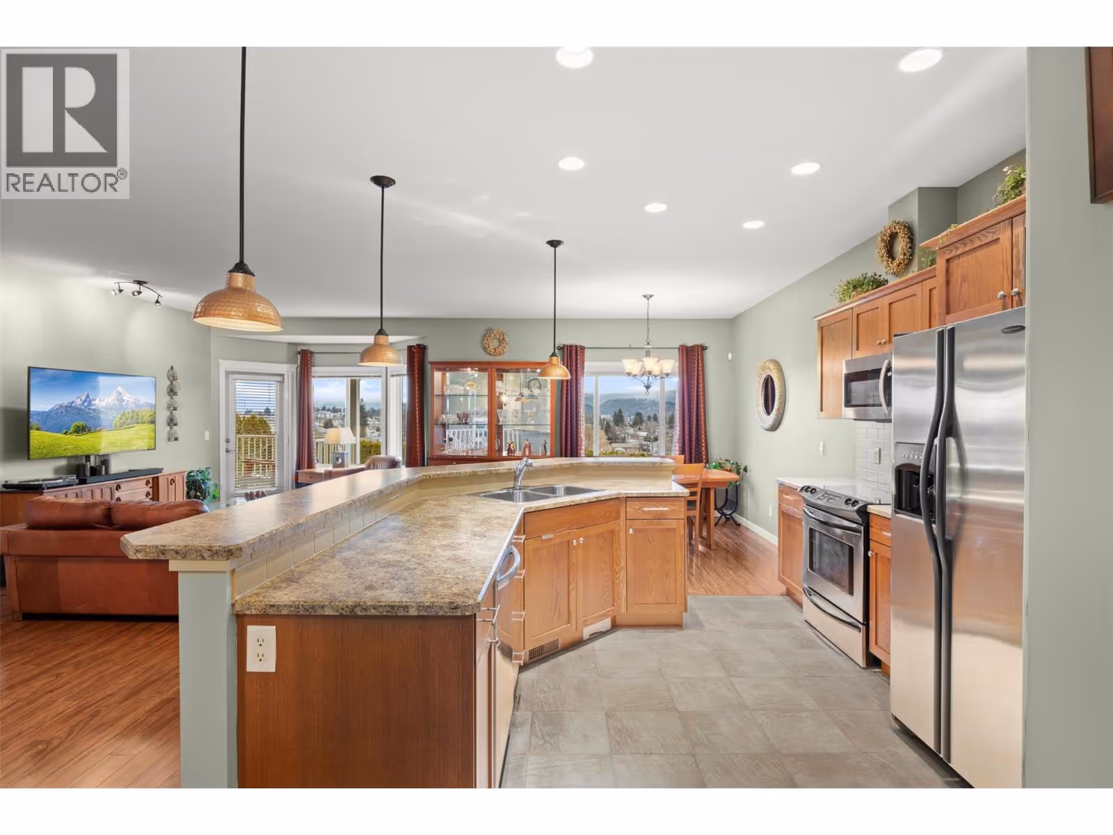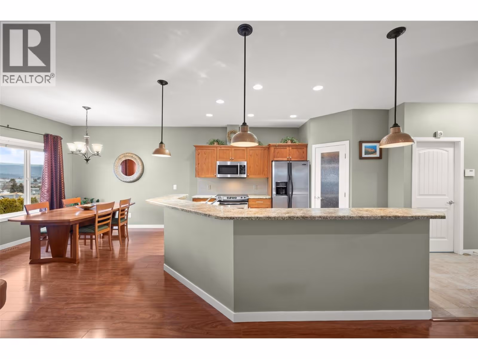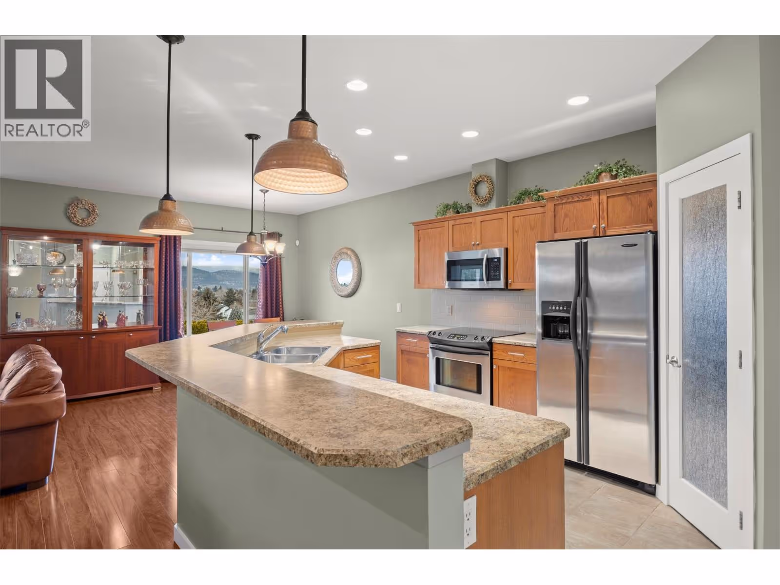 Walkout rancher half-duplex in The Ridge offering mountain views and a spacious 2,700+ sq ft layout with 4 bedrooms, 3 bathrooms, and potential for a 5th bedroom. Flat driveway parking for two plus an oversized double garage with an 18’ door. The open-concept main level features a bright kitchen, dining, and living area that opens to a covered view deck with gas BBQ hookup. The main floor also includes a primary suite with ensuite and walk-in closet, a guest bedroom or office, full bath, pantry and laundry. The fully finished walkout level offers generous family and recreation space, an additional guest bedroom, full bath, office/den, and a private patio with landscaped yard. Pet-friendly (2 pets: one dog + one cat, or two dogs or two cats - no size restrictions), no age restrictions, and quick possession available. Ideally located within 400 m of transit and under 1 km to schools, the YMCA, shopping, parks, trails, and the Big White shuttle, with easy access to UBCO and the airport. (id:62999)