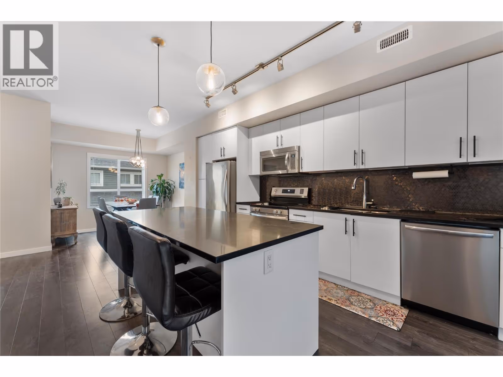 Welcome to this stunning townhome located in Kelowna’s highly desirable Brighton community, offering a perfect blend of modern design, functionality, and comfort. The main floor features a spacious dining area flowing seamlessly into the heart of the home, the kitchen. Here you’ll find a large sit up island with elegant lighting, new stainless steel appliances, and generous counter and storage space with new countertops and backsplash. Perfect for preparing meals, entertaining, or enjoying casual dining. The open living room is filled with natural light and features a cozy fireplace along with direct walk out access to your private backyard patio. With a gas BBQ hookup, privacy fencing, and green space, it’s the perfect spot to relax, entertain, or let kids and pets play safely. This home offers three bedrooms and 2.5 baths. The upper level features a luxurious primary suite with a walk through closet leading to a spa inspired 4 piece ensuite, complete with double vanities and a walk in shower. Two additional bedrooms provide space for family, guests, or a home office, ensuring comfort and flexibility for any lifestyle. Additional features include brand new carpet, a double attached tandem garage with a bump out and storage closet, offering plenty of room for vehicles and storage. Located in Lower Mission, this townhome is just minutes from schools, restaurants, shopping, hiking trails, and a wide variety of recreational opportunities, making it easy to enjoy everything Kelowna has to offer. Walking distance to Hobson Beach, H20 Centre, and transit stops. With thoughtful design, modern finishes, and private outdoor space, this Brighton townhome delivers a seamless combination of style, functionality, and convenience. Whether you’re entertaining in the kitchen, relaxing on the patio, or spending cozy evenings in the living room, this home provides the perfect setting for everyday living and memorable gatherings alike. (id:62999)