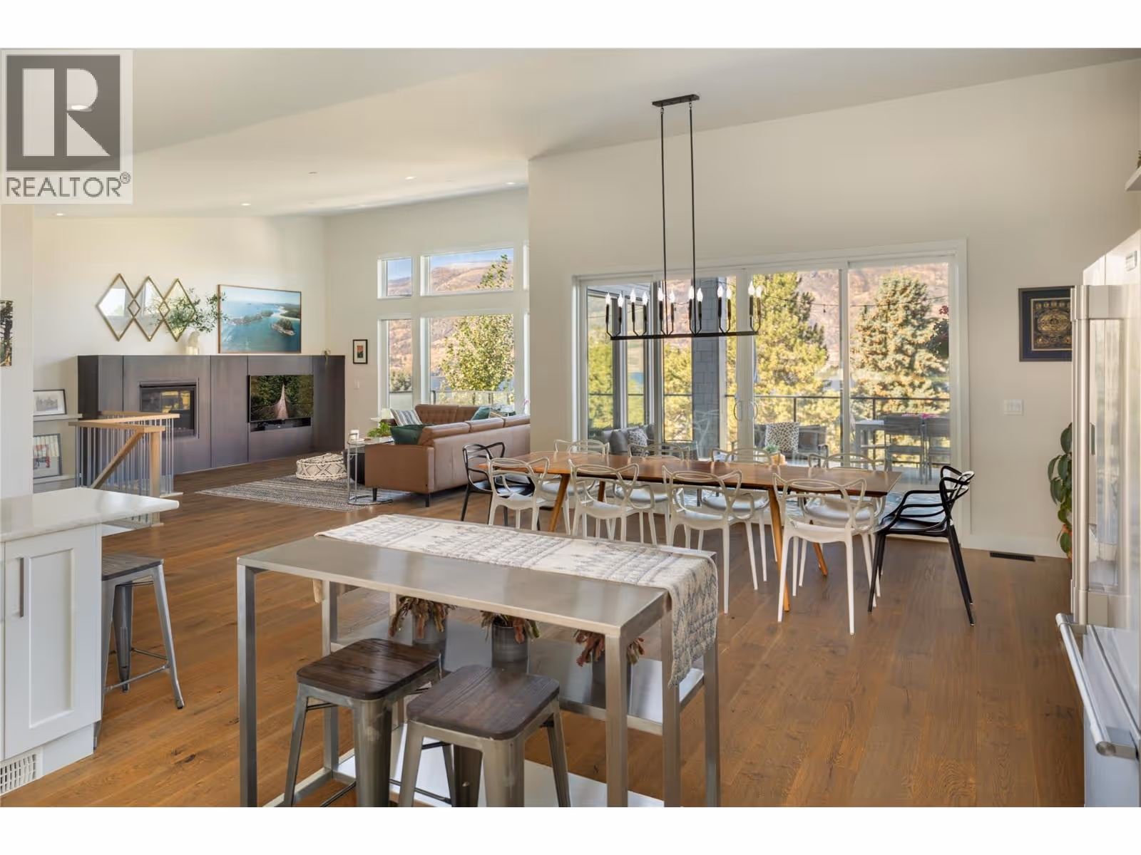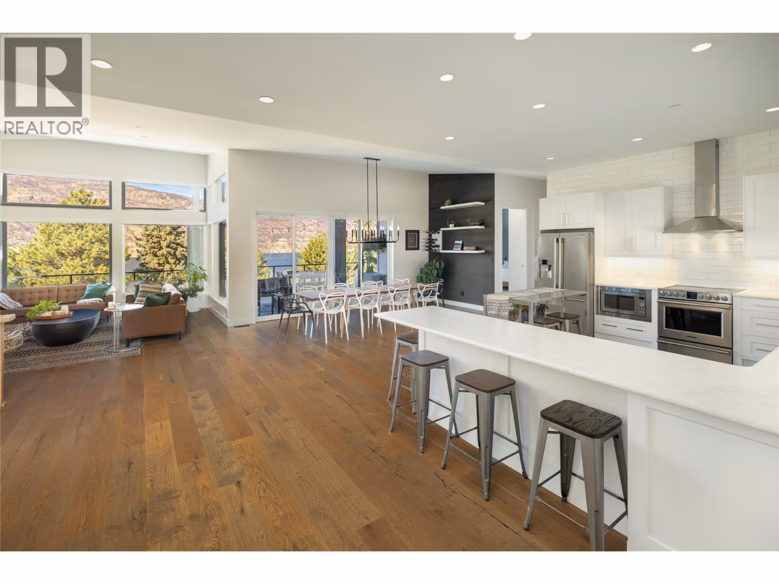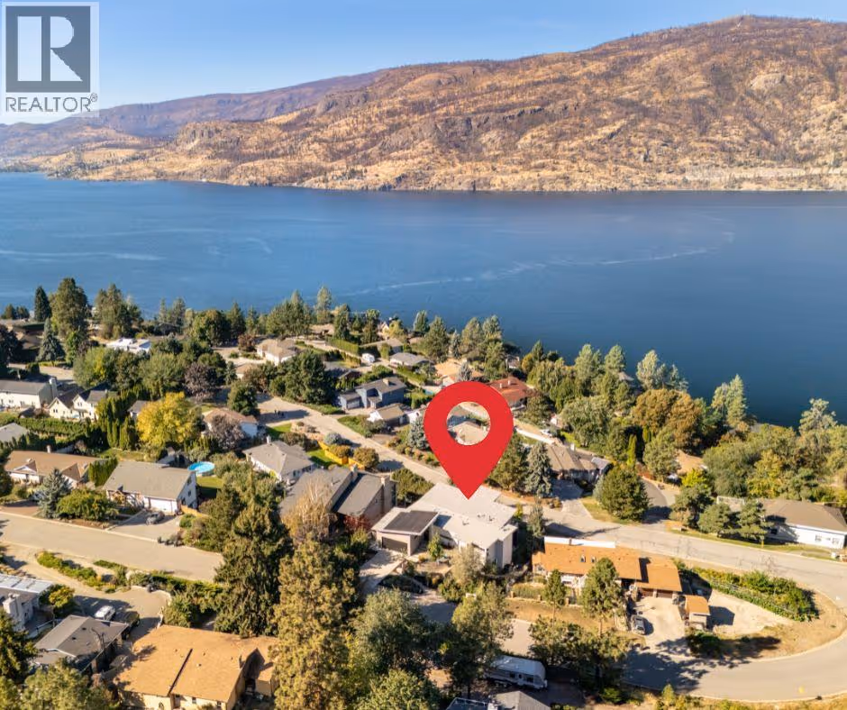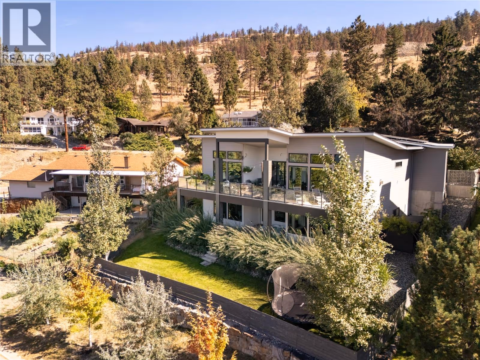 Perfectly positioned to showcase Okanagan Lake views within a mature, private neighbourhood, this nearly new custom residence embodies modern yet timeless living. Designed to maximize both comfort and style, the home is filled with natural light and showcases sweeping lake and mountain views from nearly every room. The main level highlights soaring ceilings, expansive windows, and an open-concept layout that seamlessly connects the kitchen, dining, and living areas. An oversized 8x12 ft sliding door opens to a vaulted covered patio, creating a striking indoor-outdoor flow perfect for entertaining or unwinding against the lakeview backdrop. The lower level offers exceptional versatility with 14-ft ceilings, oversized doors, and expansive spaces that include a recreation area, family room, office, gym, and a flexible kitchenette rough-in. Notable features include 31 solar panels & a two-car garage with EV charger and high ceilings that can accommodate a lift. Outdoors, the landscaped yard is graced with fruit trees and offers potential for a future swim spa with plenty of room for kids to run and play, plus easy accommodation for RV or boat parking. Blending refined design with everyday function, this property offers unmatched privacy, remarkable views, and a coveted location—just minutes from Aberdeen, UBCO, the lake, schools, shops, and recreation. (id:62999)