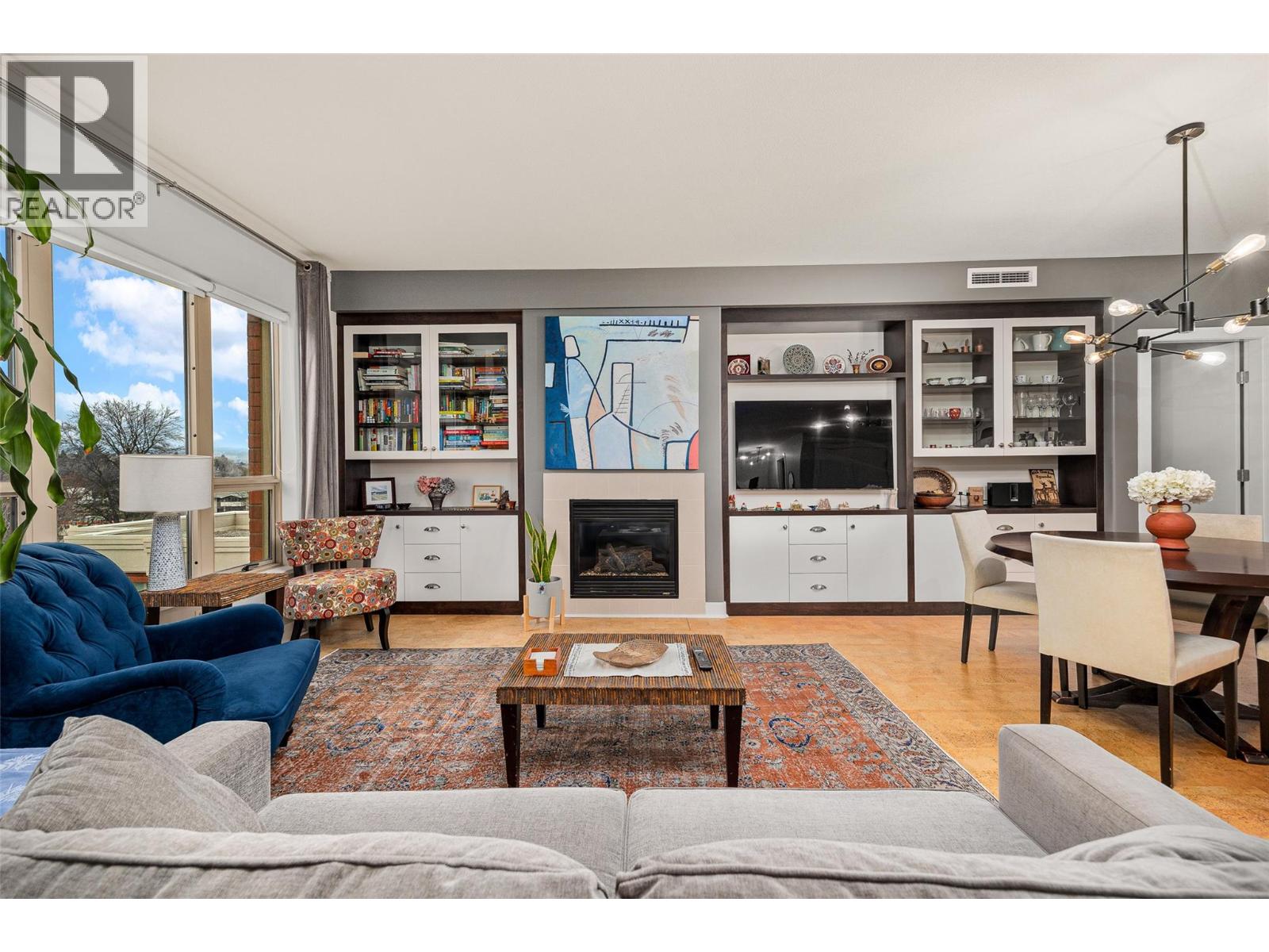 Exceptional interior space is rarely found downtown, and this 1,506 sq ft condo delivers comfort, functionality, and walkable urban living in one impressive package in Kelowna North. This 2 bed + den/ 2 bath condo features an ideal split-bedroom layout, providing excellent privacy with bedrooms, bathrooms, and walk-in closets positioned on opposite sides of the home. The open living and dining area is anchored by a custom wall-to-wall entertainment centre, while updated scratch- and sound-proof vinyl flooring adds durability throughout the bedrooms. Located on the quiet, east-facing side of the building, the home enjoys peaceful mountain views and a comfortable patio ideally away from traffic and major intersections. Additional upgrades include custom closet cabinetry, built-in foyer storage, updated lighting, newer paint through out, a quiet Bosch dishwasher, and a newer washer and dryer. The home includes TWO covered parking stalls and a storage locker, along with resort-style strata amenities including a 60’ outdoor pool, hot tub, sauna, steam room, and gym. Set in the Centuria Urban Village building, you’re steps to downtown restaurants, cafes, beaches, fitness studios, public transit, a grocery store within the complex and so much more. This is downtown condo living without compromise. Contact us today & book your private showing today, this one won’t last long! (id:62999)