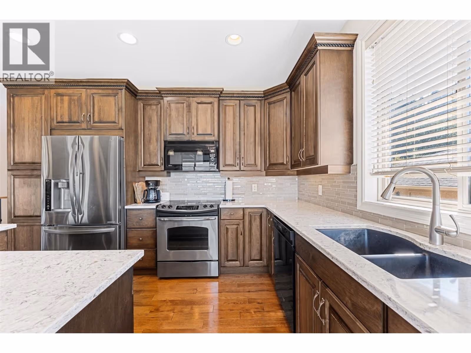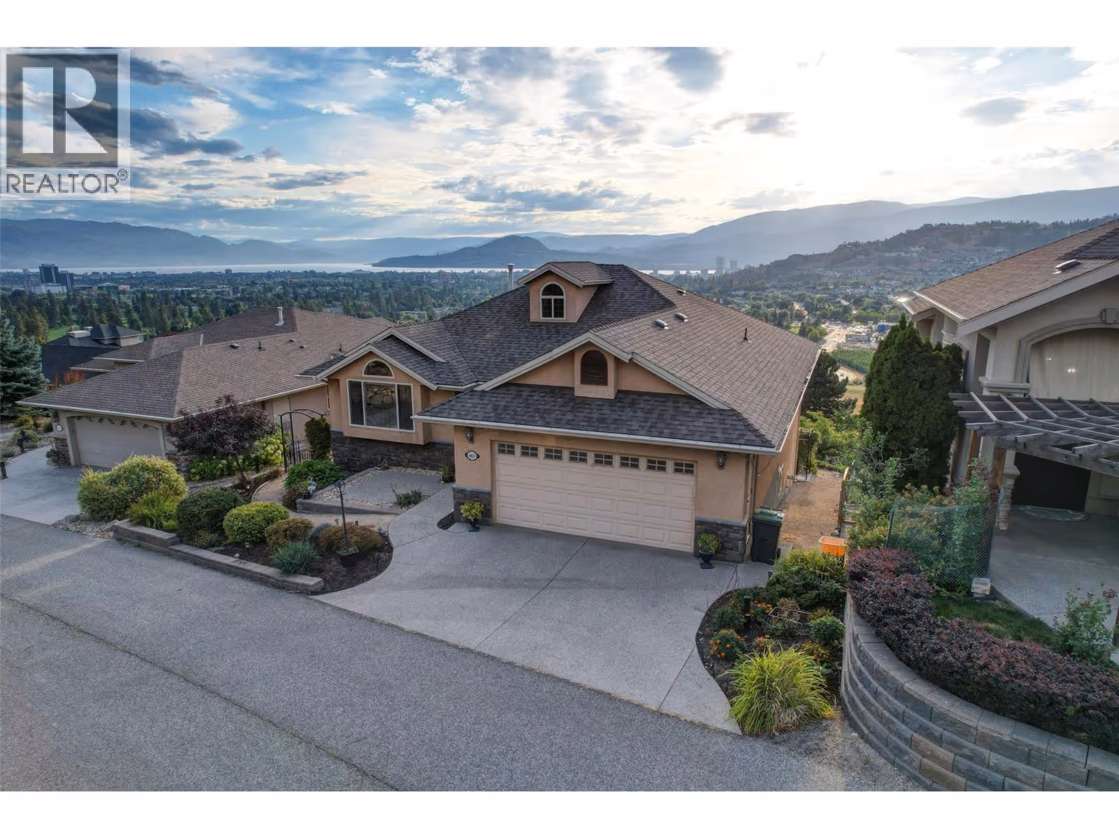 Exceptionally maintained walkout rancher with fantastic views of Kelowna. This home is located in the prime, lakeview side of Dilworth Mountain just minutes to downtown. Entry of the home flows seamlessly to the open concept main living area. The kitchen has been beautifully renovated with custom wood cabinetry, granite countertops and stainless-steel appliances with a separate wine refrigerator. Large centre island and ample counter space. In the living room is a gas fireplace with surrounding rock work. Off the dining area enjoy access to the covered patio perfect for grilling, dining and watching sunset over the valley and the lake. Main level primary with 5 piece en suite including a soaking bathtub, and walk-in closet. One additional bedroom is located on the main floor. The lower level is a great entertainment space offering a huge rec room, two bedrooms and a bathroom. Walkout access through the sliding glass doors leads to a covered patio with stunning lake, city and valley views. Two car garage. Low maintenance, mature landscaping. Excellent neighborhood close to great schools, and parks. (id:62999)