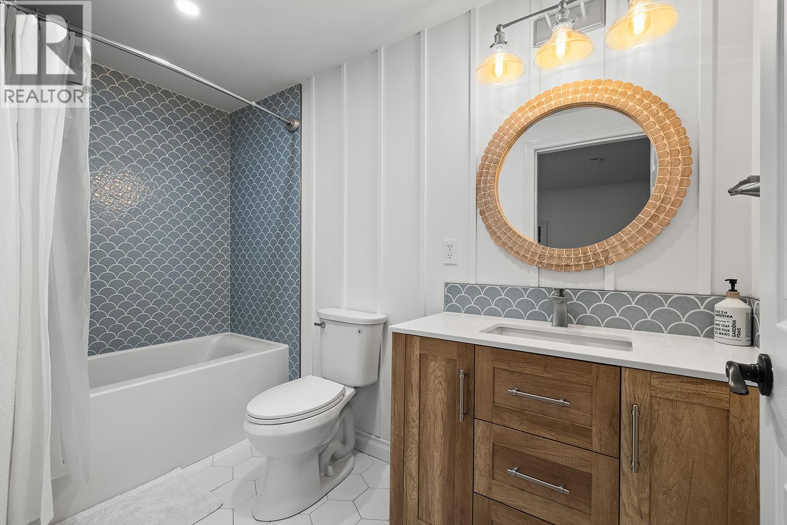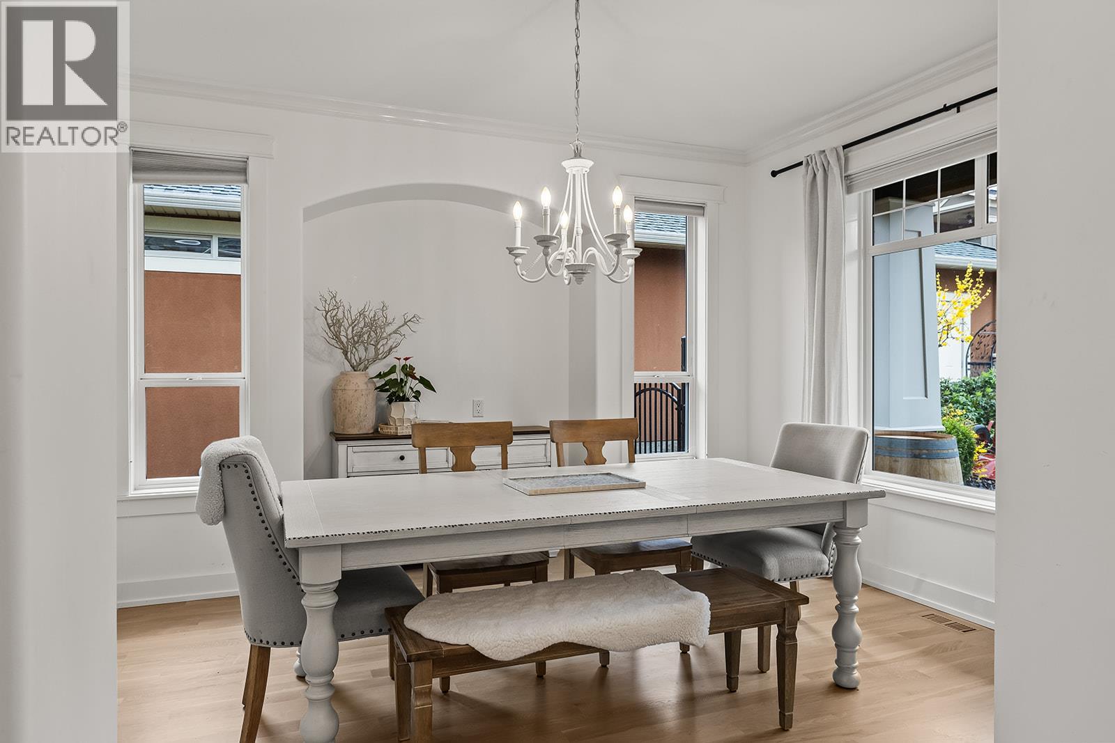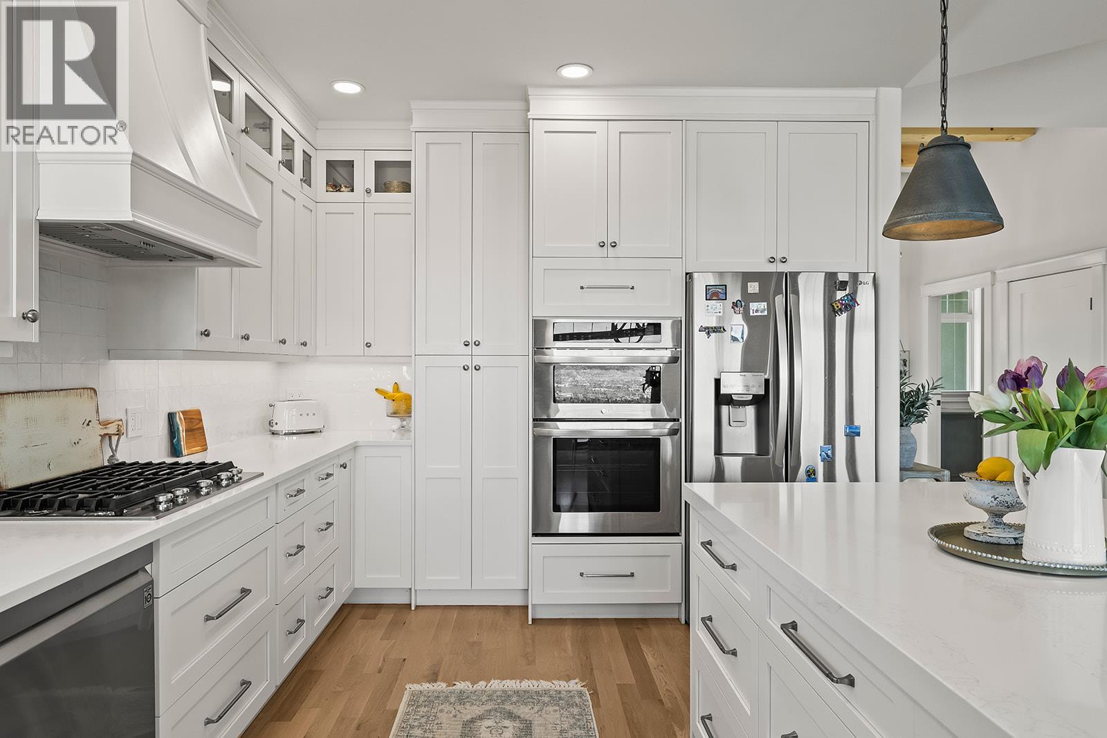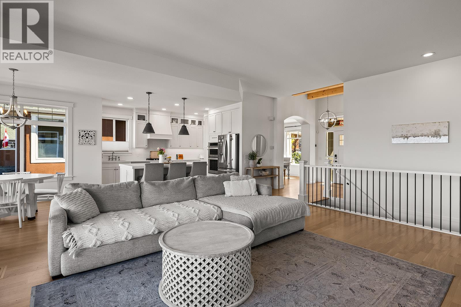 Stylish and inviting walk-out rancher in sought-after Upper Mission designed for the Okanagan lifestyle and panoramic lake views. Approximately 3,812 sq ft, this 5 bed, 4 bath home flows through bright open-concept living where hardwood floors and floor-to-ceiling windows frame sparkling water views. Gorgeous design details throughout including beams, arch entries, and wood slat wall features create a stylish modern farmhouse interior. The main level connects kitchen, breakfast, dining, and living spaces seamlessly, with a spacious primary suite featuring a walk-in closet and ensuite, a second bedroom, laundry, and a convenient powder room. The lower level expands the layout with additional bedrooms, a large rec area, great room, second kitchen, and a wine room, creating flexibility and privacy for guests or extended family. Step outside to a private setting with a hot tub, framed by hedges and rockwork, plus a double car garage and driveway with parking for four. Centrally located near Quarry Park, Canyon Falls Middle School, and Summerhill Winery in one of Upper Mission’s most desirable areas. (id:62999)