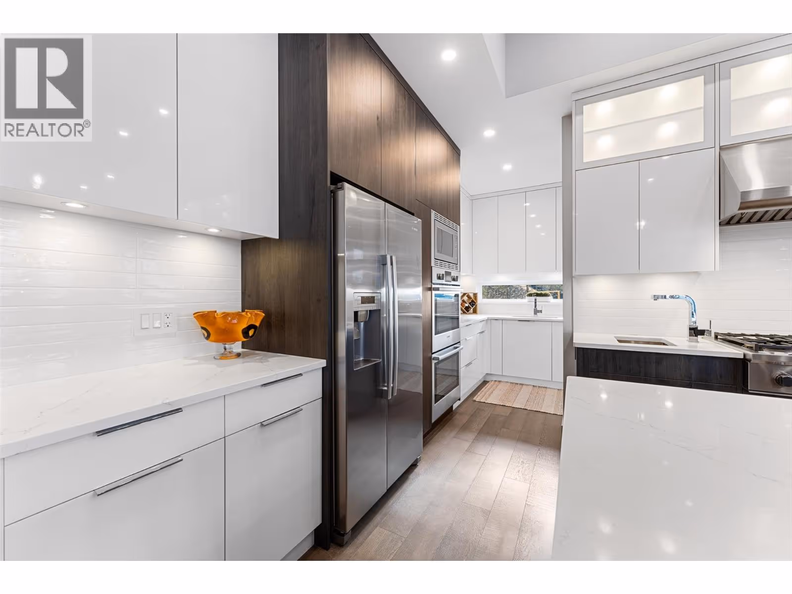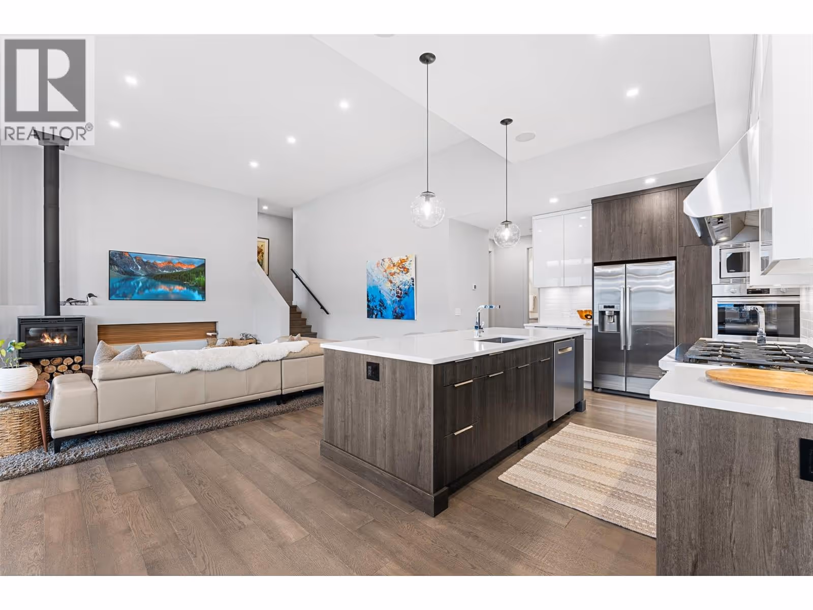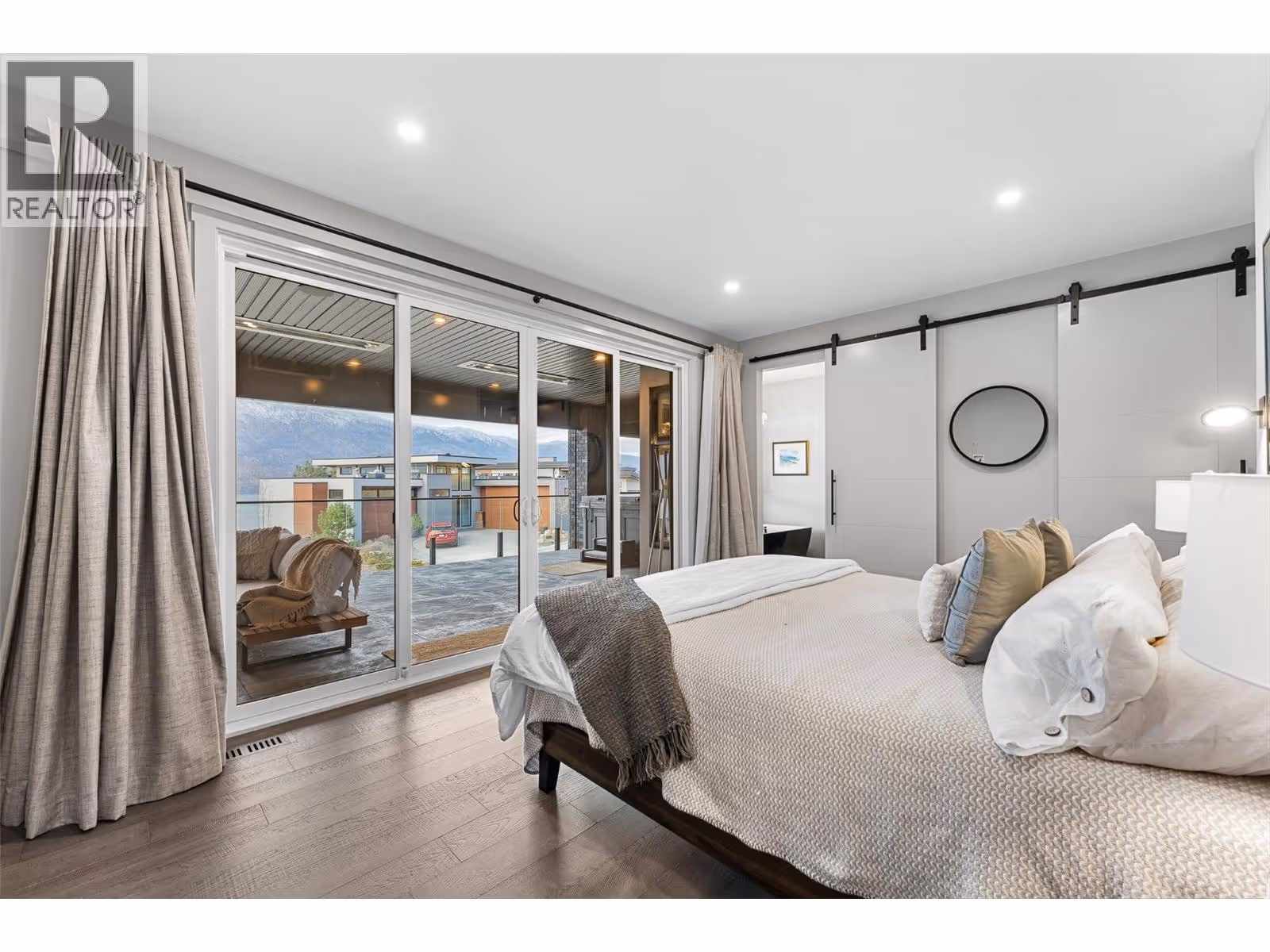 Set on a quiet no-through road in McKinley Beach, this contemporary residence offers a rare sense of privacy paired with uninterrupted views of Okanagan Lake. Designed across 3 levels, the home showcases soaring ceilings, wide-plank hardwood floors, and expansive walls of glass that capture sweeping lake and mountain vistas. The main level is anchored by a dramatic great room with a wood-burning stove and floor-to-ceiling windows, seamlessly connecting to the chef’s kitchen. Here, an eight-burner Fisher & Paykel gas cooktop, two Bosch wall ovens, oversized island and full butler’s pantry with built-in appliances makes entertaining effortless. The dining area opens to a covered deck with glass railings, in-ceiling heaters, integrated speakers, an inviting space to enjoy the view year-round. Two bedrooms with a shared bath located on this level. Upper floor is dedicated to the primary retreat, featuring a private patio with hot tub, a spa-inspired five-piece ensuite with freestanding soaker tub, and a walk-in closet with custom built-ins. A rooftop patio with turf expands outdoor living. Below, the lower level offers a fourth bedroom, mudroom, and a versatile recreation room with two oversized garage doors, ideal for a home gym. Two car garage with epoxy floors, potential for a 4 car garage. Hunter Douglas electronic blinds, Lutron lighting, and Honeywell Home security. Residents enjoy access to McKinley’s amenity centre with pool, gym, hot tub, pickleball courts, & more. (id:62999)