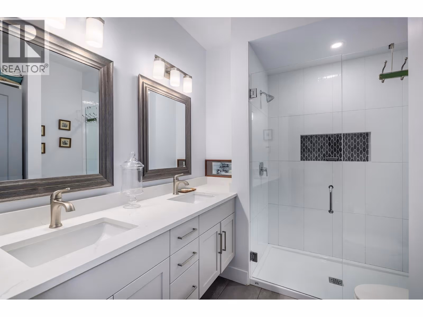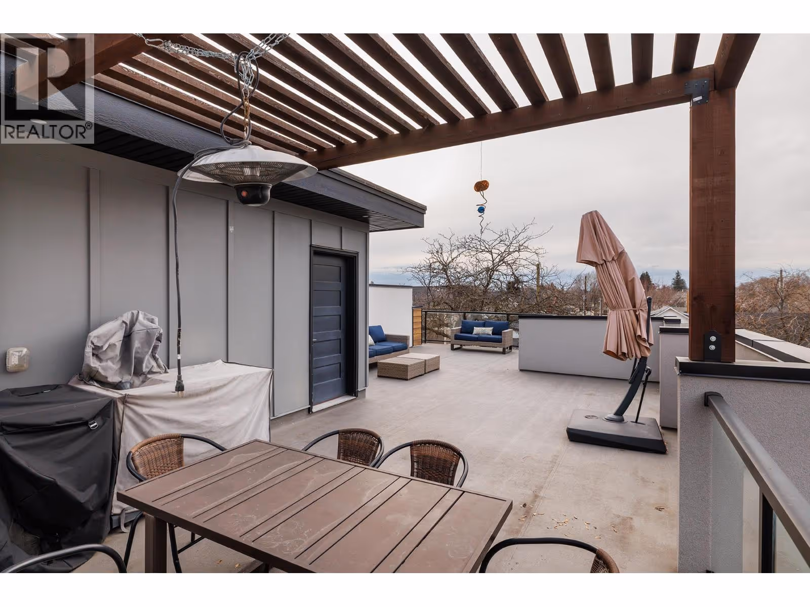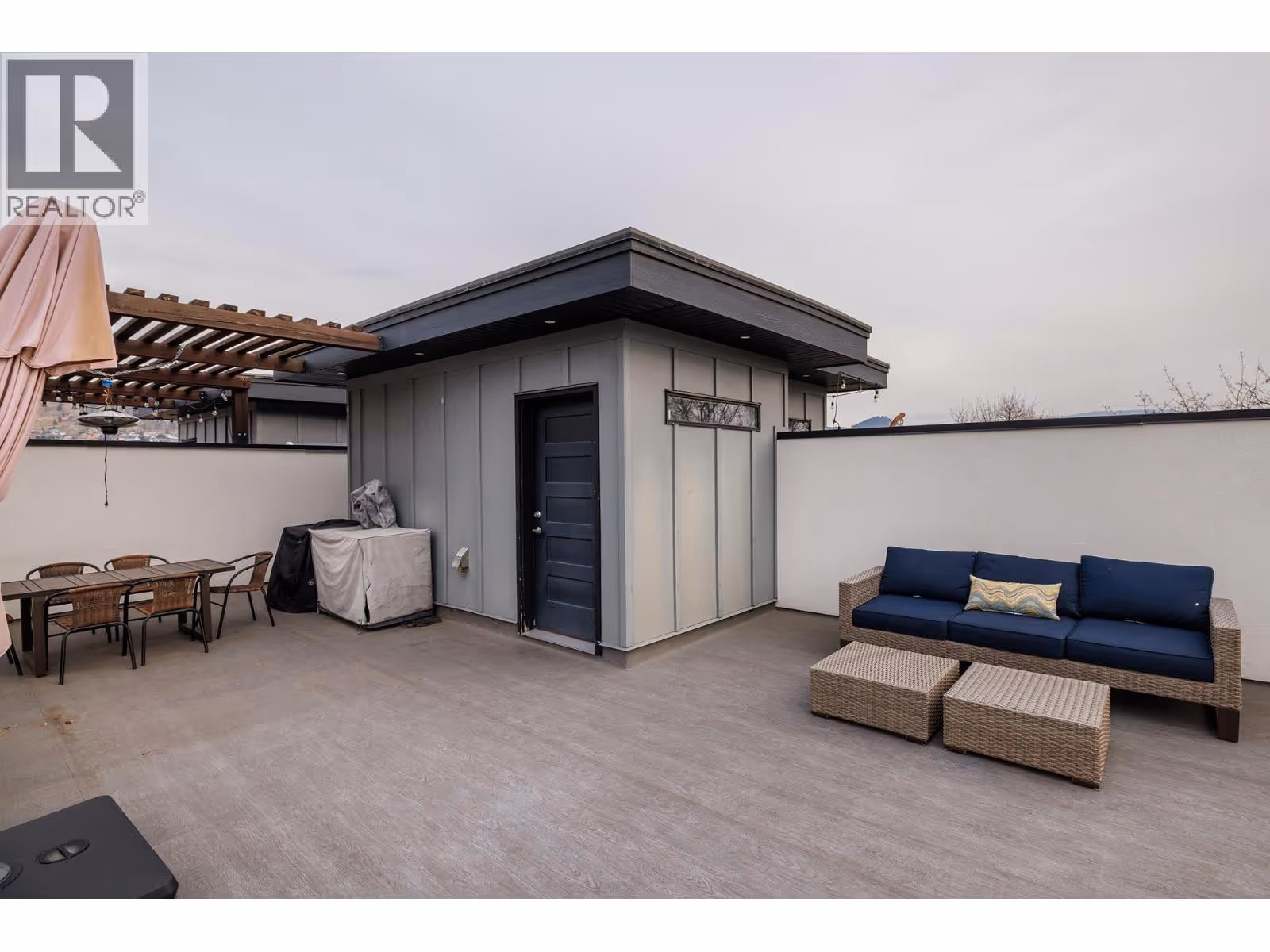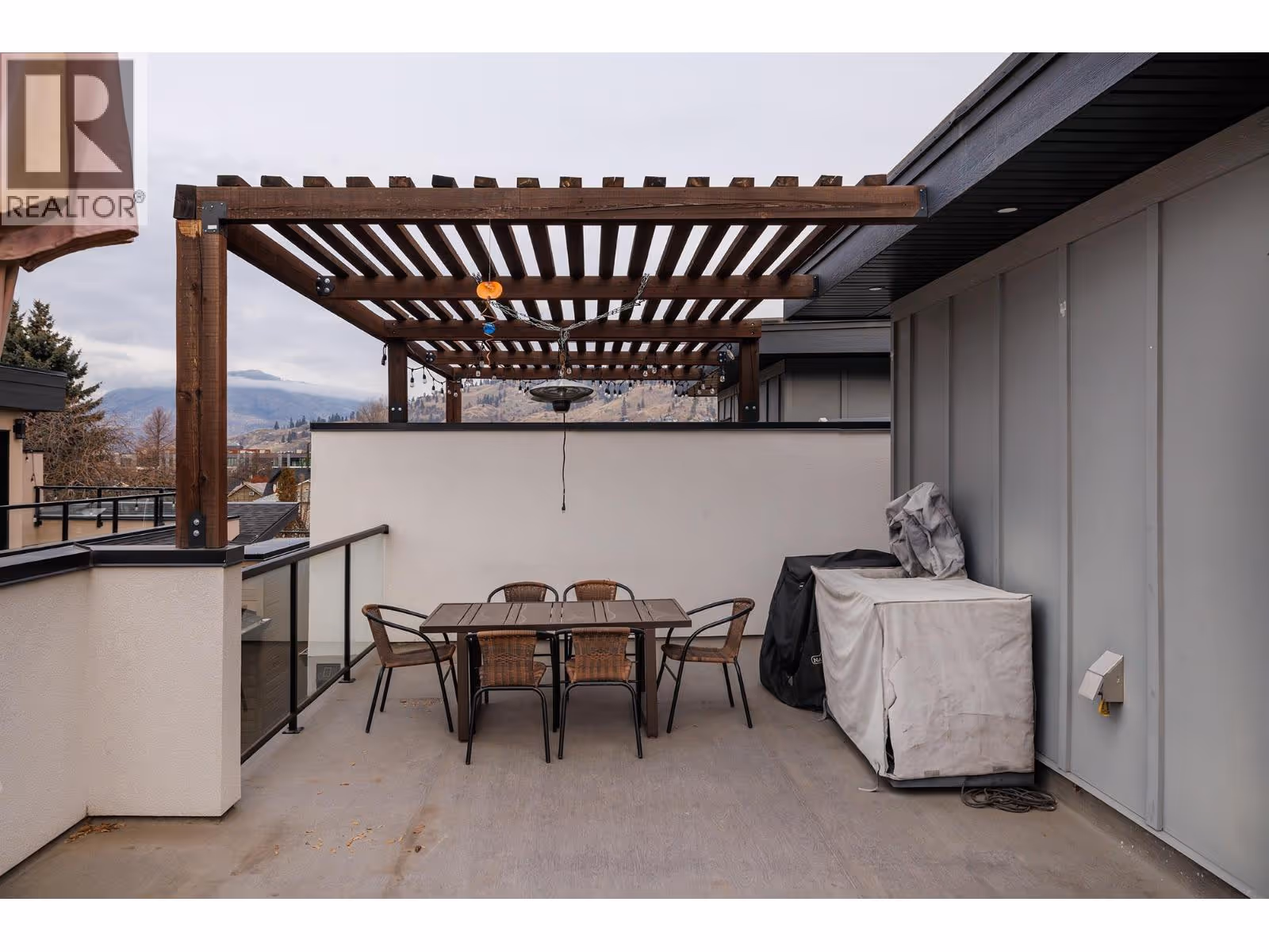 A thoughtfully designed two-level townhome in downtown Kelowna, blending modern style with everyday comfort. The entry level offers two bedrooms with built-in closets, a four-piece bathroom, dedicated laundry, and an attached single-car garage with polished concrete floors, plus an additional outdoor parking space. The main living level features a bright open-concept kitchen, dining, and living area with wide vinyl plank flooring throughout. The kitchen is finished with quartz countertops, ceiling-height cabinetry, a white tile backsplash, peninsula seating, undercabinet lighting, and stainless steel appliances, including an LG gas range and French door refrigerator. The primary bedroom is also located on this level and includes a walk-in closet and a spa-inspired ensuite with heated tile floors,  floating vanity with two sinks, and a tiled walk-in shower. A stylish powder room completes the floor. Above, the expansive rooftop patio offers glass railings, city and mountain views, Duradek surfacing, a pergola for shade, and plenty of space for dining and lounging—perfect for summer evenings and entertaining. (id:62999)