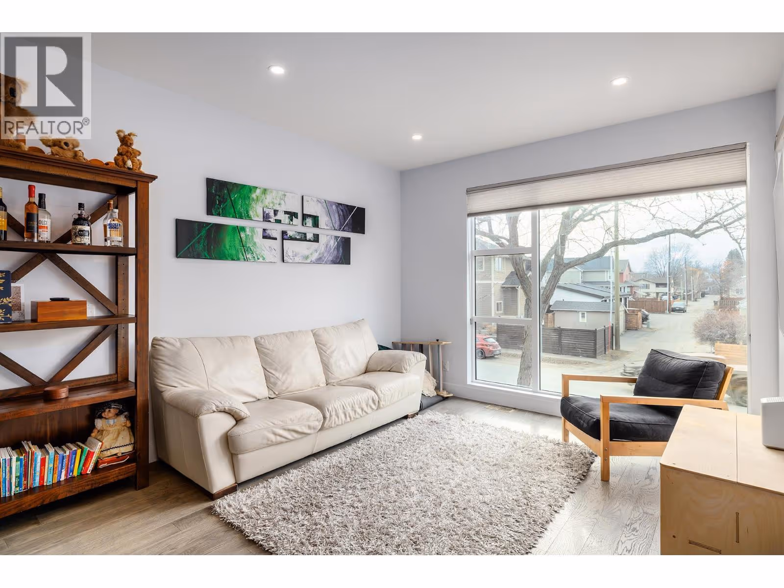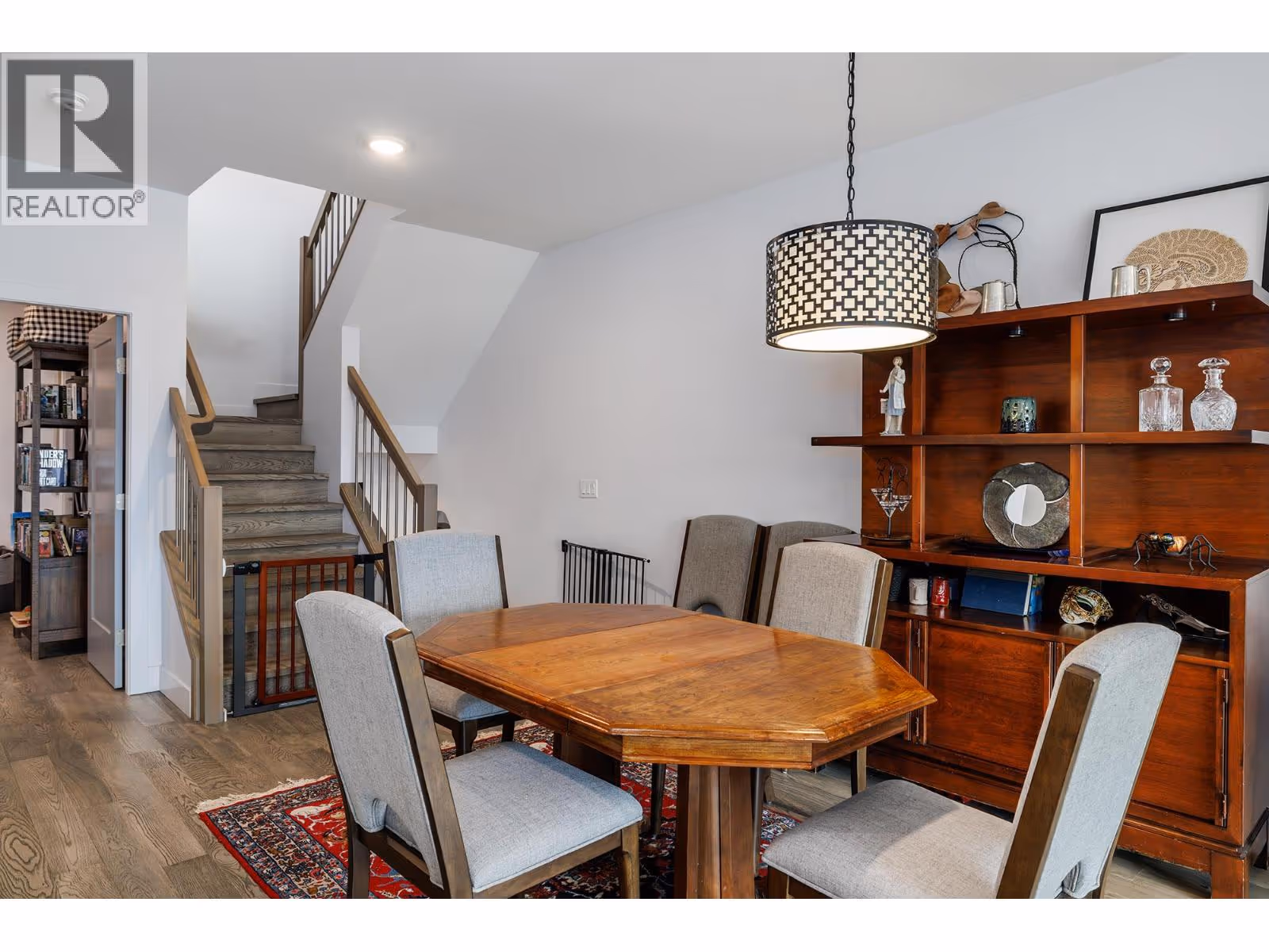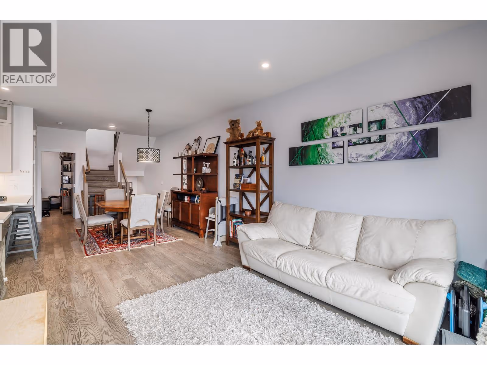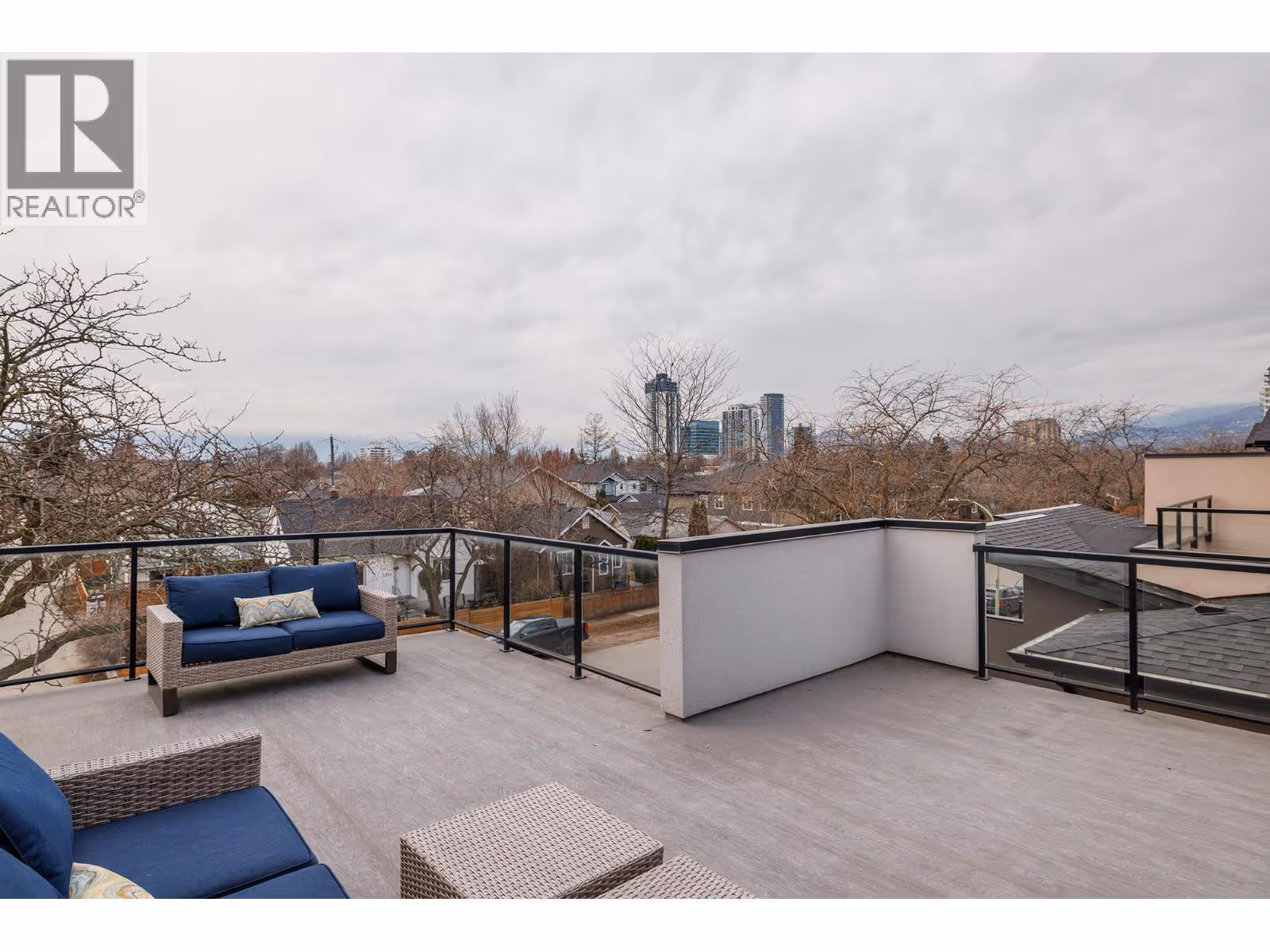 A thoughtfully designed two-level townhome in downtown Kelowna, blending modern style with everyday comfort. The entry level offers two bedrooms with built-in closets, a four-piece bathroom, dedicated laundry, and an attached single-car garage with polished concrete floors, plus an additional outdoor parking space. The main living level features a bright open-concept kitchen, dining, and living area with wide vinyl plank flooring throughout. The kitchen is finished with quartz countertops, ceiling-height cabinetry, a white tile backsplash, peninsula seating, undercabinet lighting, and stainless steel appliances, including an LG gas range and French door refrigerator. The primary bedroom is also located on this level and includes a walk-in closet and a spa-inspired ensuite with heated tile floors,  floating vanity with two sinks, and a tiled walk-in shower. A stylish powder room completes the floor. Above, the expansive rooftop patio offers glass railings, city and mountain views, Duradek surfacing, a pergola for shade, and plenty of space for dining and lounging—perfect for summer evenings and entertaining. (id:62999)