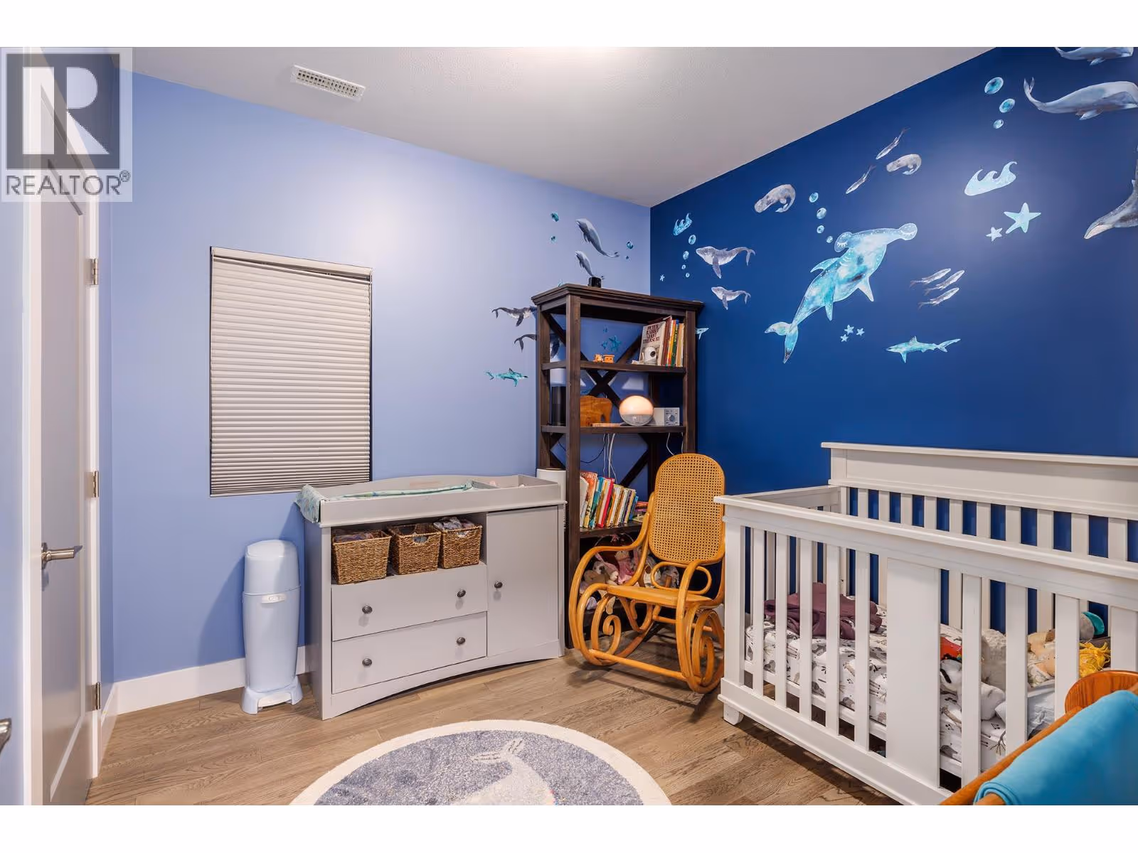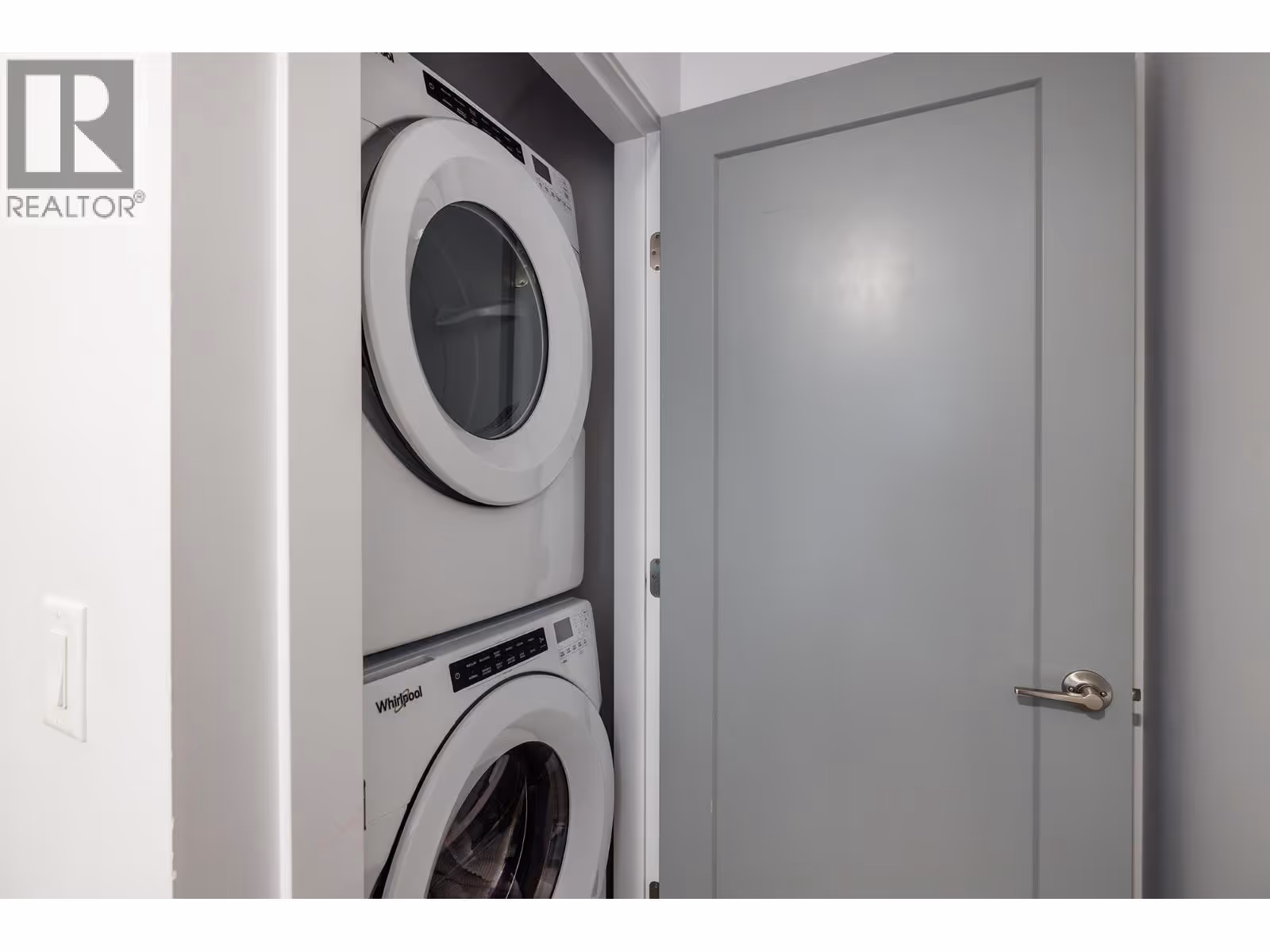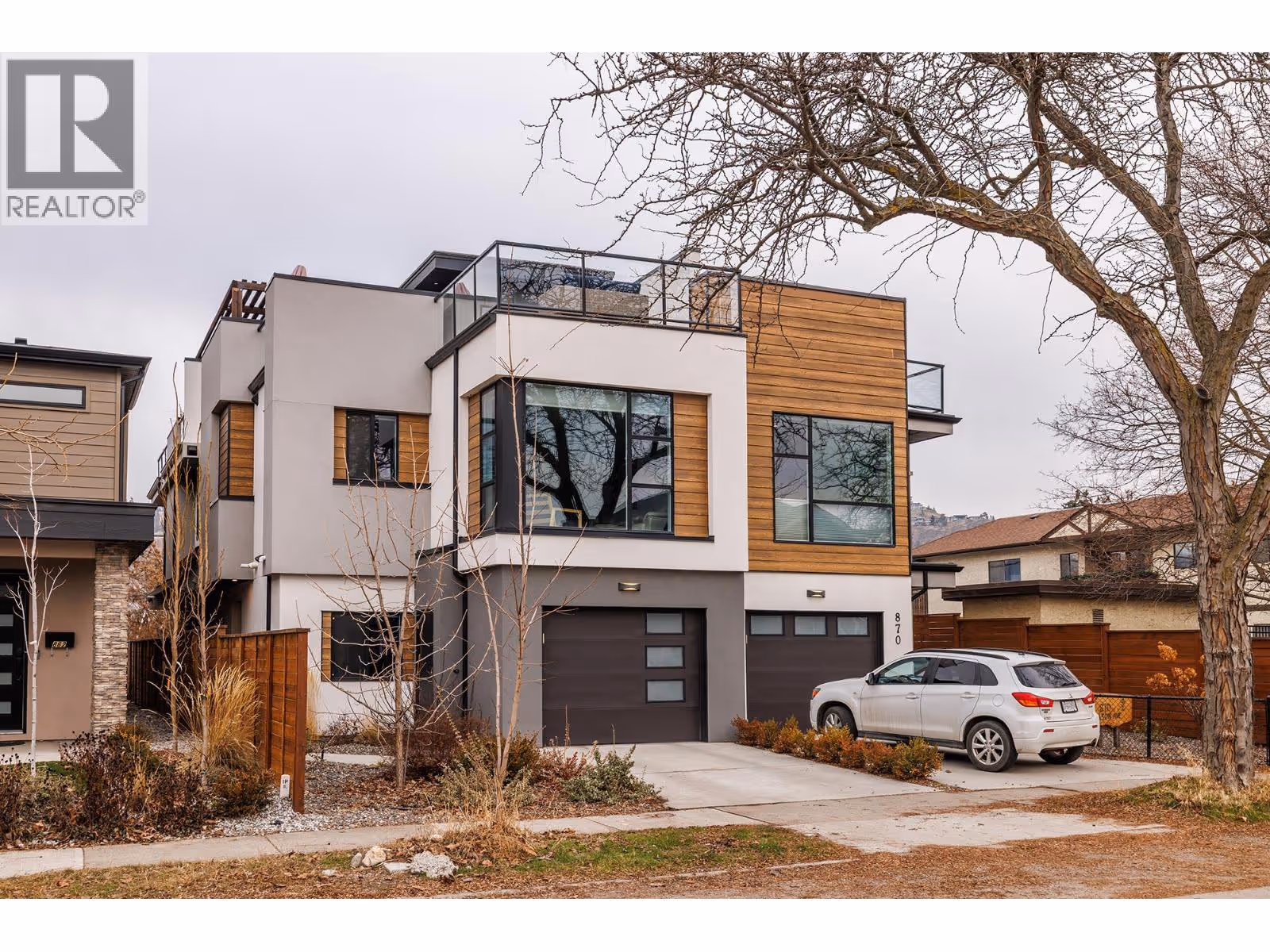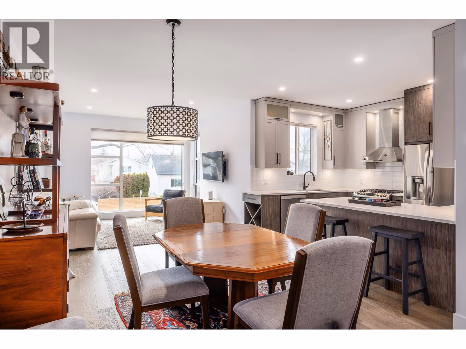 A thoughtfully designed two-level townhome in downtown Kelowna, blending modern style with everyday comfort. The entry level offers two bedrooms with built-in closets, a four-piece bathroom, dedicated laundry, and an attached single-car garage with polished concrete floors, plus an additional outdoor parking space. The main living level features a bright open-concept kitchen, dining, and living area with wide vinyl plank flooring throughout. The kitchen is finished with quartz countertops, ceiling-height cabinetry, a white tile backsplash, peninsula seating, undercabinet lighting, and stainless steel appliances, including an LG gas range and French door refrigerator. The primary bedroom is also located on this level and includes a walk-in closet and a spa-inspired ensuite with heated tile floors,  floating vanity with two sinks, and a tiled walk-in shower. A stylish powder room completes the floor. Above, the expansive rooftop patio offers glass railings, city and mountain views, Duradek surfacing, a pergola for shade, and plenty of space for dining and lounging—perfect for summer evenings and entertaining. (id:62999)