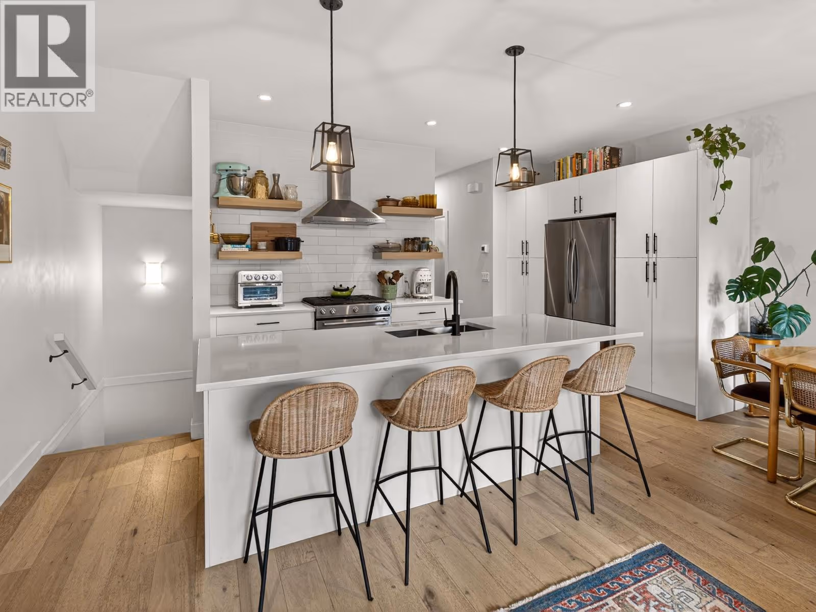 Set on a quiet, treelined street just steps from the downtown core, this modern townhome offers outstanding walkability to the waterfront, restaurants, coffee shops, and everyday conveniences. The main level features a welcoming entry with generous storage, a full bathroom, a bedroom, and a separate flex space that works well as a home office, gym, or another bedroom. This level also includes an attached garage with direct street access, plus an additional driveway parking space. A crawl space provides valuable extra storage, a rare bonus for townhome living. The second level is bright and well laid out, offering an open concept living and dining area designed for both everyday comfort and entertaining. The modern kitchen features clean lines, a gas range, and a large island with seating for four. Hardwood flooring runs throughout the home, with no carpet. A spacious bedroom, full bathroom, and in unit laundry complete this level. The top level is dedicated to outdoor living, highlighted by an expansive private rooftop deck. With plenty of room for entertaining or relaxing, the deck offers beautiful views toward Knox Mountain and is ideal for enjoying Okanagan summers. The building is self-managed, keeping strata fees very low, and water is included. In short, this is a well designed, low maintenance home, offering quiet surroundings with unbeatable access to the city. (id:62999)