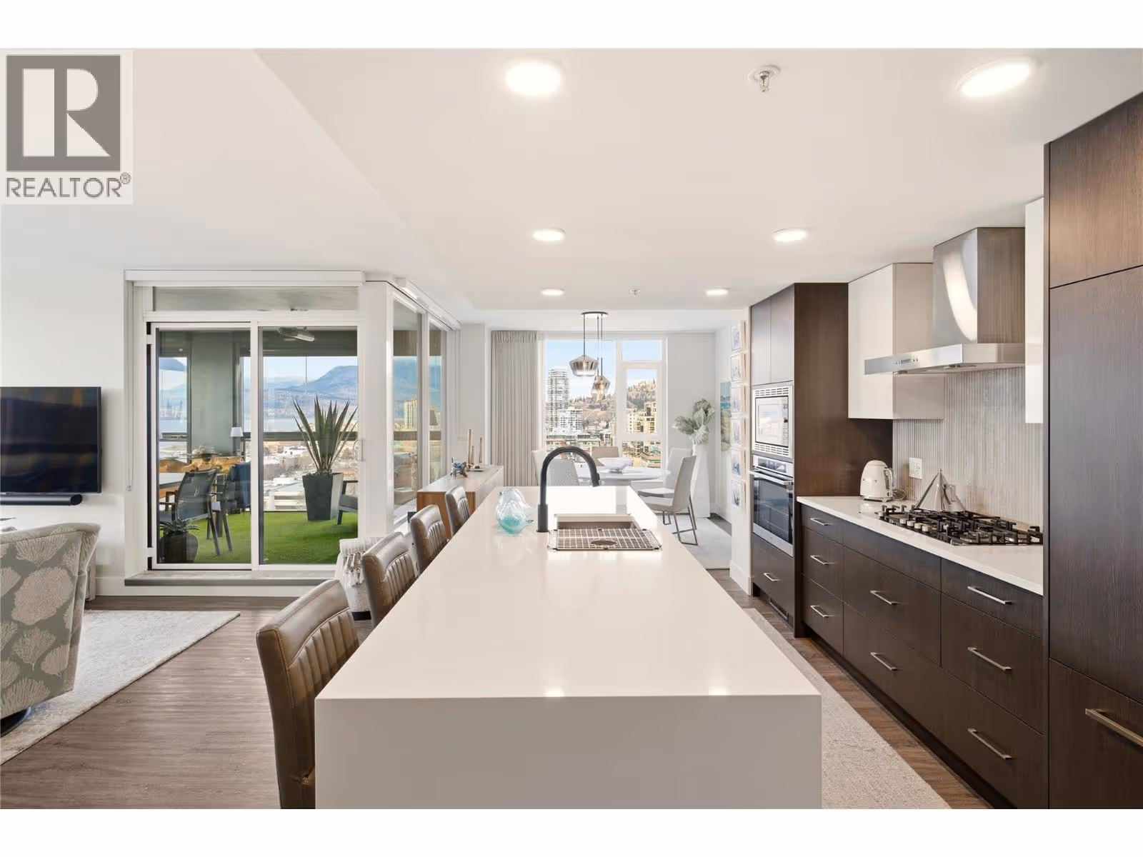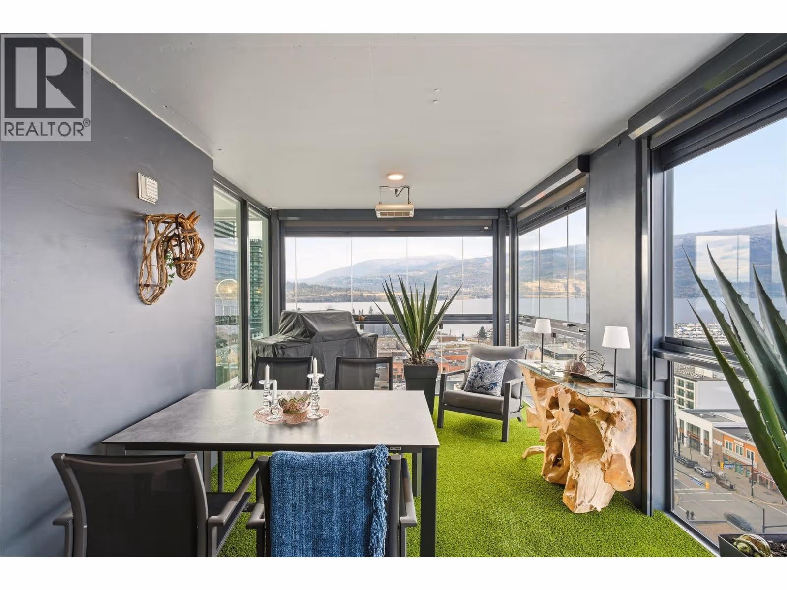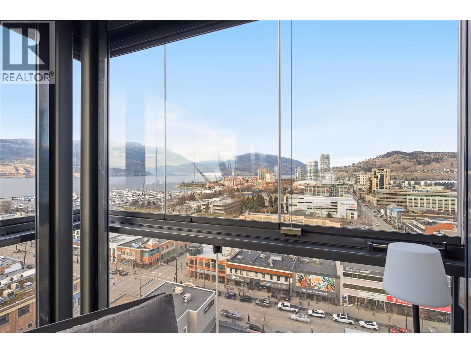 Perched on the 16th floor, this exceptional corner unit situated in the prestigious Ella building showcases luxury high-rise living at its finest. With sweeping lake, mountain, city, and Yacht Club views framed by floor-to-ceiling windows, every room captures the beauty and energy of downtown Kelowna from above. This exclusive 2 bedroom + den, 3 bathroom layout offers ultimate privacy and comfort, with both bedrooms featuring their own ensuites. The unit is in impeccable condition and has been extensively elevated with over $100,000 in premium upgrades, far beyond original developer standards. There is true indoor-outdoor living with the 11’ x 19’ terrace that is enhanced by a custom Lumon glass enclosure. Fully open for summer evenings or have closed for the winter while using the heaters for year-round enjoyment and a seamless extension of your living space. The chef-inspired kitchen features quartz counters, high-end appliances, and sleek European-style cabinetry. Additional highlights include two storage lockers (one being 7’ x 10’), a stunning wine room, thoughtfully designed built-in closets, striking feature walls by Plutos, high-end drapery, and three artistic motorized patio sun shades. There is a guest suite, pet wash, bike facilities, EV charging, and an on-site community director. This must be experienced in person to appreciate the craftsmanship and detail throughout in Kelowna's most sought after building. Contact for the full upgrade list. (id:62999)