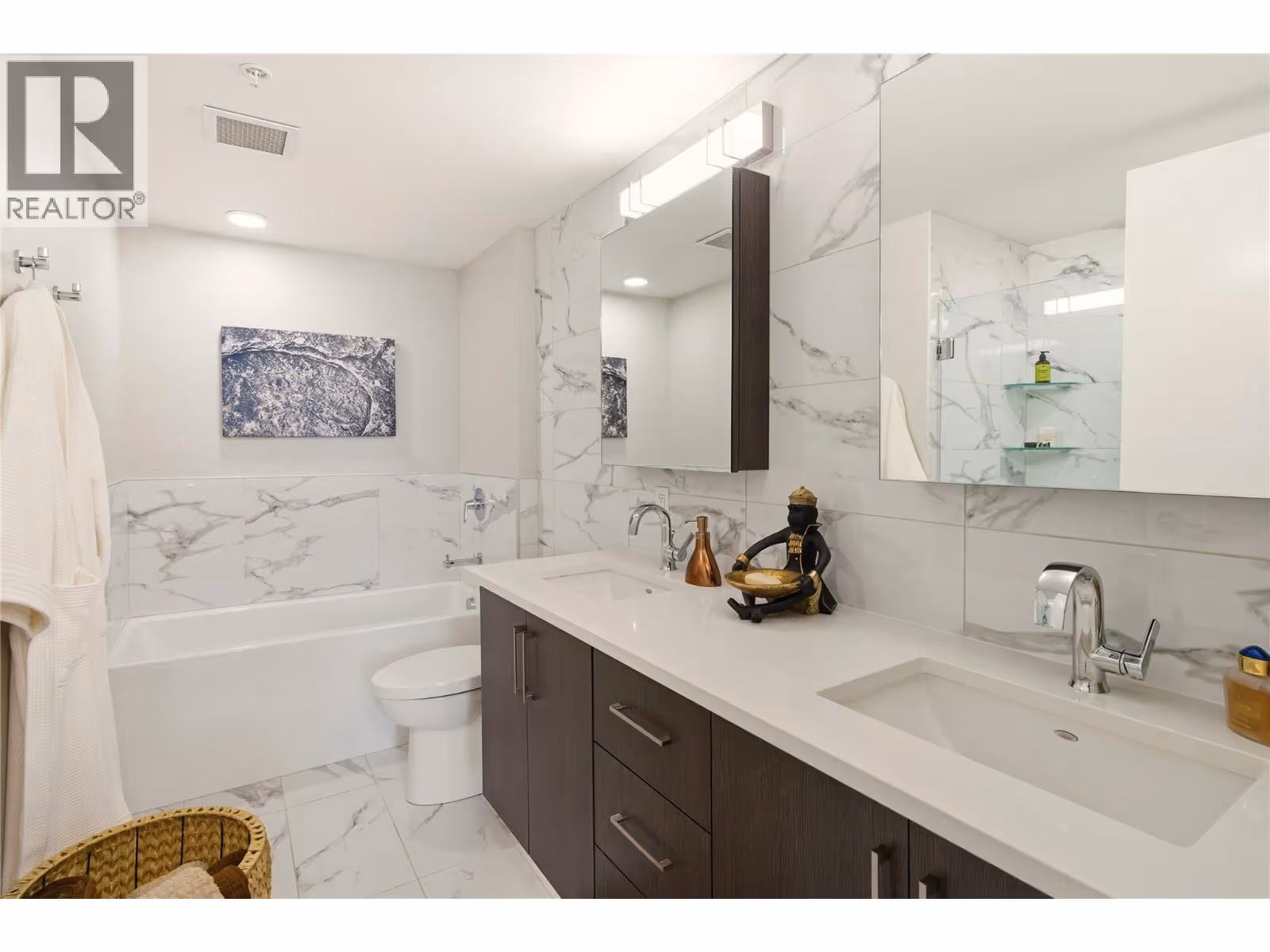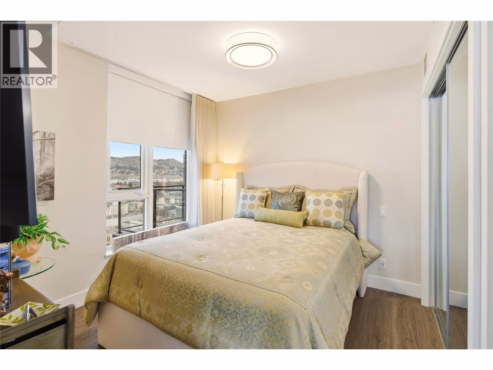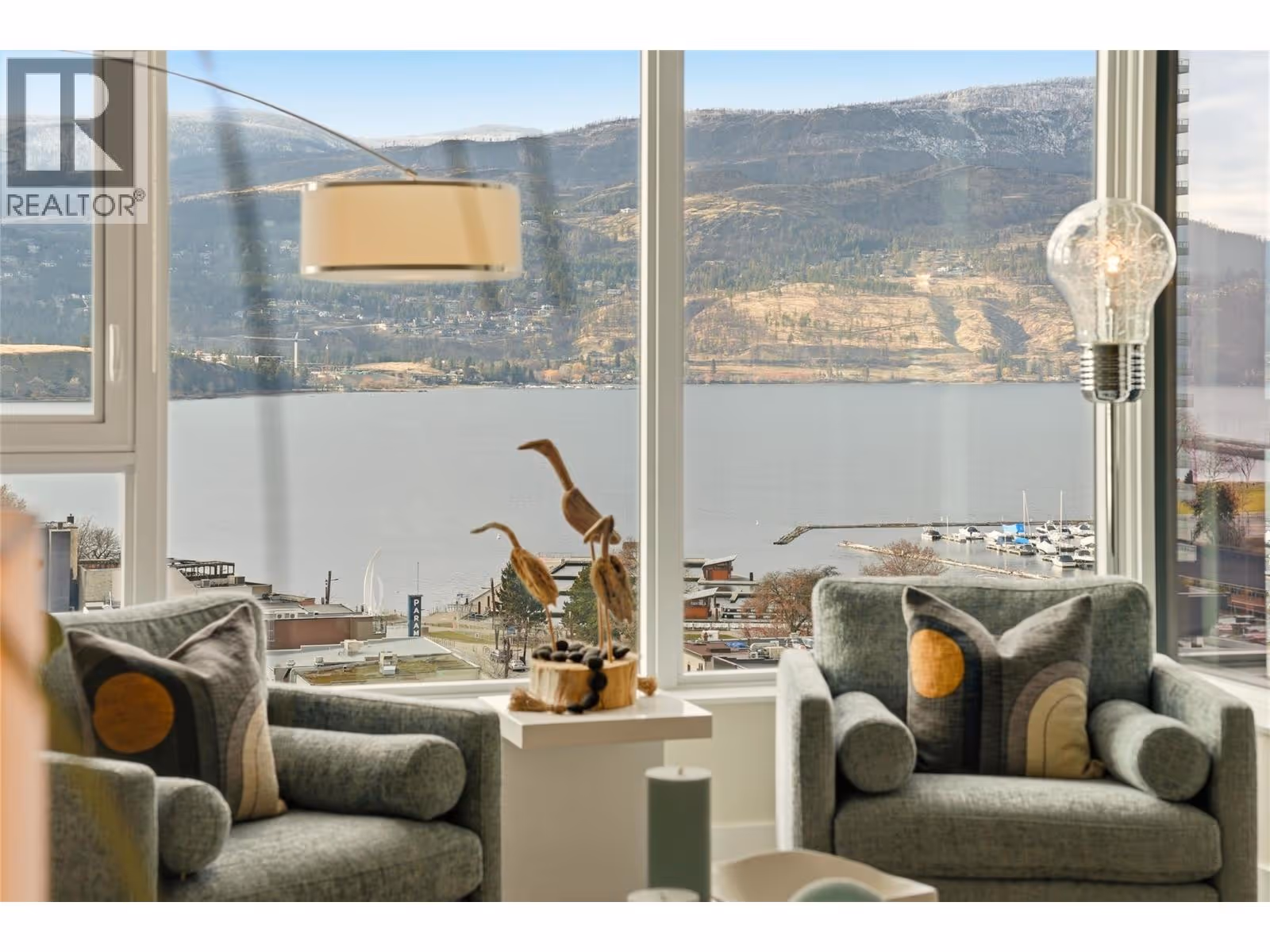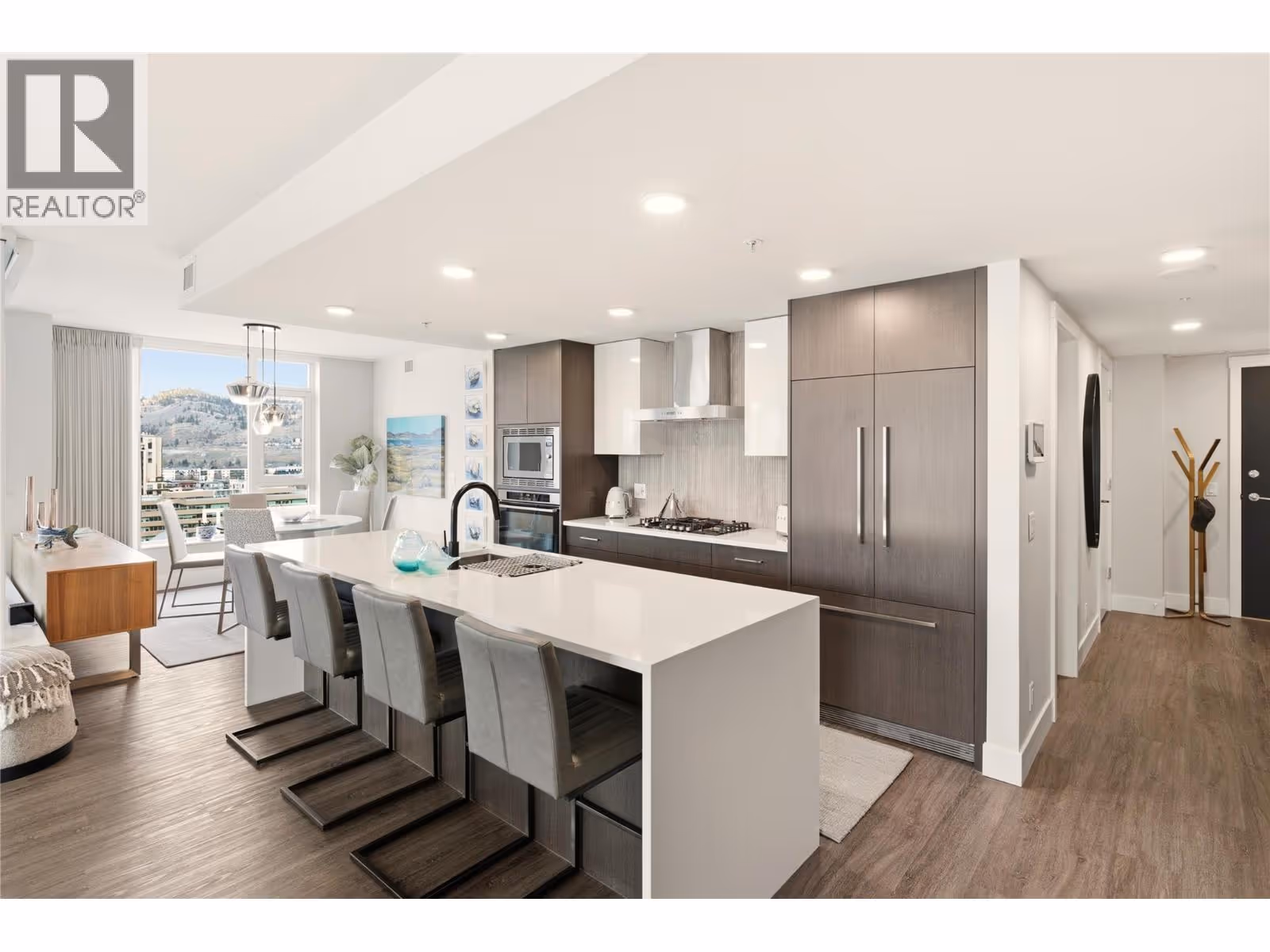 Perched on the 16th floor, this exceptional corner unit situated in the prestigious Ella building showcases luxury high-rise living at its finest. With sweeping lake, mountain, city, and Yacht Club views framed by floor-to-ceiling windows, every room captures the beauty and energy of downtown Kelowna from above. This exclusive 2 bedroom + den, 3 bathroom layout offers ultimate privacy and comfort, with both bedrooms featuring their own ensuites. The unit is in impeccable condition and has been extensively elevated with over $100,000 in premium upgrades, far beyond original developer standards. There is true indoor-outdoor living with the 11’ x 19’ terrace that is enhanced by a custom Lumon glass enclosure. Fully open for summer evenings or have closed for the winter while using the heaters for year-round enjoyment and a seamless extension of your living space. The chef-inspired kitchen features quartz counters, high-end appliances, and sleek European-style cabinetry. Additional highlights include two storage lockers (one being 7’ x 10’), a stunning wine room, thoughtfully designed built-in closets, striking feature walls by Plutos, high-end drapery, and three artistic motorized patio sun shades. There is a guest suite, pet wash, bike facilities, EV charging, and an on-site community director. This must be experienced in person to appreciate the craftsmanship and detail throughout in Kelowna's most sought after building. Contact for the full upgrade list. (id:62999)