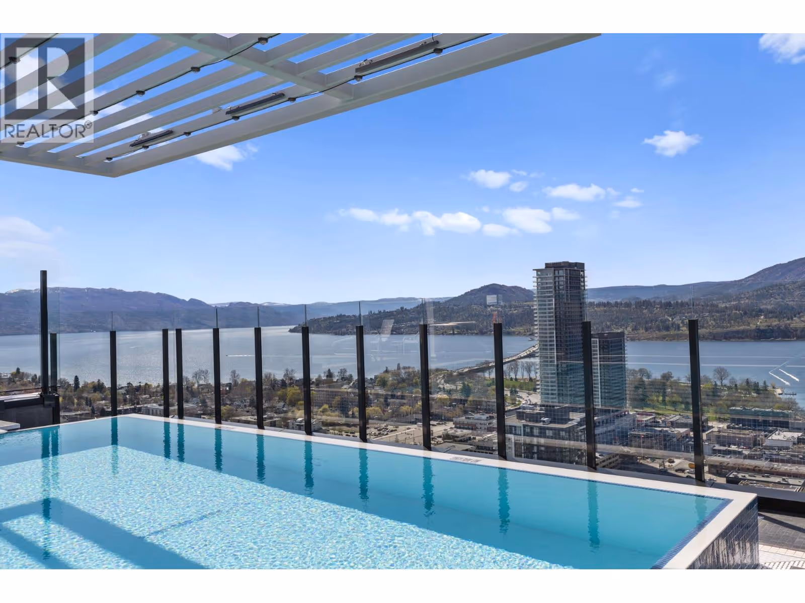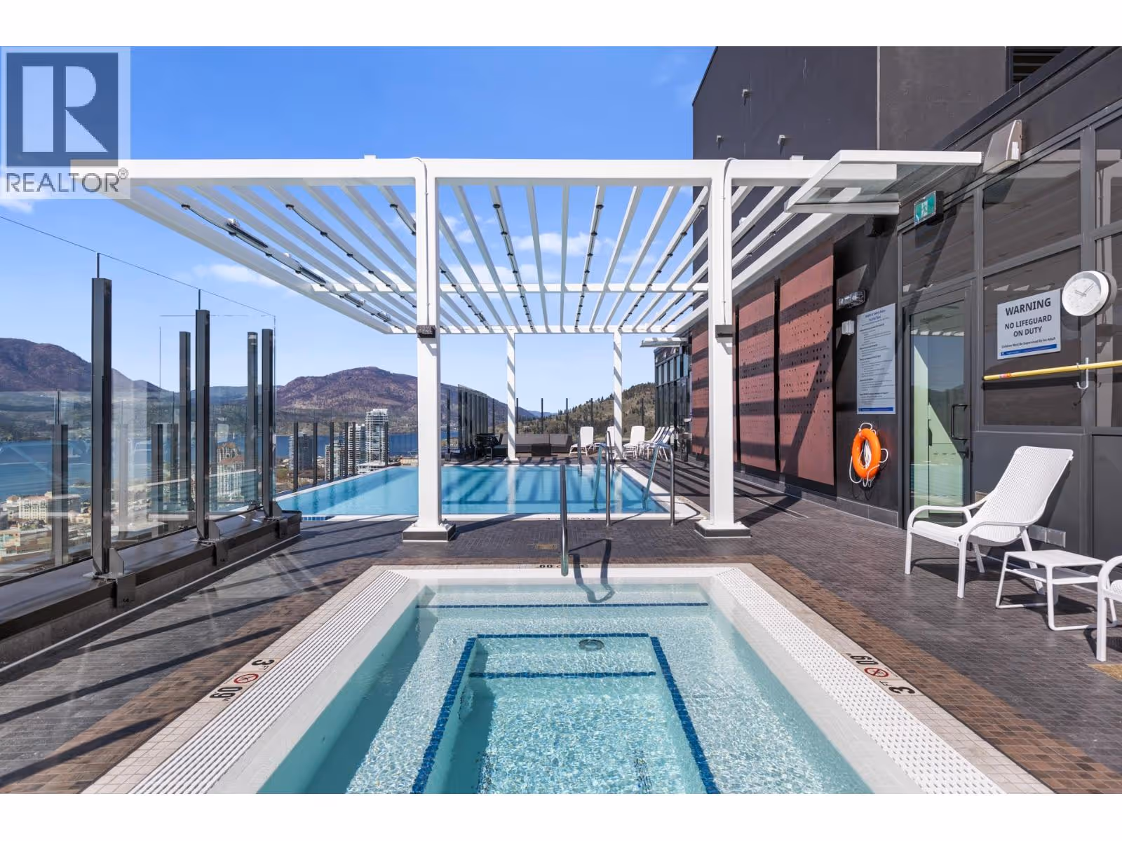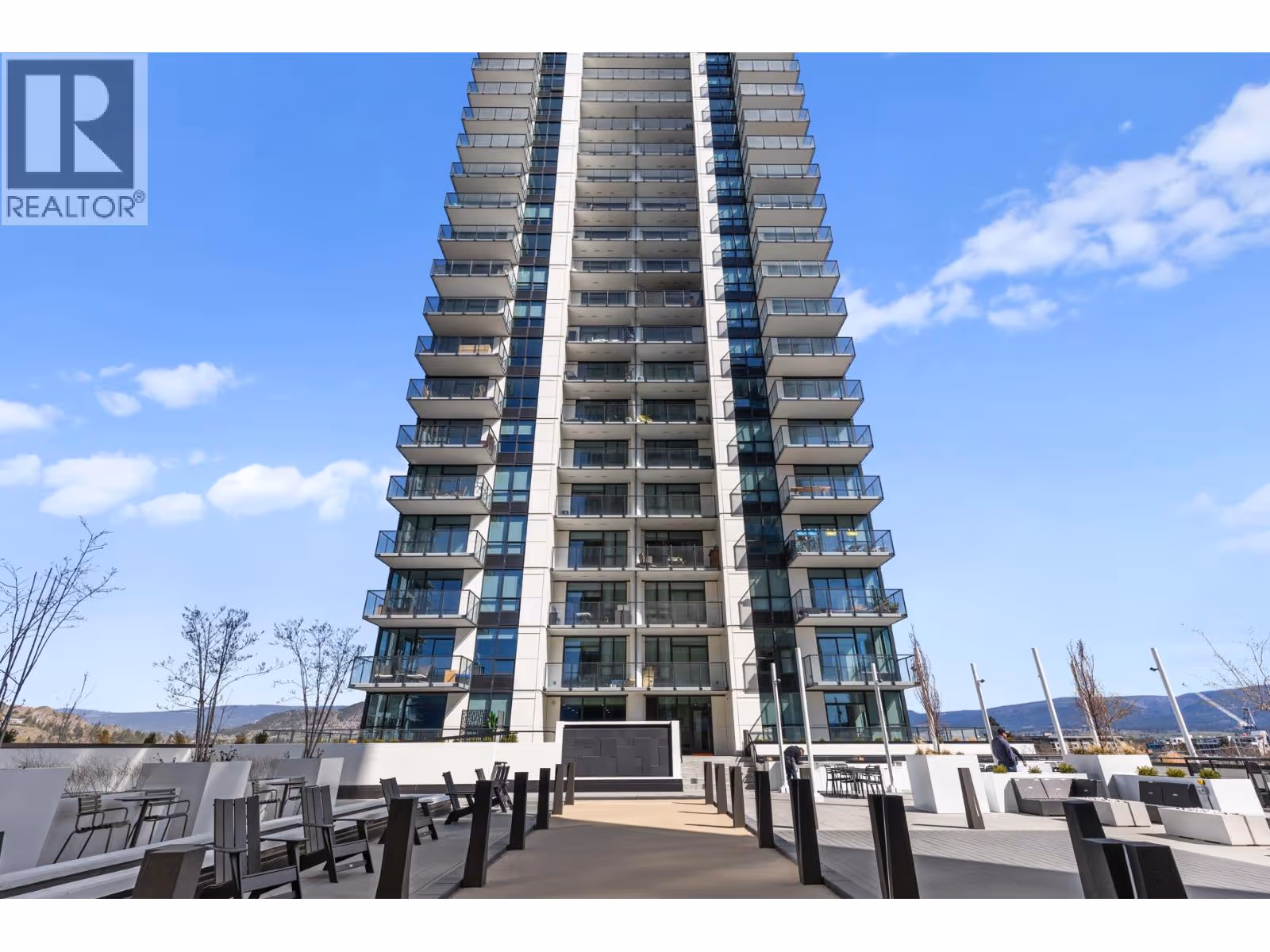 Welcome to Bertram, where elevated living meets an effortless lakeside lifestyle. This beautifully appointed corner unit offers two bedrooms and two bathrooms and is ideally positioned to capture sweeping lake views, abundant natural daylight, and stunning sunsets. Completed in 2024, this residence is wrapped in expansive windows that fill the home with sunshine throughout the day while showcasing views of Lake Okanagan, the city skyline, and surrounding valley. The thoughtfully designed split-bedroom layout provides excellent privacy, while the open-concept living and dining areas create a seamless flow for both everyday living and entertaining. The contemporary kitchen features quartz countertops, stainless steel appliances, and clean modern cabinetry, delivering a timeless and functional design. Step out onto the covered balcony to enjoy morning coffee or unwind in the evening as the sun sets over the lake. Residents of Bertram enjoy an impressive collection of resort-style amenities, including a rooftop heated pool and spacious hot tub with panoramic 360-degree views, outdoor BBQ and lounge areas, bocce ball court, community gardens, fully equipped fitness centre, dog run and dog wash station, secure bike room, and multiple indoor lounges and work-from-home spaces. This home includes one secure parking stall and a private bike locker. (id:62999)