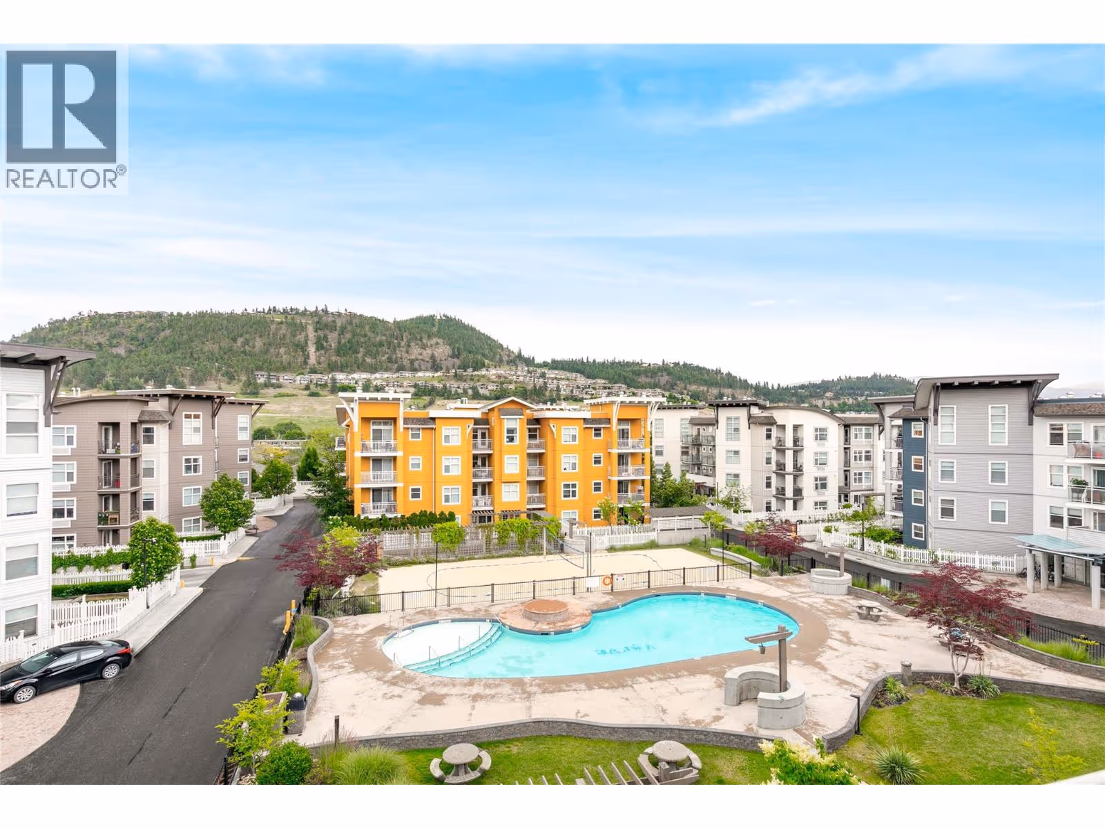 Top-floor corner unit at The Verve in a prime southeast position—quiet, private, and showcasing unobstructed views of Dilworth Mountain and the city skyline. With soaring 13-foot ceilings in the main living area, this home feels bright and spacious, enhanced by large windows that flood the space with natural light. The kitchen features granite countertops and brand-new stainless appliances, seamlessly connecting to the dining and living areas where an electric fireplace adds warmth and character. The smart floor plan includes two bedrooms on opposite sides for privacy, a versatile den, and two full bathrooms. Resort-style amenities make this community stand out: an outdoor pool, hot tub, BBQ patio with plenty of seating, gathering areas, and a dedicated dog run. Everyday living is enhanced by in-suite laundry, a storage locker, bike storage, and two secure underground parking stalls—a rare find. The Verve offers the perfect balance of quiet retreat and convenience, just minutes from shopping, dining, UBCO, and Kelowna International Airport. (id:62999)