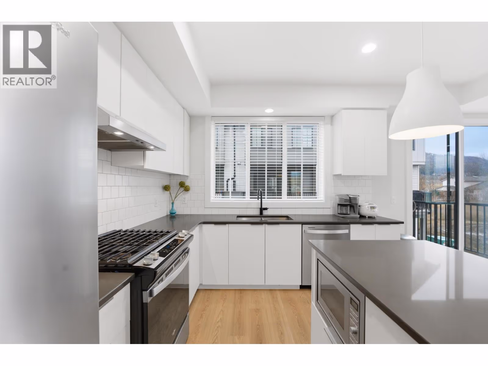 Welcome to Glen Park Row, nestled in the highly desirable North Glenmore community. This 2023-built, upgraded 4-bedroom, 3-bathroom END-UNIT townhome offers a preferred, quiet location within the complex, set back from the main road for added privacy and tranquility. Enjoy hill-side and park views along with abundant natural light from extra windows throughout. With only one shared wall, this home feels bright, airy, and private. Offering 1,500 sq. ft. of thoughtfully designed living space, the open-concept main floor features laminate flooring throughout, stainless steel appliances, and a gas range. The kitchen is enhanced with a premium pantry rollout system and ample cabinet space. Upstairs, upgraded laminate flooring continues throughout. The spacious primary bedroom includes a walk-in closet and large ensuite, while two additional bedrooms, laundry, and a 4-piece bathroom complete the top floor. The entry level features a fourth bedroom, added as an upgrade ideal for guests, a home office, or extended family. Step outside to your private, fenced outdoor space, perfect for pets, kids, or quiet relaxation. A large double garage provides generous parking and additional storage. Ideally located just minutes from downtown Kelowna, UBC Okanagan, Kelowna International Airport, and close to parks, schools, shopping, and transit, this home delivers modern comfort in one of Kelowna’s most sought-after neighbourhoods. Pet friendly! Don’t miss this one! (id:62999)