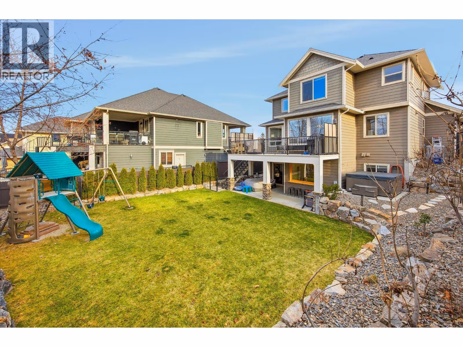 Modern 5-bed + den Kettle Valley family home! 4 bedrooms on the top floor, a den on the main, extra bedroom downstairs, and a layout that flows effortlessly indoors and out, this is a home families can grow into and love for years. The main floor is open yet defined, creating natural zones for cooking, dining, and relaxing. The kitchen is bright and beautifully finished, with stainless steel appliances, pantry for extra storage, and an eat-at peninsula with plenty of prep space. Step out to the deck, ideal for outdoor dining, with stairs leading down for backyard access. A powder room and den - great as an office, playroom, or extra bedroom - round out this level. Upstairs, the primary suite is spacious, with a walk-in closet and updated ensuite with dual vanity. 3 additional bedrooms and a full bath on the same floor, a great layout for families. Downstairs is a glassed-in gym, and rec room with a wet bar featuring a pass-through window to the backyard - perfect for hosting. With a separate entrance, bedroom, and full bath, the lower level can easily convert to a suite while still keeping the gym part of the main home. Outside is a fully fenced, flat backyard, a patio with hot tub, dog run, and plenty of room for a pool. Add in a 2 car garage, parking for 3 more vehicles, and a location in one of Kelowna’s most prestigious neighbourhoods, just steps to trails and community amenities—coffee & ice cream shops, daycare, pub, a market and more. Kettle Valley living at it's best! (id:62999)