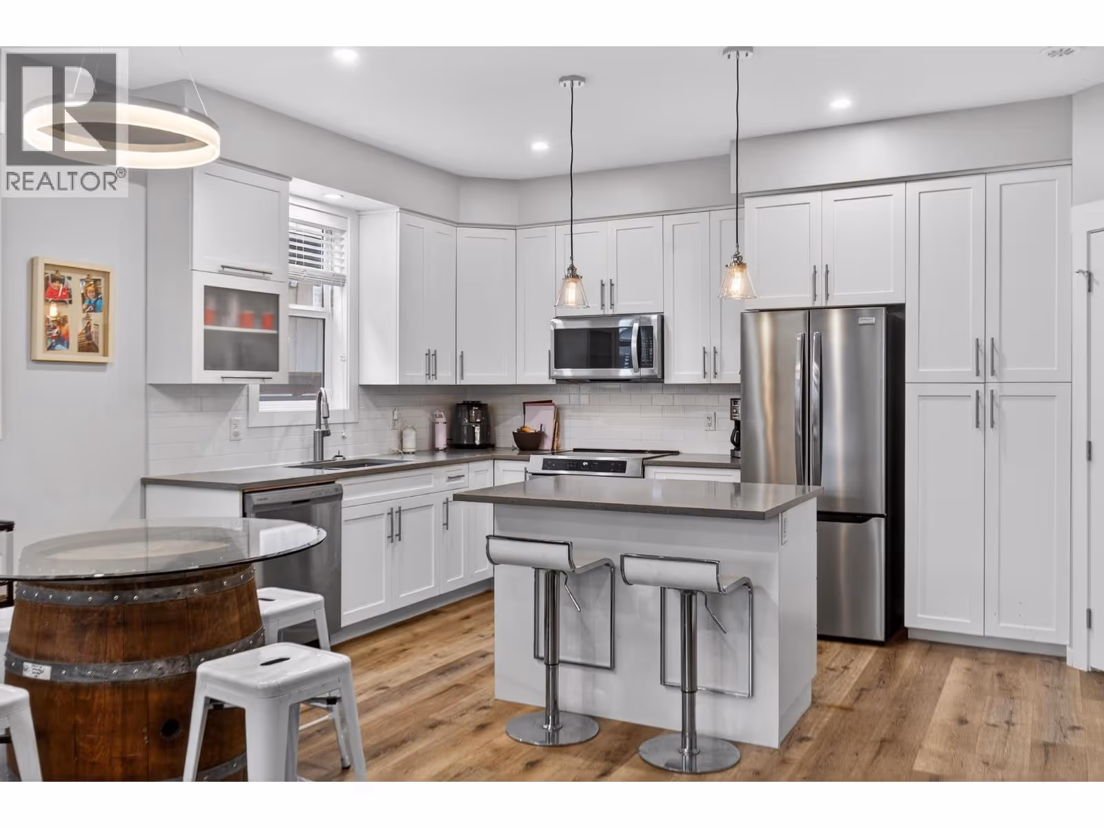 Experience stylish, low-maintenance living in this beautifully finished front unit in the heart of Kelowna South—one of Kelowna’s most desirable and walkable neighbourhoods. With no strata fees and pet-friendly living, this home is a standout opportunity. The bright, open-concept main floor showcases a modern kitchen with white cabinetry, quartz countertops, and stainless steel appliances. The kitchen is thoughtfully roughed-in for either a gas or electric range, offering flexibility for your cooking preference. The space flows into the open living room, highlighted by a cozy gas fireplace. Stylish vinyl plank flooring runs throughout, enhancing the contemporary design. Upstairs features two spacious bedrooms and two full bathrooms, plus a convenient powder room on the main level. The primary bedroom offers a spa-like ensuite and a large walk-in closet. Enjoy year-round comfort with natural gas heating, central air conditioning, and hot water on demand. Step outside to a fully fenced yard with low-maintenance SynLawn and a natural gas BBQ outlet—perfect for entertaining. A detached garage with storage above provides secure parking and extra space. Bike or stroll to Pandosy Village or downtown via direct access to the Ethel biking corridor. Beautifully maintained and move-in ready. (id:62999)