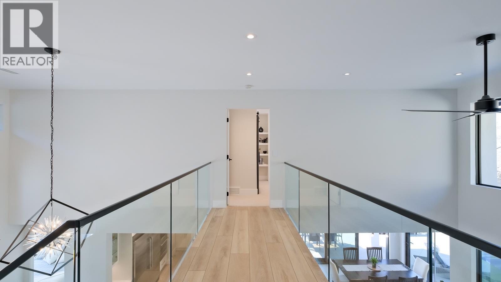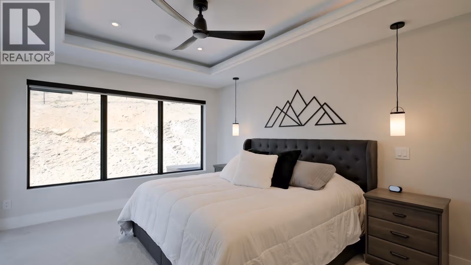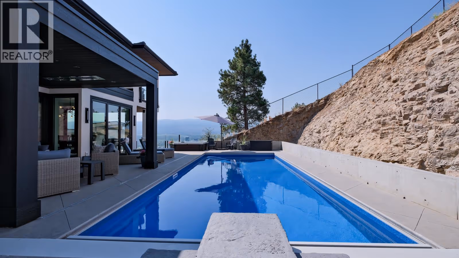 Carved into the summit of Knox Mountain, this custom smart home in Kelowna’s prestigious gated community of Highpointe offers a rare combination of architectural presence, absolute privacy, and commanding views. From its elevated perch above the city, the home captures uninterrupted sightlines across Kelowna and the surrounding mountains. Designed to blur the line between indoors and out, the great room opens seamlessly to a secluded resort-style terrace featuring a pool, outdoor living room, and outdoor kitchen; an exceptional setting for refined entertaining or quiet retreat. Thoughtfully crafted by Frame Homes, this 5-bedroom, 5-bathroom residence balances striking design with everyday livability. The primary suite is a private sanctuary with a spa-inspired ensuite, walk-in closet, and heated covered patio. Upstairs offers four additional bedrooms, an office, and a recreation space, while a separate guest room with ensuite below provides ideal privacy. The flexible layout allows for conversion to a main-level primary suite if desired. Step directly from the oversized triple garage onto Knox Mountain’s renowned trail network, or reach downtown in minutes- a rare fusion of alpine tranquility and urban convenience. Set within one of Kelowna’s most exclusive hillside enclaves, this is elevated living in every sense - where luxury meets landscape (id:62999)