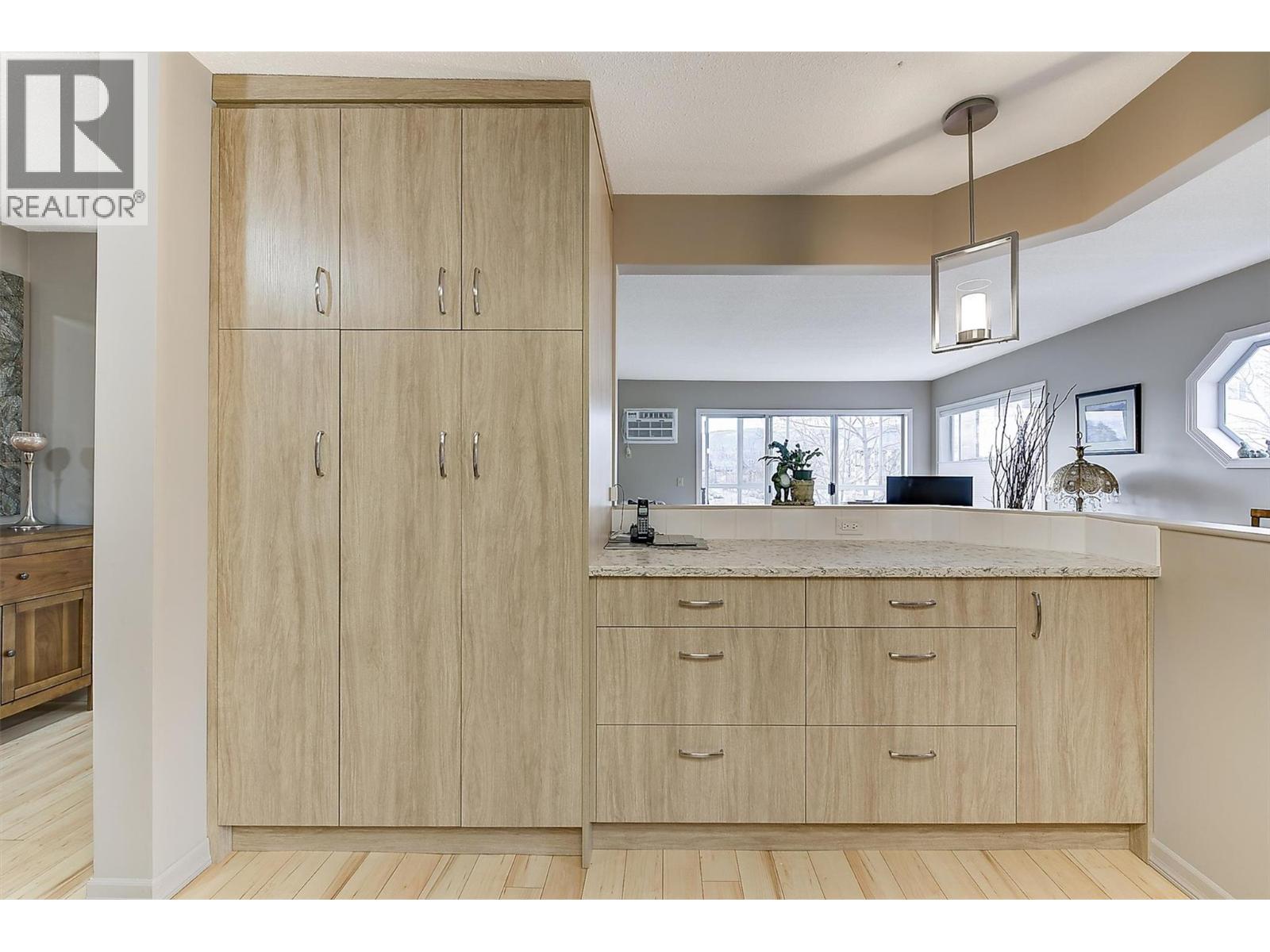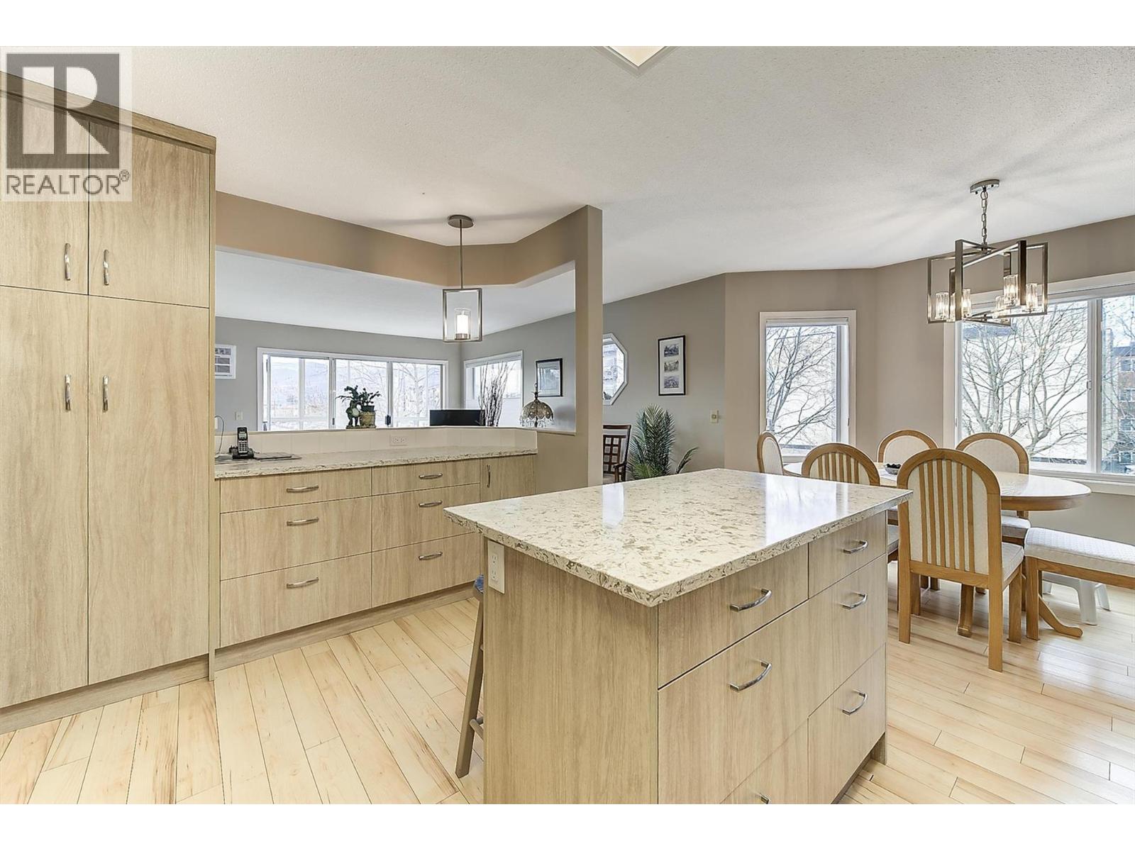 MOVE-IN READY! This beautifully updated condo is waiting for you to call it home. Immaculately maintained and tastefully renovated, this bright corner suite in the sought-after Gables building is perfectly located in the heart of Kelowna — enjoy the convenience of nearby amenities all within walking distance. Large west- and north-facing windows fill the home with natural light, creating a warm and inviting atmosphere throughout. Dining room and bedroom windows have been updated, further enhancing comfort and efficiency. The stunning kitchen has been thoughtfully updated with new cabinetry, quartz countertops, stainless steel appliances, including a dual oven, and ample storage space — perfect for cooking, baking, and entertaining. Extensive interior upgrades include painted ceilings, updated light fixtures, new baseboard heaters, a new air conditioner, built-in vacuum system, new blinds throughout, plus roller blinds on the enclosed deck, new toilets in both bathrooms, a refreshed ensuite featuring a new vanity, countertop, mirror and tub surround, and new carpets in the bedrooms. The spacious enclosed balcony offers a cozy year-round space to enjoy your morning coffee or grow your favourite flowers. This home features two generous bedrooms and two bathrooms, including a primary suite with double closets and a relaxing ensuite with a jetted tub. The strata has completed major updates, including a new roof, new hot water heaters, and an elevator replacement approximately five years ago — adding long-term value and peace of mind. An exceptional opportunity in a prime central location. (id:62999)