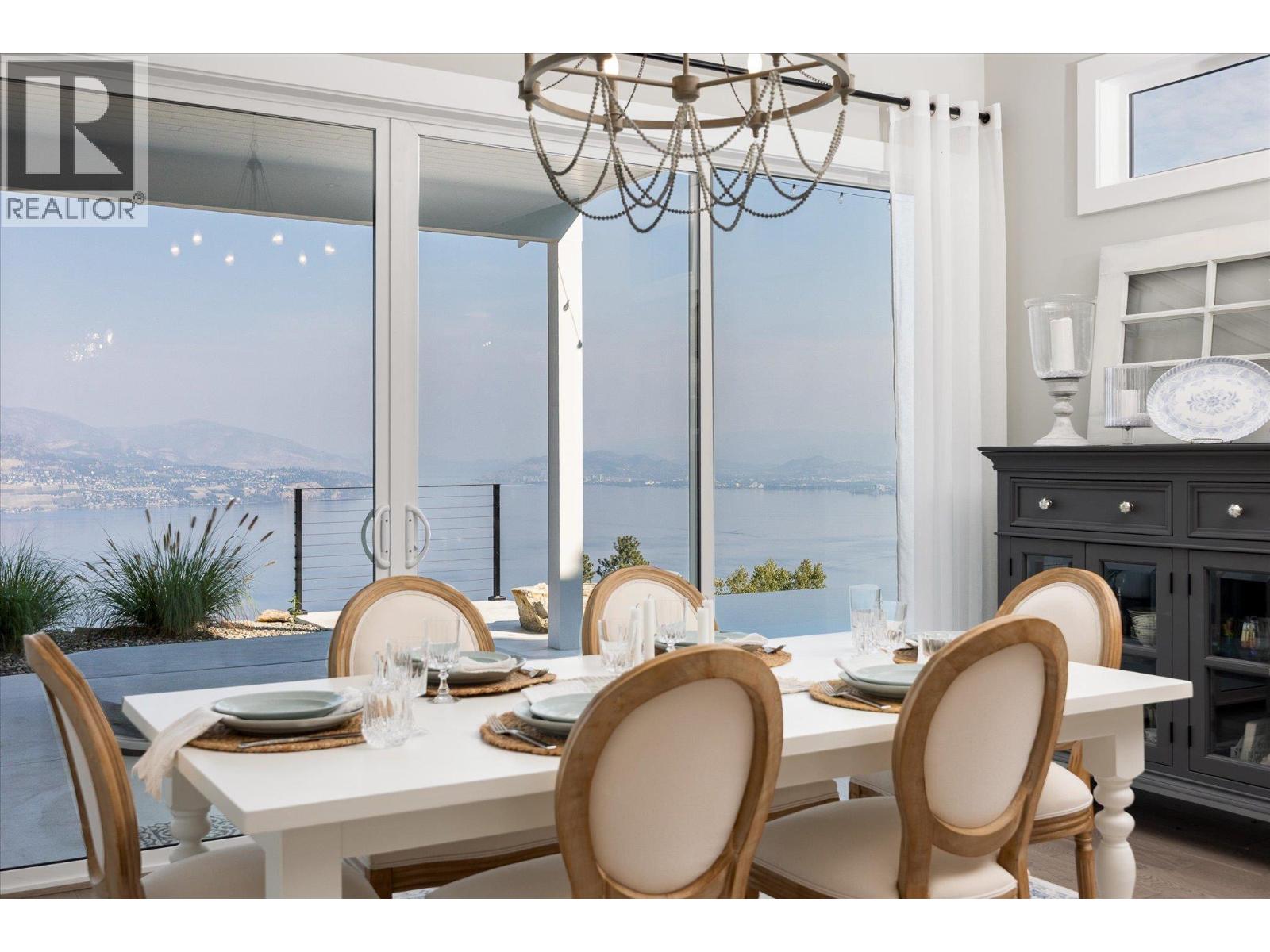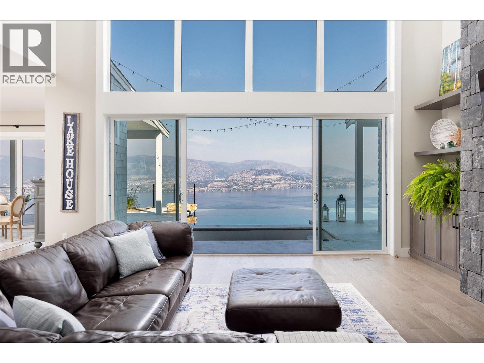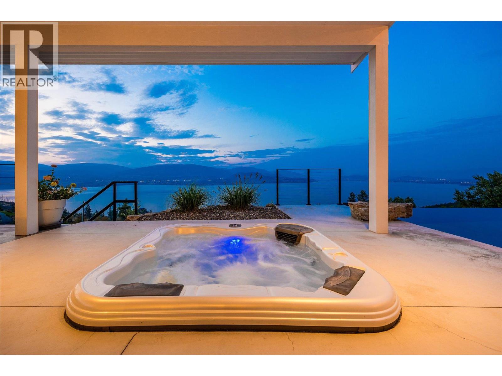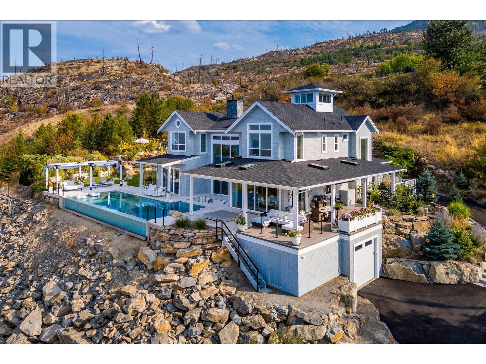 The best view in Kelowna. 2019-built four bedroom, five bathroom, 5,100+ square foot Modern Hamptons residence perched on a 5.129-acre lot in the Upper Mission area of Kelowna! Upon entering the property, you're greeted with your substantive driveway that carves through the rock, creating a unique estate feel. The grounds include substantial mature landscaping, a custom greenhouse/garden area, a large 30'x60' open-air structure at the top of the property (Wedding venue, workshop conversion, greenhouse, etc), a waterfall & pond feature at your central entry, and several raised planter bed areas; a rare property where even the garden gets a view. Upon entering the home, you are greeted with soaring 20 foot ceilings in the living room that flow straight ahead to the infinity pool that blends into Okanagan Lake ahead. The main floor offers this stunning living room, a kitchen with a pass-through to the outdoor BBQ area, and a dining room with perfect indoor/outdoor transitions. The master on the main offers the same panoramic views, and a five piece private ensuite. The main floor is finished off with a powder room, laundry, and an additional bedroom/office. Upstairs via the floating staircase are two complete master bedrooms with their own en-suites, as well as a private ""perch"" one further level up as a viewpoint. Downstairs, there is a tandem-car garage and a full recreation room that features a bar, room for a pool table, a full bathroom, and a private, fully outfitted theatre room. Outdoor amenities include the covered deck with heaters, BBQ area, hot-tub, tiled infinity pool, and sunken fire pit with seating area. This property uniquely has the modern features of a high-end residence but with over five acres, stunning views, full privacy, and extras like the detached structure, and plenty of uncovered parking. (id:62999)