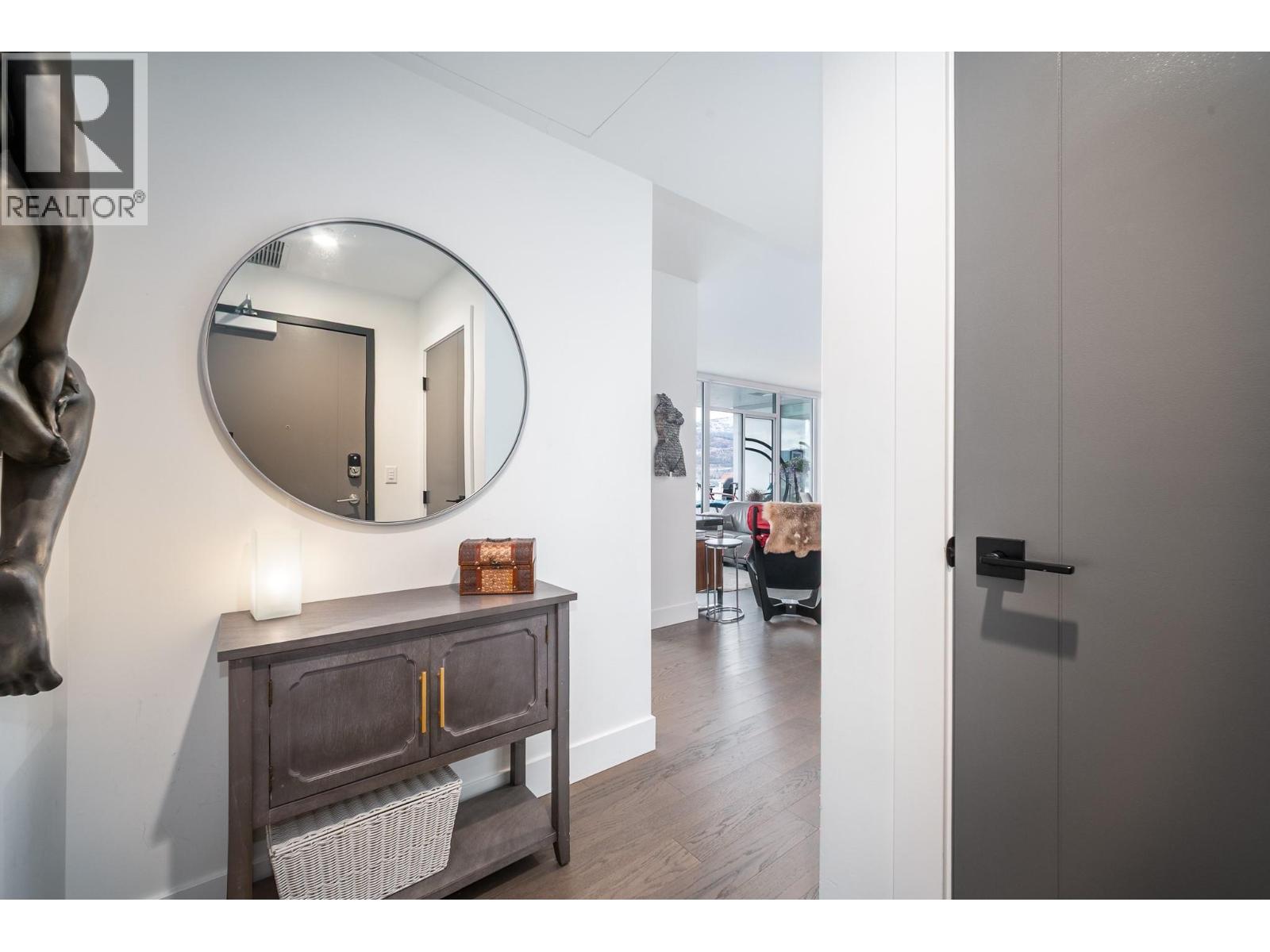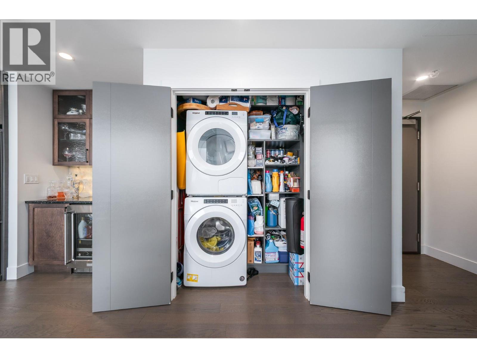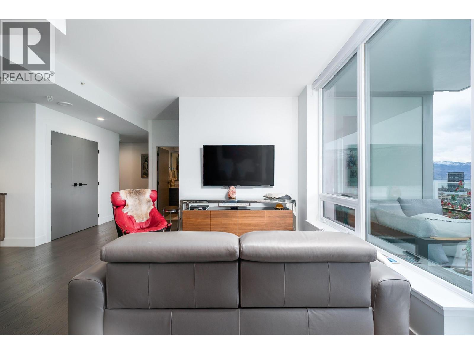 Perched on the 21st floor, this upgraded residence offers exceptional privacy and sweeping views from a large outdoor deck designed for entertaining and relaxation with a natural gas outlet and a truly unobstructed vantage point — a rare combination of elevation, privacy, and outdoor living. Inside, oak hardwood floors and floor-to-ceiling windows create a bright, refined living space that seamlessly blends modern design with smart functionality. The kitchen is a standout with waterfall-edge counters, granite sink, gas range, KitchenAid appliances and combi oven. A built-in bar with dual-zone KitchenAid beverage fridge adds an entertaining hub with a striking LED backlit onyx backsplash. Smart home features are integrated throughout, including touchscreen controls for lighting and music, along with built-in ceiling speakers in the kitchen and primary bedroom. Extra insulation along common walls enhances comfort and quiet. The primary suite offers a spacious walk-in closet and a stylish 3-piece ensuite with glass and tile shower. A generous second bedroom features large floor-to-ceiling windows and a full closet. The main bath includes a 4-piece layout with tile surround to the ceiling. Additional highlights include stacked laundry with added storage, and thoughtful upgrades throughout that elevate everyday living. Resort-style amenities including two pools, hot tub, fitness club with gym and yoga studio, pickleball court, dog park, BBQ and fire pit areas, and more! (id:62999)