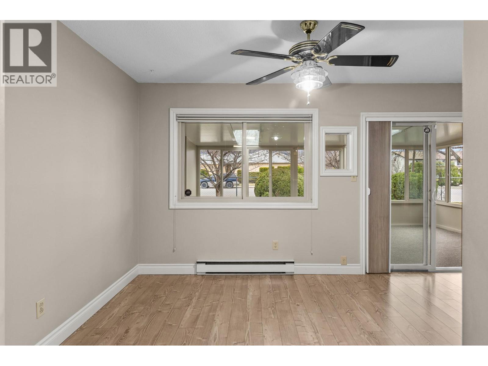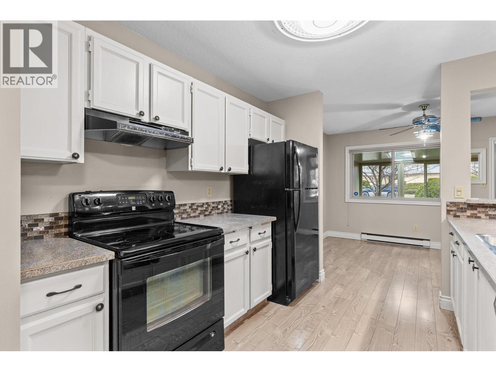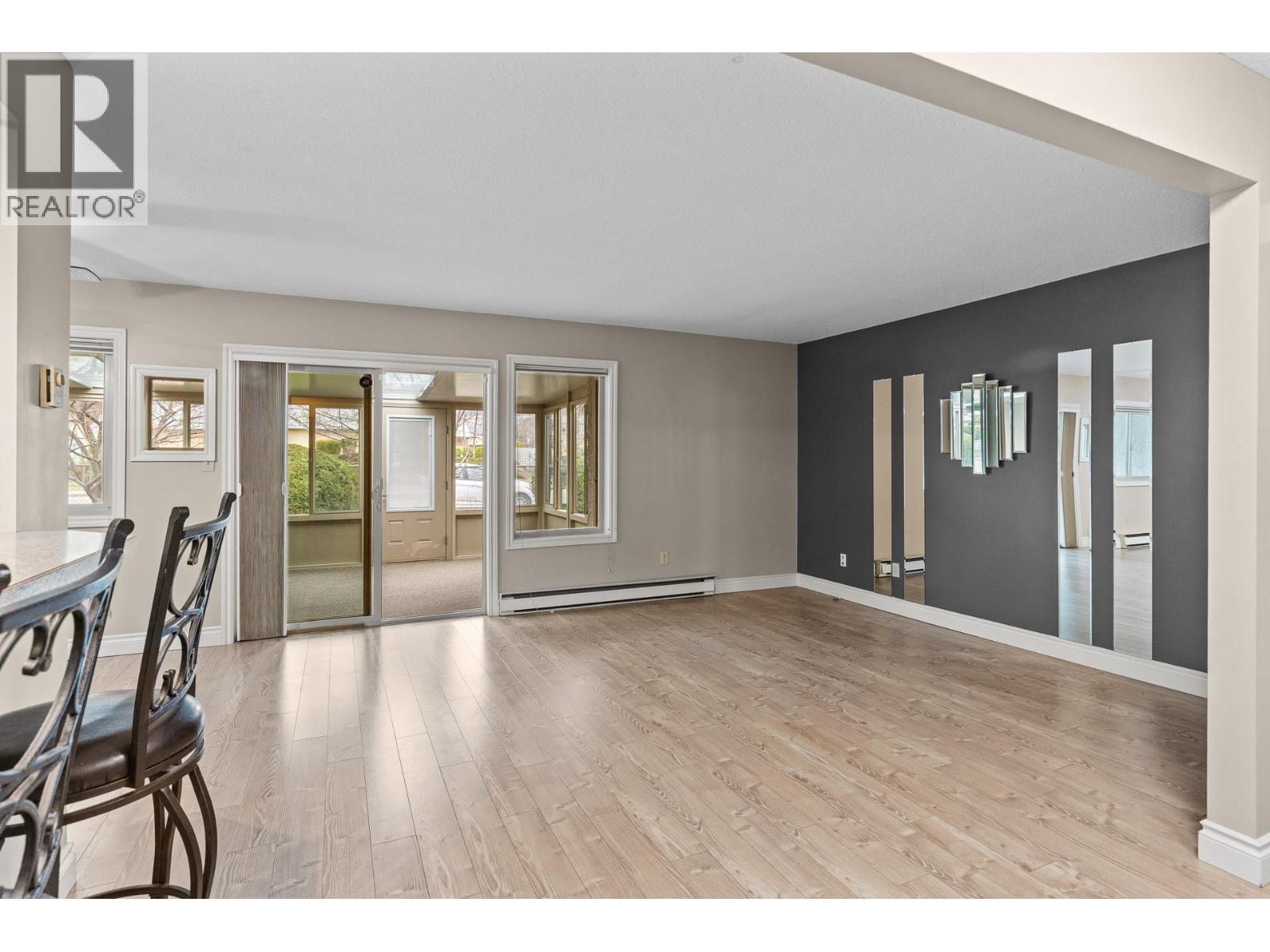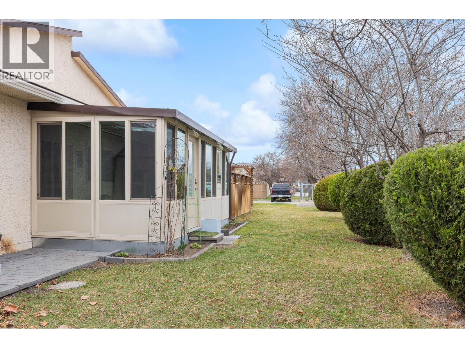 OPEN HOUSE Saturday the 28th 2pm-4pm....Beautifully Updated Rancher Townhome – A True Gem! Bright end unit offering exceptional privacy and natural light, this spacious 2 bedroom, 2 bathroom level-entry, one-story 55+ adult-oriented townhome offers approximately 1,400 sq. ft. of living space including the sunroom—one level living like this is so rare to find! Ideally located within walking distance to shopping, transit, and the Mission Creek Greenway, with a convenient bus route nearby. This home features a hard-to-find open floor plan, laminate flooring, updated trim, newer windows, a newer roof, no Poly B plumbing, and a newer hot water tank, with sunny south-facing exposure perfect for relaxing or entertaining. An absolutely amazing 300 sq. ft. quality-built sunroom adds exceptional living space and includes access to a crawl space and storage area, plus a door leading to the adjacent storage unit complete with a seating area. The updated kitchen showcases black appliances, while the expansive living and dining area offers a sliding glass door to the outdoor space. Enjoy two generous bedrooms, including a king-sized primary with walk-in closet and 3-piece ensuite, a full 4-piece main bathroom with skylight, a separate laundry and storage room off the entry, and covered parking, plus tons of visitor parking including a convenient space right at your door. Such a unique and special opportunity in a well-maintained community. PET RESTRICTIONS: 1 cat or 1 dog under 16'! (id:62999)