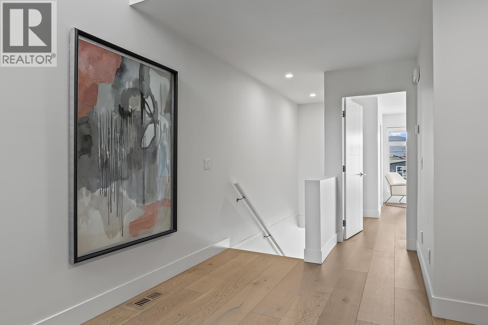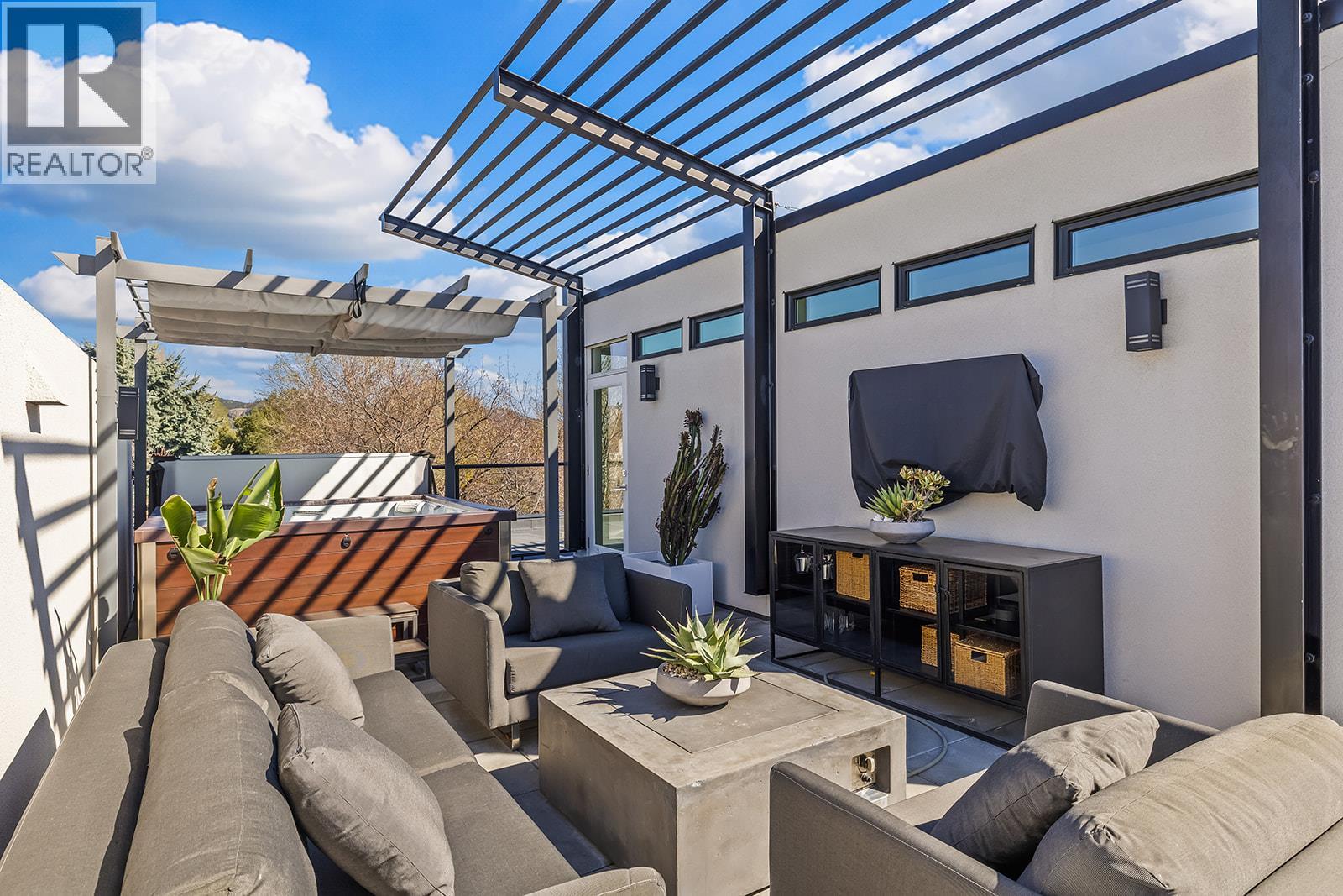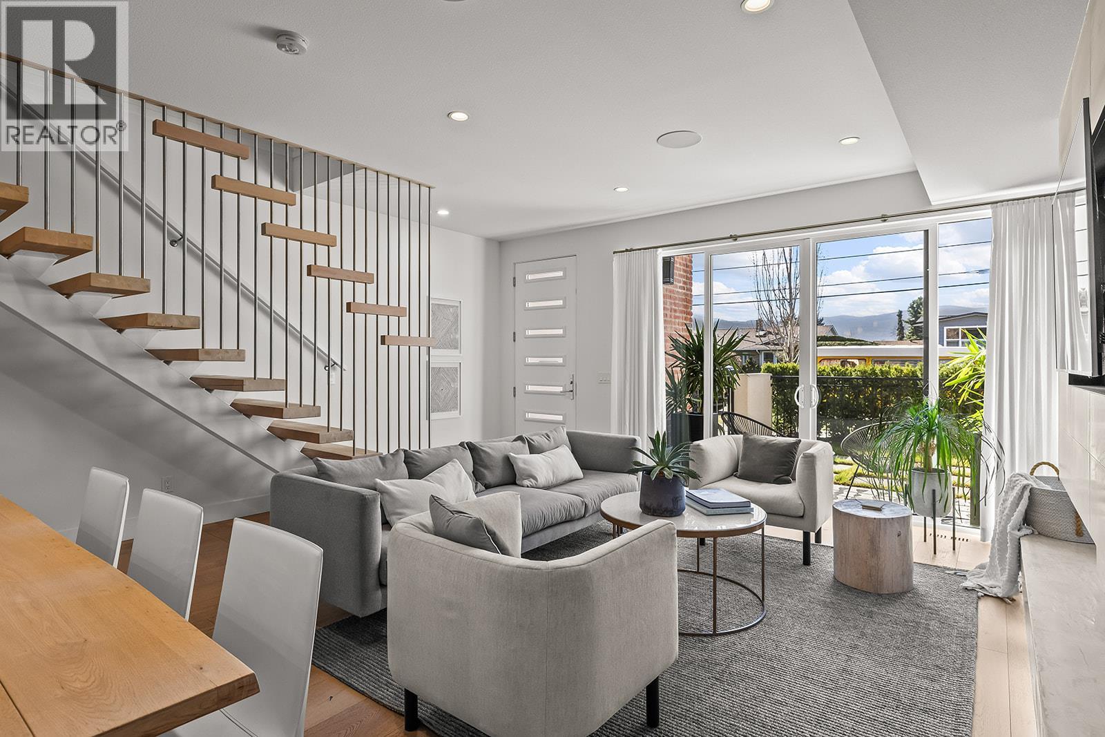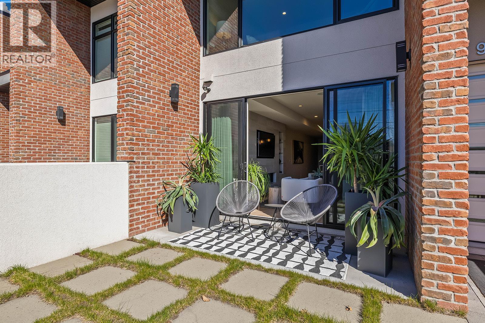 Welcome to this contemporary, modern townhome offering an exceptional lifestyle and is perfectly situated. This property features three bedrooms and three bathrooms with 1914 square feet of bright, open interior living space and an additional 452 square feet of private outdoor space. The main floor boasts a grand level entry and an open-concept layout, ideal for entertaining. The kitchen is fully equipped with stainless steel appliances and features flat-panel cabinets and premium quartz countertops, which are featured throughout the home. The second level is thoughtfully designed for comfort and convenience, housing all three bedrooms, a lounge/family room, and laundry space. The luxurious primary suite includes a walk-in closet and a five-piece ensuite bathroom with a modern glass shower and a soaker tub. The two additional bedrooms are ideal for family or guests and share a full bathroom equipped with a double vanity. They also have their own patio doors leading to a private, quiet covered deck. One of the standout features of this property is the extensive outdoor space: a front patio, a private rooftop patio and covered deck off the spare bedrooms making it perfect for exceptional outdoor entertaining, enjoying Okanagan evenings and mountain views. If you need space for your toys and storage, this home features an attached double garage and an easily accessible crawl space for extra storage. Ideally located, this sought-after neighborhood is perfect for walking or biking to local amenities, including beaches, parks, shopping, transit, and Downtown Kelowna. Pets are allowed with restrictions. (id:62999)