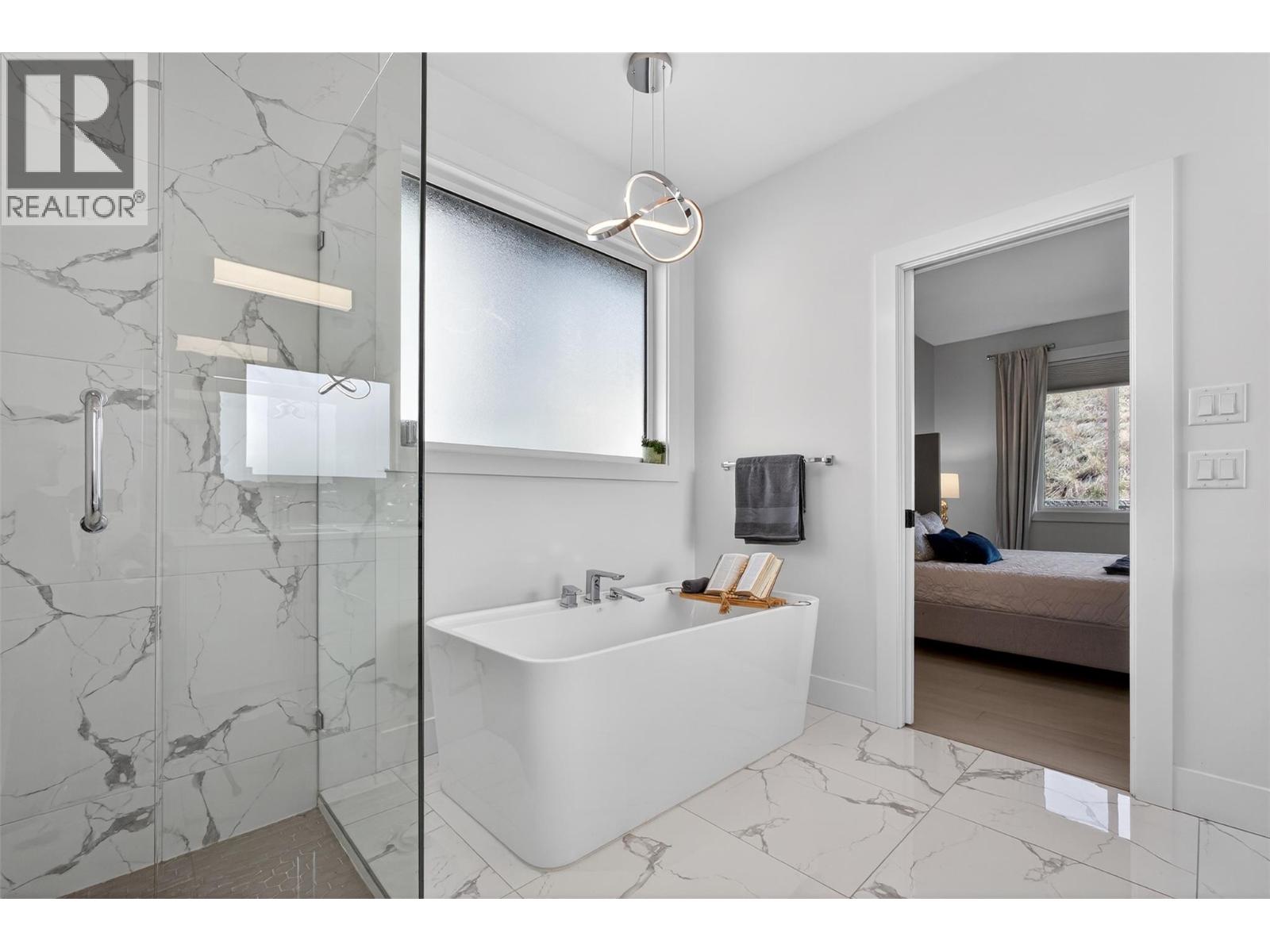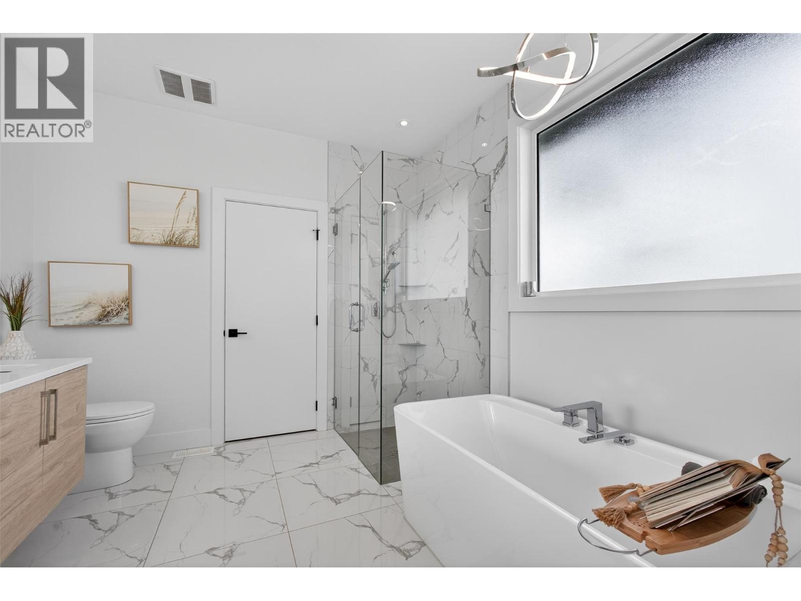 Located in the highly sought-after Wilden neighbourhood is a custom-built rancher with a 2-bed LEGAL suite blending upscale living with everyday practicality. Offering 5 bedrooms, 3.5 bathrooms, and over 3,600 sq ft, this home is perfectly suited for families who value space, style, and flexibility.The main level has a thoughtful design and high-end finishes throughout, featuring a bright open-concept layout with vinyl plank flooring and large windows that flood the home with natural light. The kitchen is a true standout, complete with quartz countertops,sleek black cabinetry,S/S appliances, a gas stove, and a massive 7.5 ft island—perfect for cooking and entertaining. The dining area and living room with a gas fireplace create a warm, inviting space for everyday living.The primary bedroom is a true retreat, featuring a walk-in closet and a stunning 5-piece spa-like ensuite.Downstairs,there is a family room which then also connects the legal suite. The self contained suite offers the option to function as a 1 or 2-bedroom layout, giving you flexibility to retain a fifth bedroom for the main home if desired.The fully fenced backyard complete with irrigation, a covered patio, and hot tub—ideal for relaxing while kids and pets enjoy the yard. Located close to schools,parks,UBCO,airport not to mention a future shopping centre coming soon to The Ponds.This location offers both convenience and lifestyle and will check every box to elevate your everyday living. (id:62999)