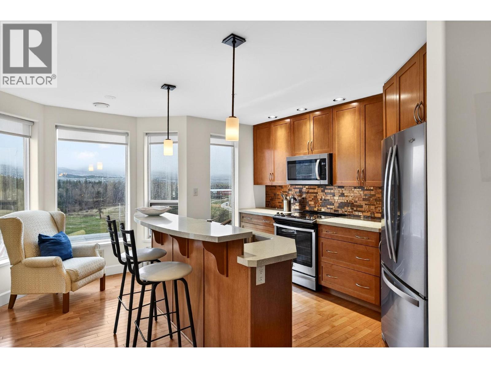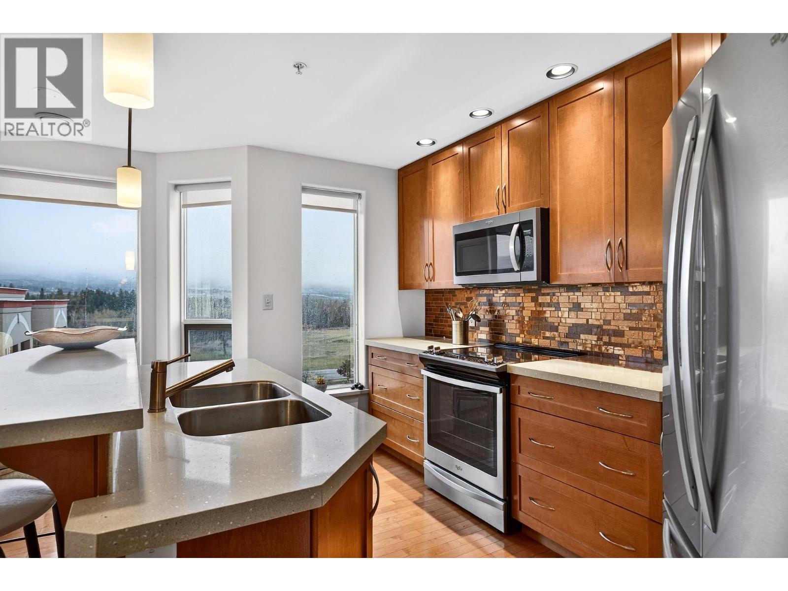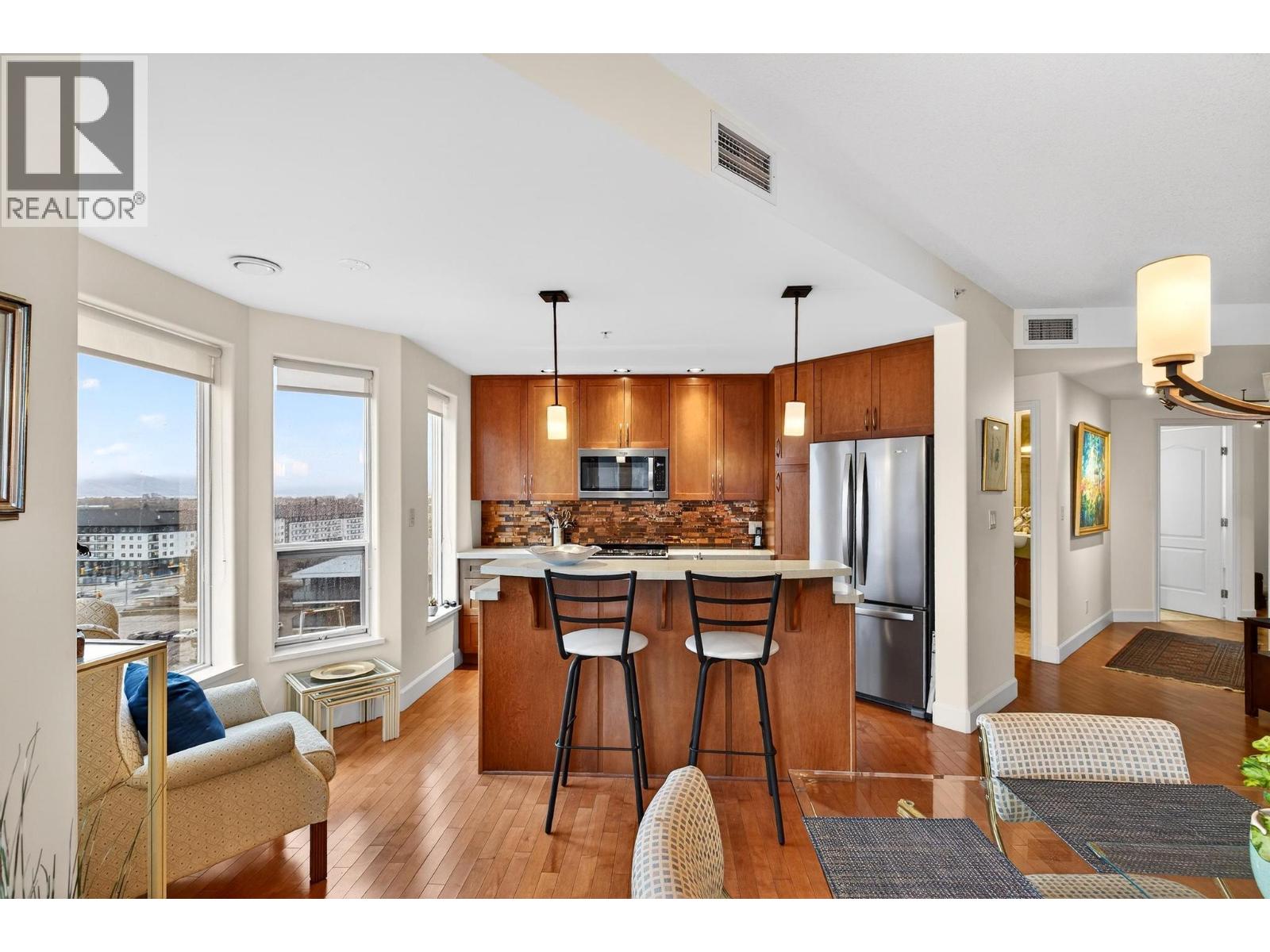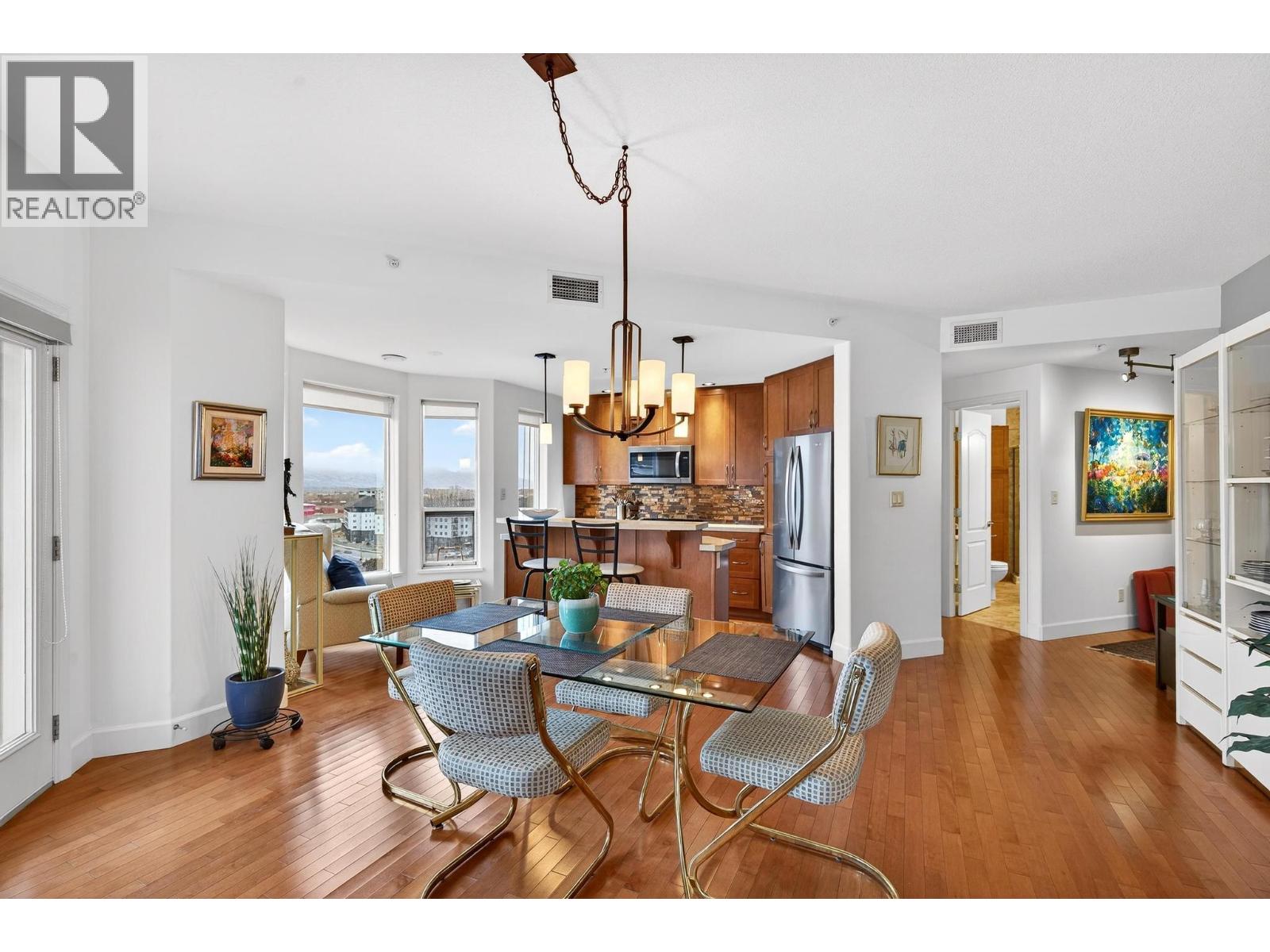 Elevated above it all, this exceptional corner residence at Park Place offers a level of space, light, and views that is rarely found in Kelowna condo living. Perched on the 10th floor south east corner of Park Place, this 1,335 sq ft 2 bed 2 bath plus den suite captures sweeping lake and valley views through walls of windows that flood the home with natural light, while staying cool and comfortable through Kelowna’s long summers with central heating and cooling throughout. 2 side by side underground parking stalls and 3 oversized storage lockers, including one conveniently located on the same floor. Inside, the open concept layout is finished with maple hardwood, a granite island, stainless steel appliances, upgraded lighting, and a gas fireplace that anchors the living space. The spacious primary bedroom features a walk in closet and a well appointed ensuite with a double vanity and soaker tub, offering a comfortable retreat at the end of the day. Park Place elevates the lifestyle with resort style amenities including a pool, hot tub, fitness centre, theatre room, library, pool table, woodworking shop, tennis court, car wash, and guest suite, all within a solid concrete and steel building. The location completes the package. Steps to Costco, a short walk to Mission Creek Greenway, minutes to Orchard Park Shopping Centre, and a quick drive to downtown Kelowna’s beaches, restaurants, and cultural district. (id:62999)