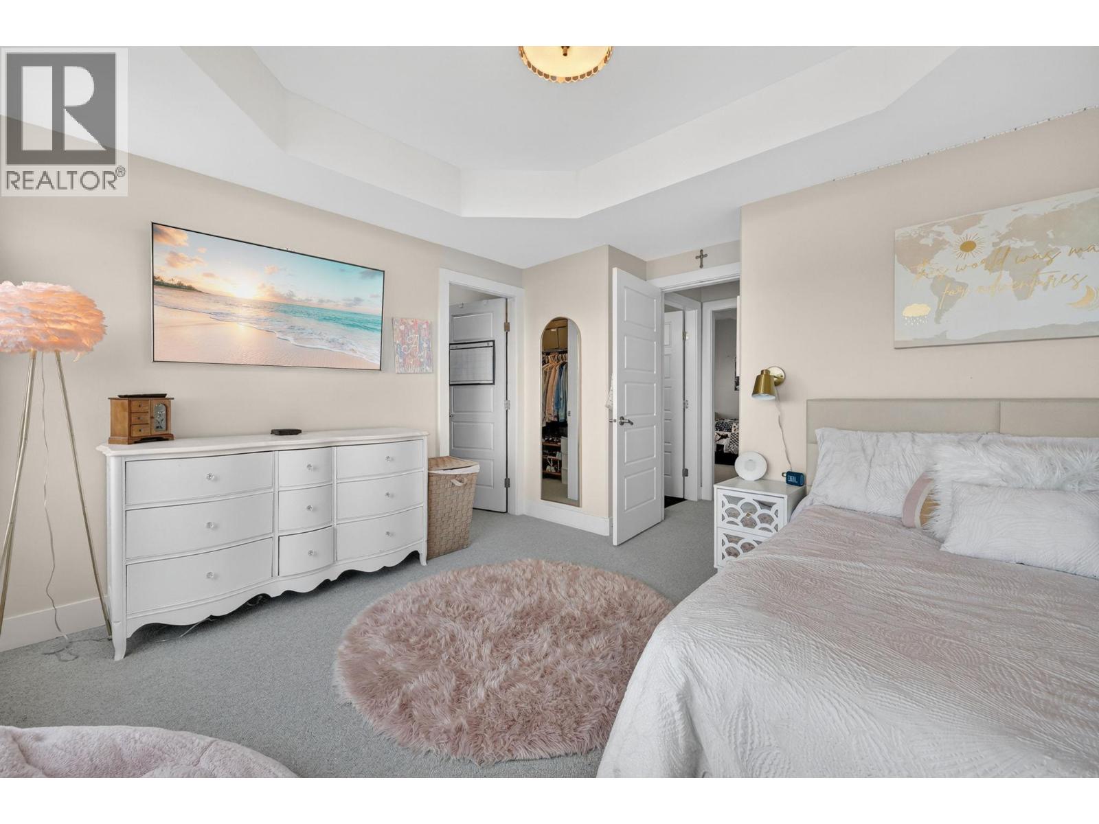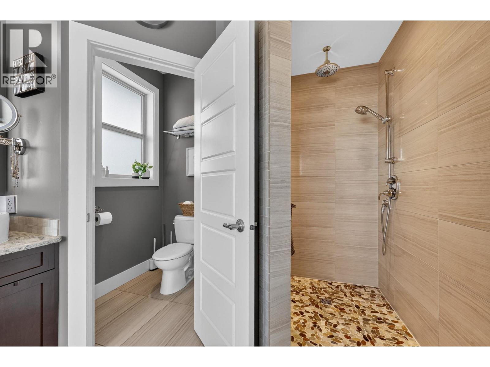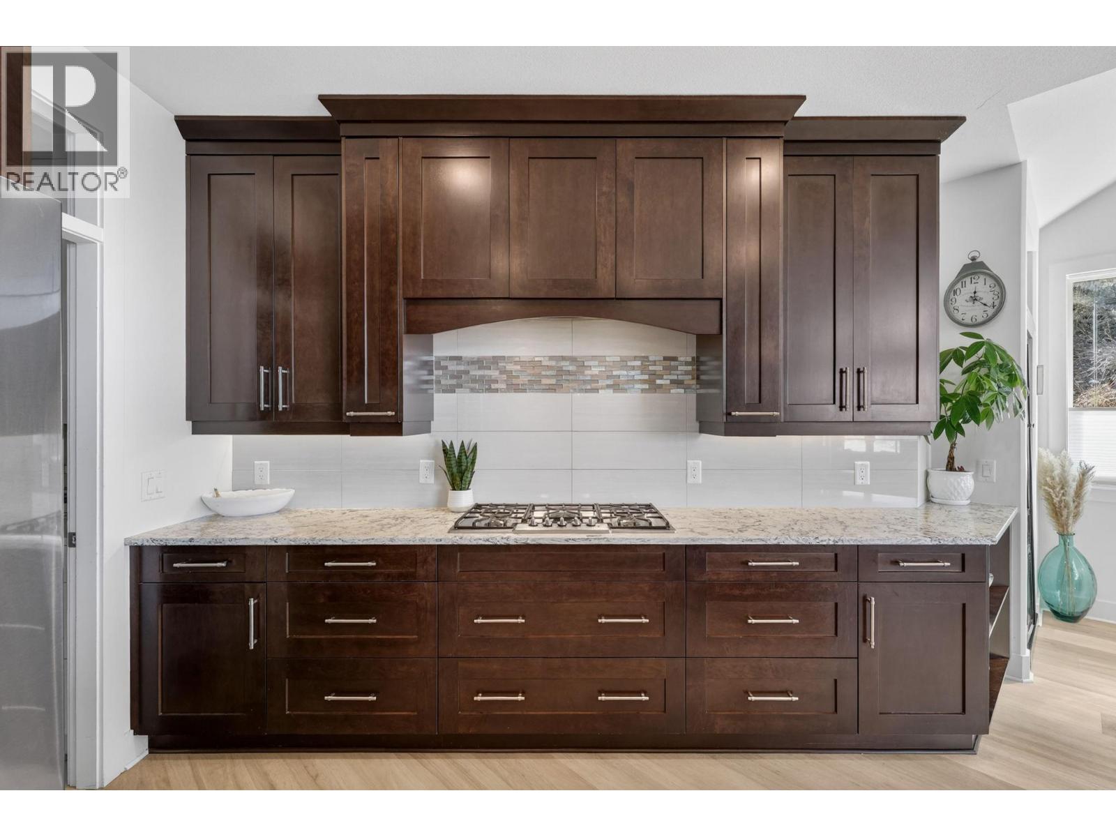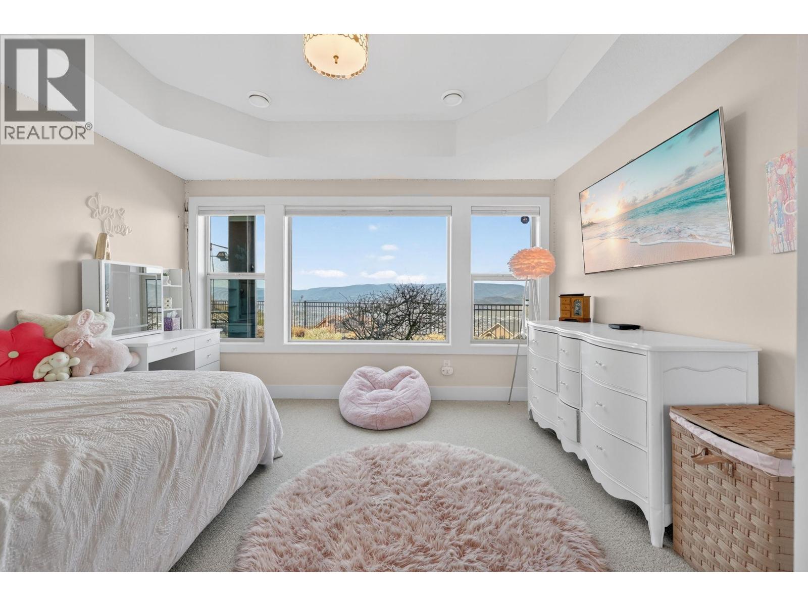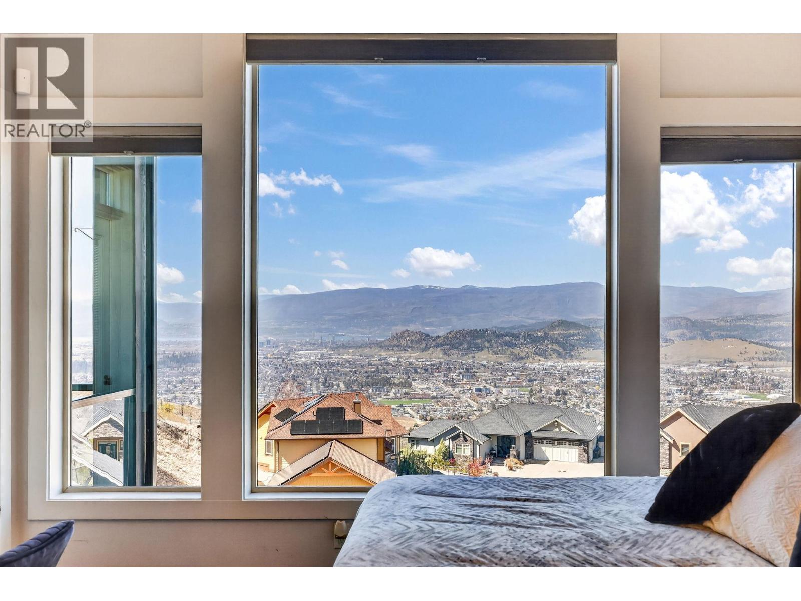 Custom-built walkout rancher in a quiet cul-de-sac in the Blue Sky community at Black Mountain. Set on nearly ½ an acre and nestled into the hillside, this ultra-private 4 bed, 3 bath home offers sweeping lake, city, and valley views, with protected land beside for added privacy and wildlife sightings. The main level features an open plan with 16’ ceilings, exposed beams, gas fireplace, and floor-to-ceiling windows. The kitchen includes built-in Bosch appliances, double wall ovens, a 5-burner gas cooktop, full-height cabinetry, and a butler’s pantry. Step onto the wraparound deck to take in sunsets and city lights. The primary bedroom has 12’ vaulted ceilings, deck access, and a 5-piece ensuite with heated floors. Downstairs offers a large family/rec room with gas fireplace, wet bar, and walkout access to an Arctic Spa saltwater hot tub. The yard is fenced, pool-sized, with extra gravel parking for RV/boat, including sani-dump and power. Oversized double garage (23’/29’ bays) includes workshop space. Additional features: climate controlled wine cellar with tasting room (850 bottles), Sonos sound on both levels, updated luxury vinyl plank flooring on main level with wool carpet in lower level, synthetic turf in front and rear yards, and upper deck gas fireplace. Located close to Black Mountain golf course, Walking trails, and recreation, with easy access to Big White and 20 minutes to Downtown Kelowna. (id:62999)
