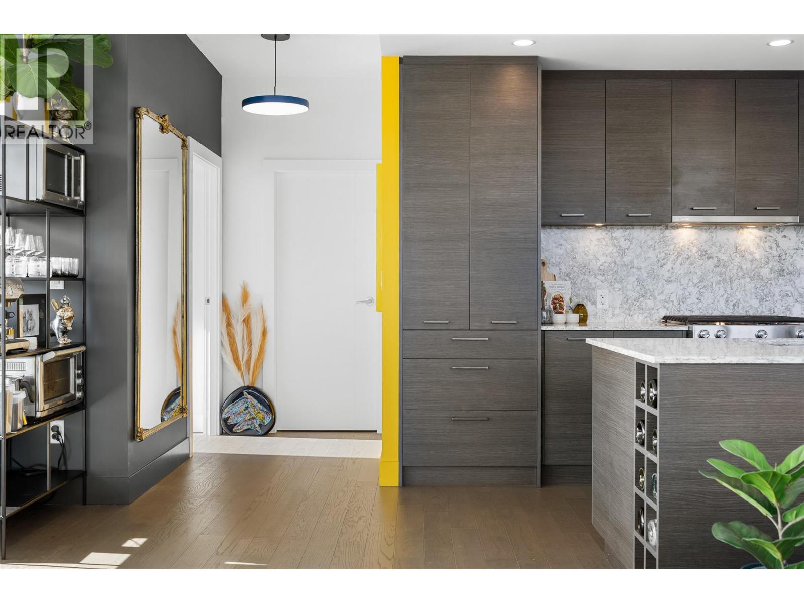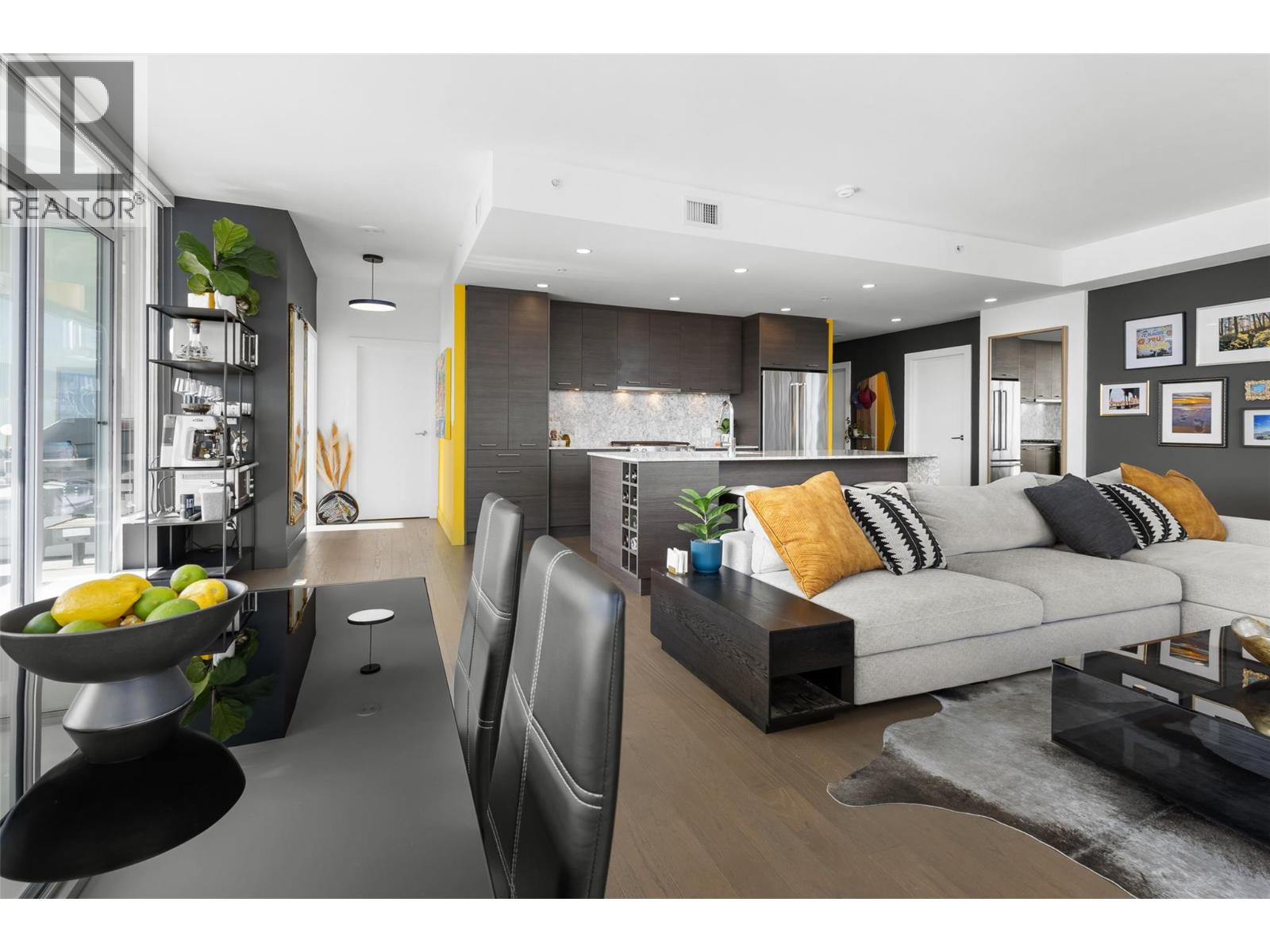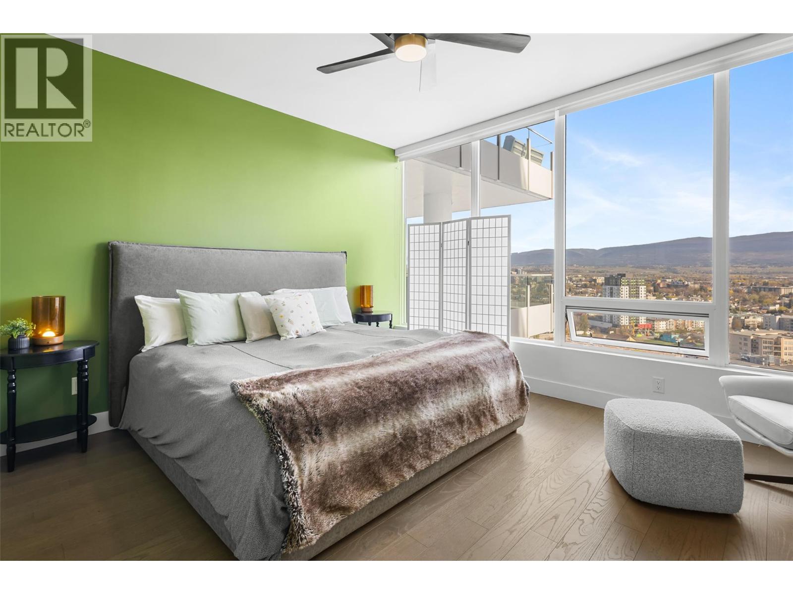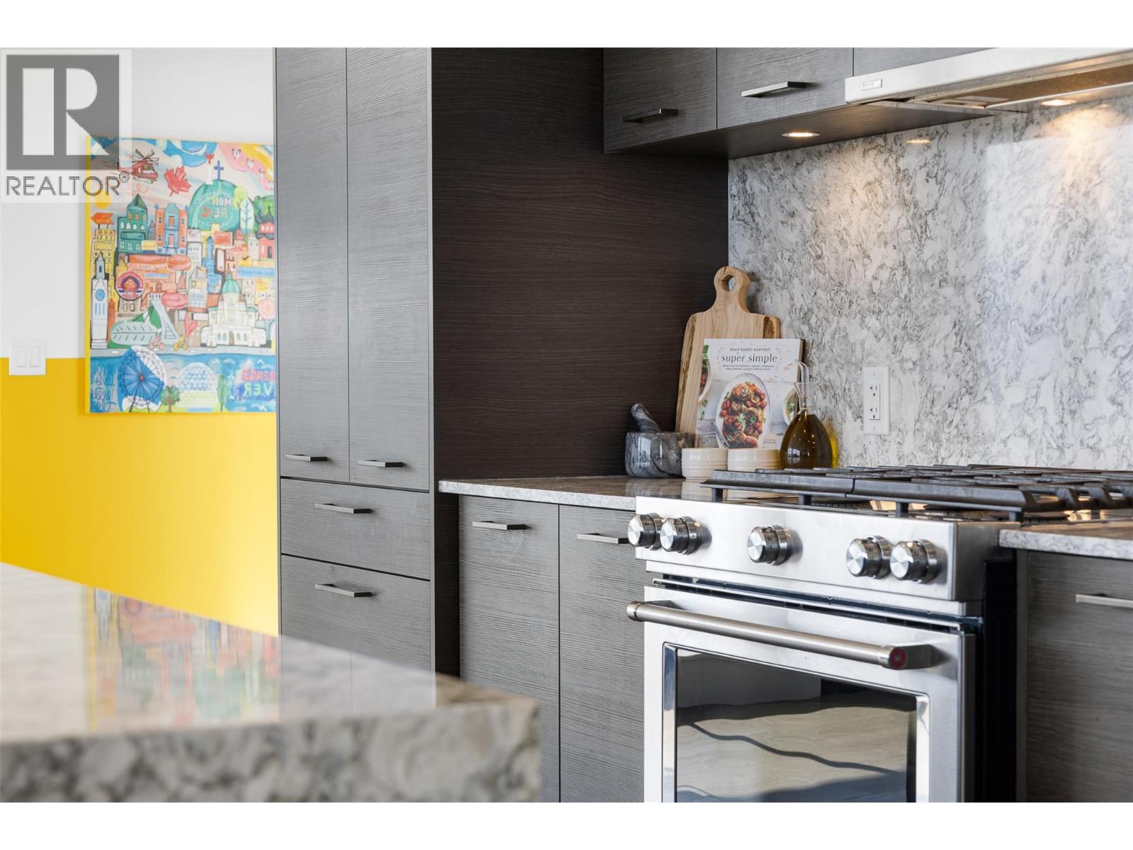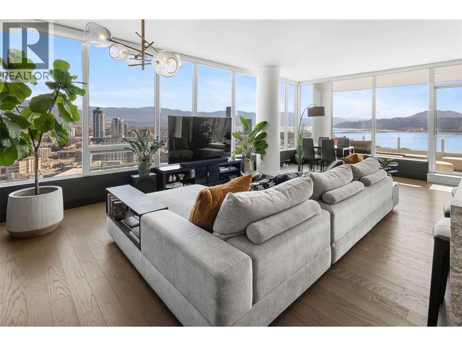 Experience elevated downtown living from this exceptional high-rise residence at One Water Street. Perfectly positioned to capture sweeping east-to-west views, this home showcases an ever-changing backdrop of Okanagan Lake, the bridge, mountains, yacht club, and vibrant city skyline. Designed with both comfort and style in mind, the open-concept layout offers over 1300 sq ft of thoughtfully curated living space, framed by expansive floor-to-ceiling windows that flood the home with natural light. The gourmet kitchen is a true showpiece, featuring premium KitchenAid stainless steel appliances, a gas range, quartz countertops, and a waterfall island, ideal for entertaining. Step outside to the spacious covered deck, complete with a gas BBQ hookup, the perfect setting for relaxing or hosting against a stunning panoramic backdrop. The primary suite is generously sized to accommodate a king bed and includes dual closets along with a spa-inspired ensuite featuring a walk-in tiled shower. A second bedroom, den, and ample in-suite storage provide flexibility for guests, a home office, or additional living space. Residents enjoy access to resort-style amenities including 2 pools, a hot tub, fully equipped fitness centre, pickleball court, fire pit lounges, guest suites, EV charging, and more. Located just steps from the beach, Cultural District, breweries, restaurants, shops, and Prospera Place, this is true walkable urban living. (id:62999)