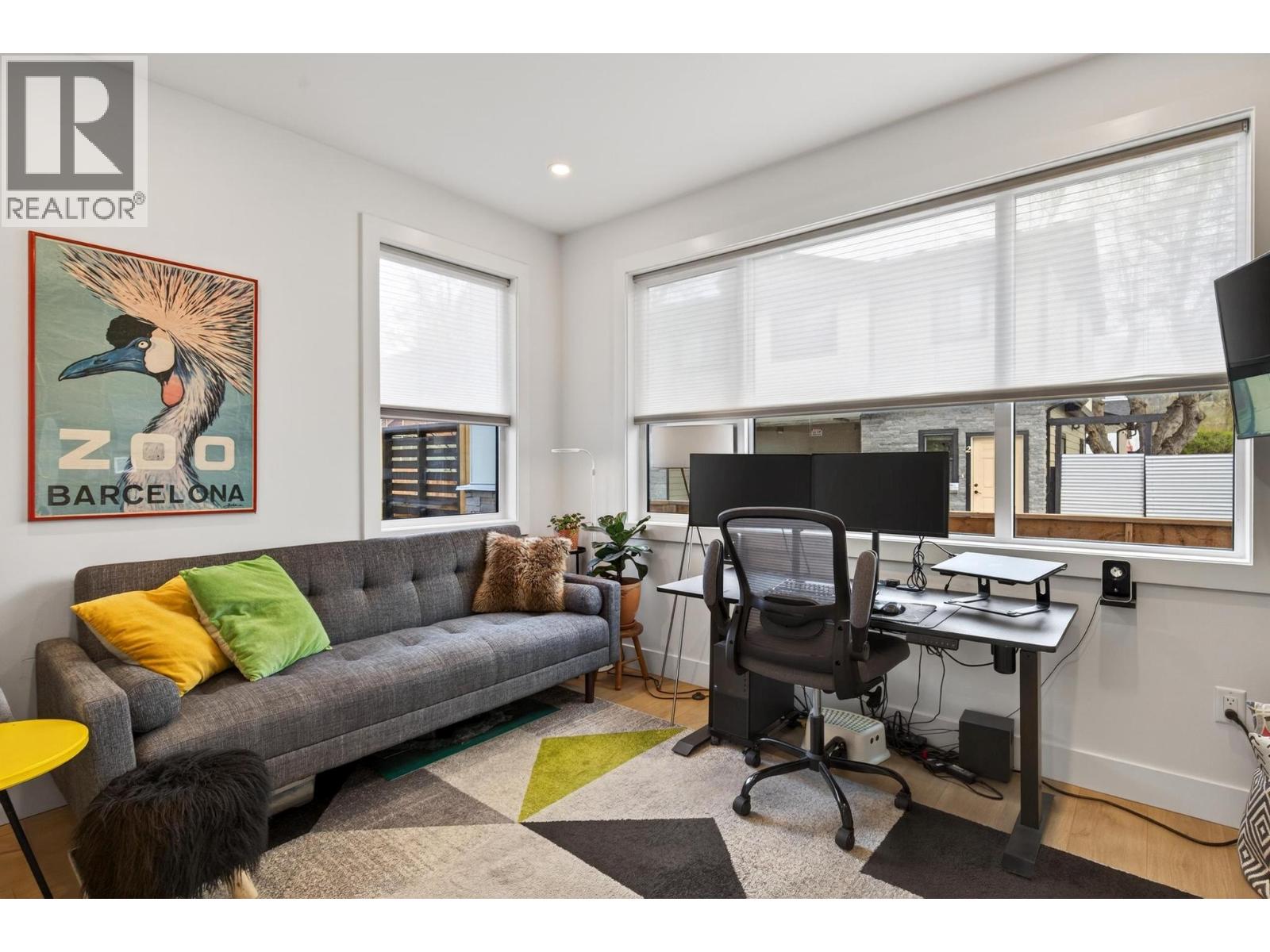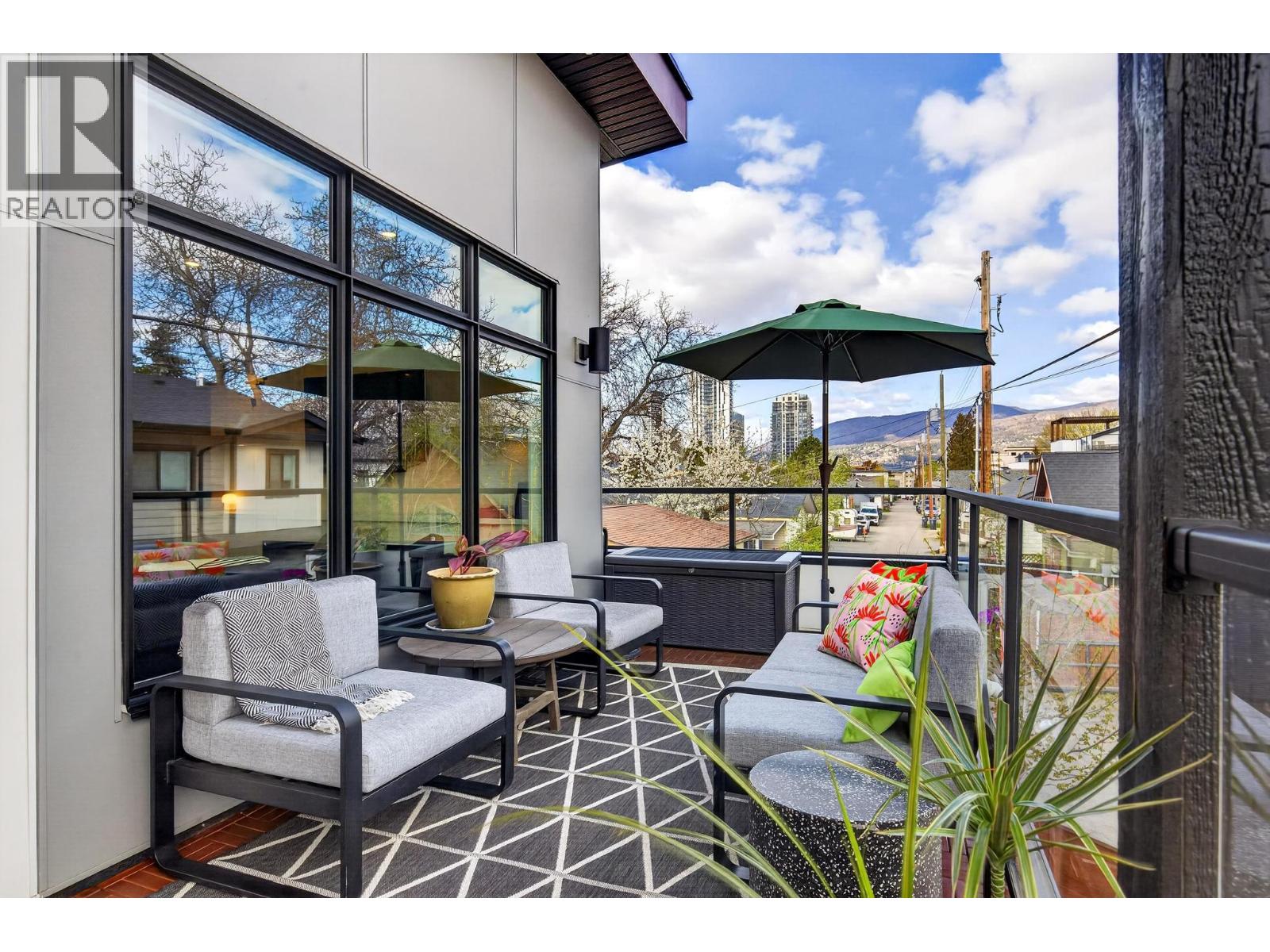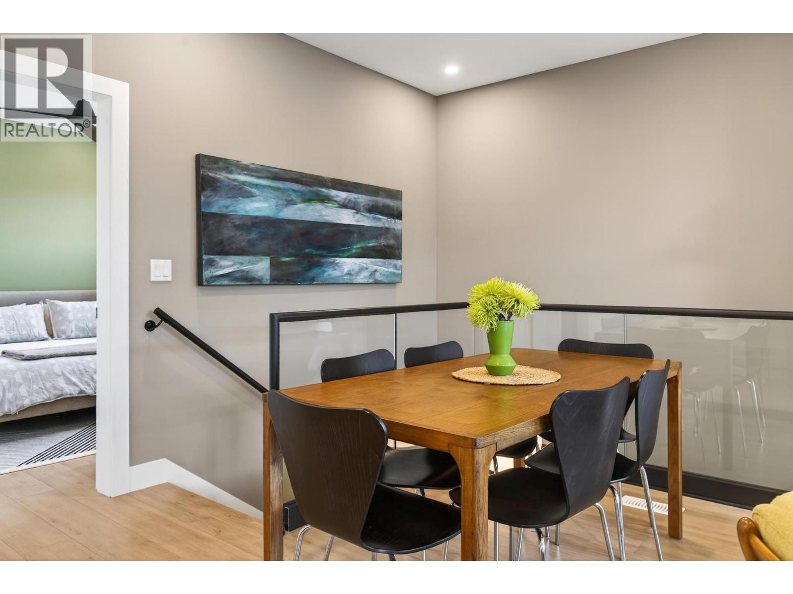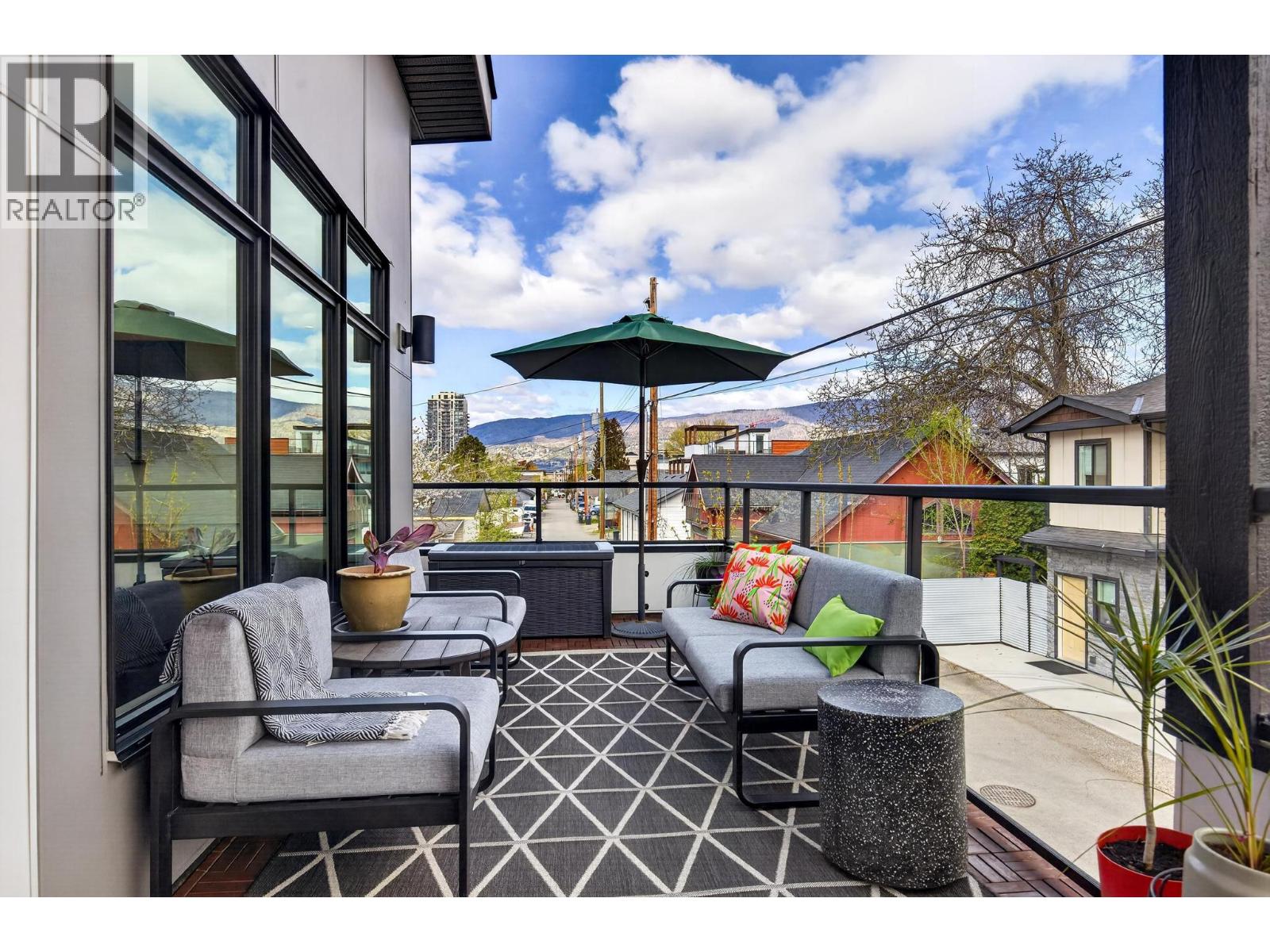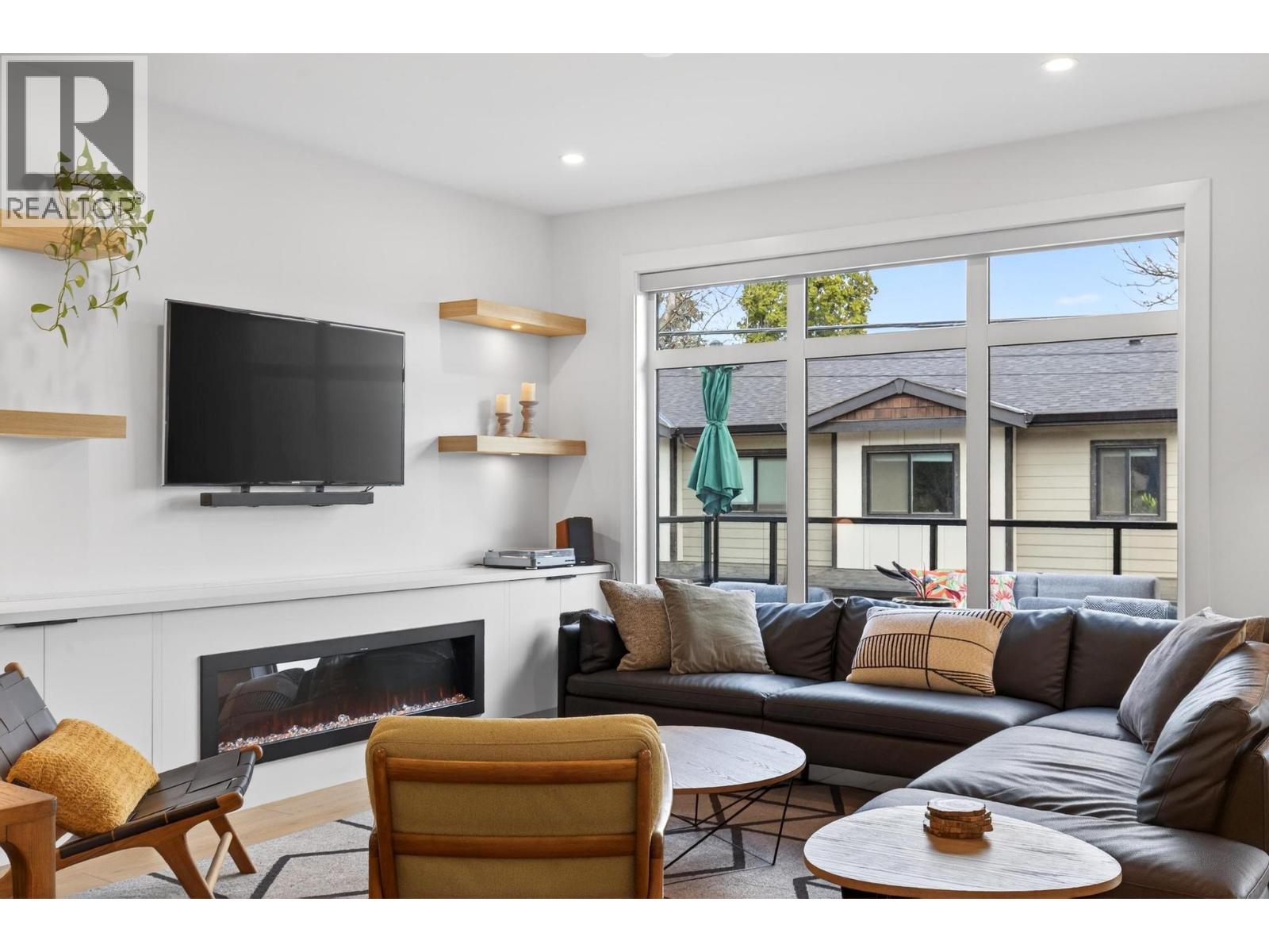 Rare 1,800 sq ft, 4-bed, 3-bath townhome in Downtown Kelowna — and this one comes completely turnkey! The sellers have added post-possession upgrades so you skip the landscaping, fencing, blinds, paint, and finish work that most new builds leave for year one. Upgrades include a custom fenced courtyard with gate and low-maintenance rock-scaping; automated blinds throughout; a designer paint package with accent walls and a full-height staircase feature wall; a custom mural wallpaper and black ceiling in the powder room; Ecobee thermostat; ceiling fan in the primary; added shelving in the foyer closet and kitchen; and a built-out garage with bike hangars. The entry level offers three bedrooms, a full bath, laundry, interior access to the private attached garage, and EV charger ready. Upstairs features 9-foot ceilings, oversized energy-efficient windows, a 10-foot quartz waterfall island, Fisher & Paykel panel-ready appliances, custom cabinetry, and a built-in bar with wine cooler. Living and dining open onto a covered patio with natural gas and built-in speakers. The primary suite is upstairs with a walk-through closet and 5-piece ensuite. Pet-friendly. Mountain and city views. Walking distance to everything downtown. (id:62999)