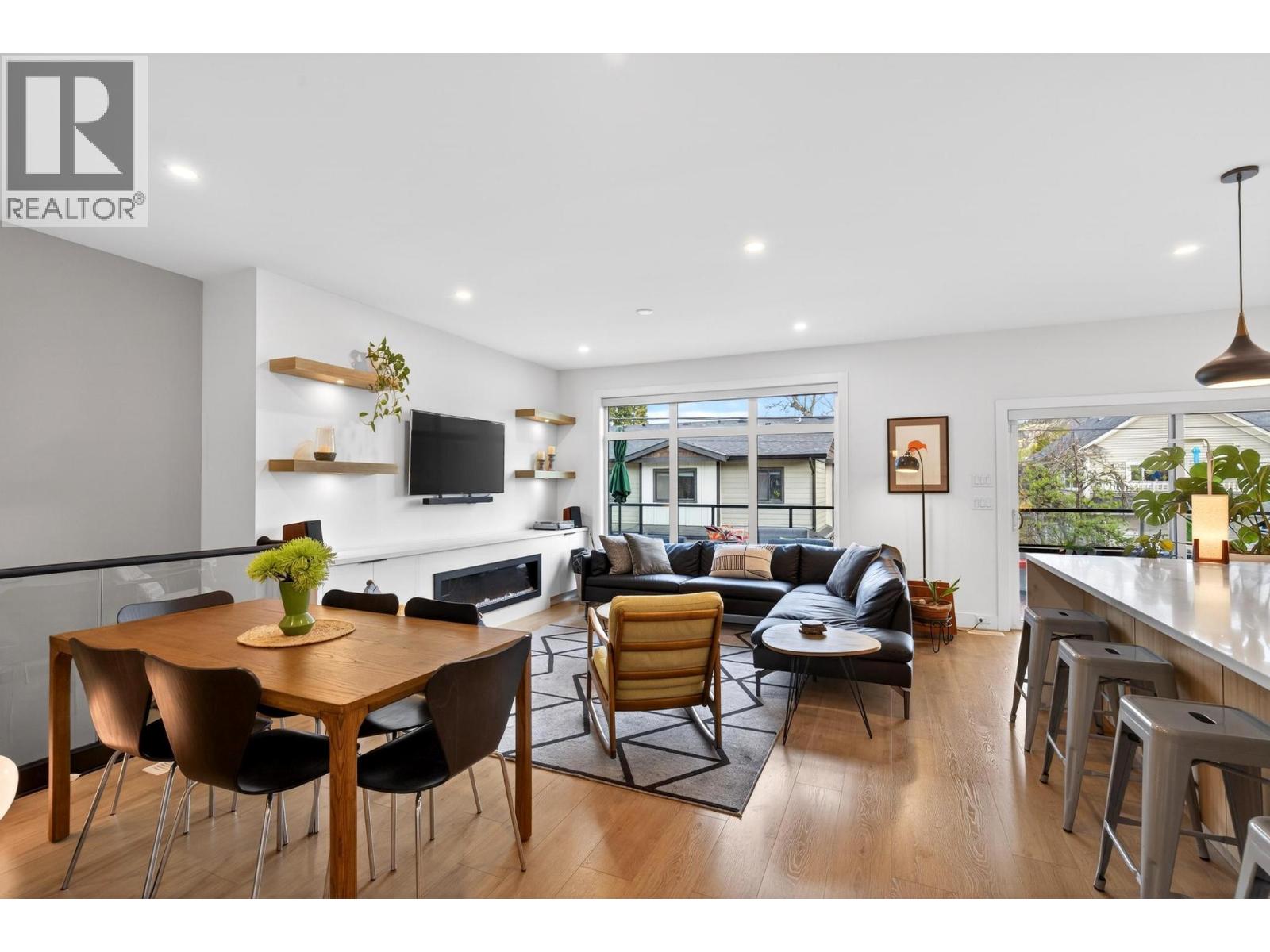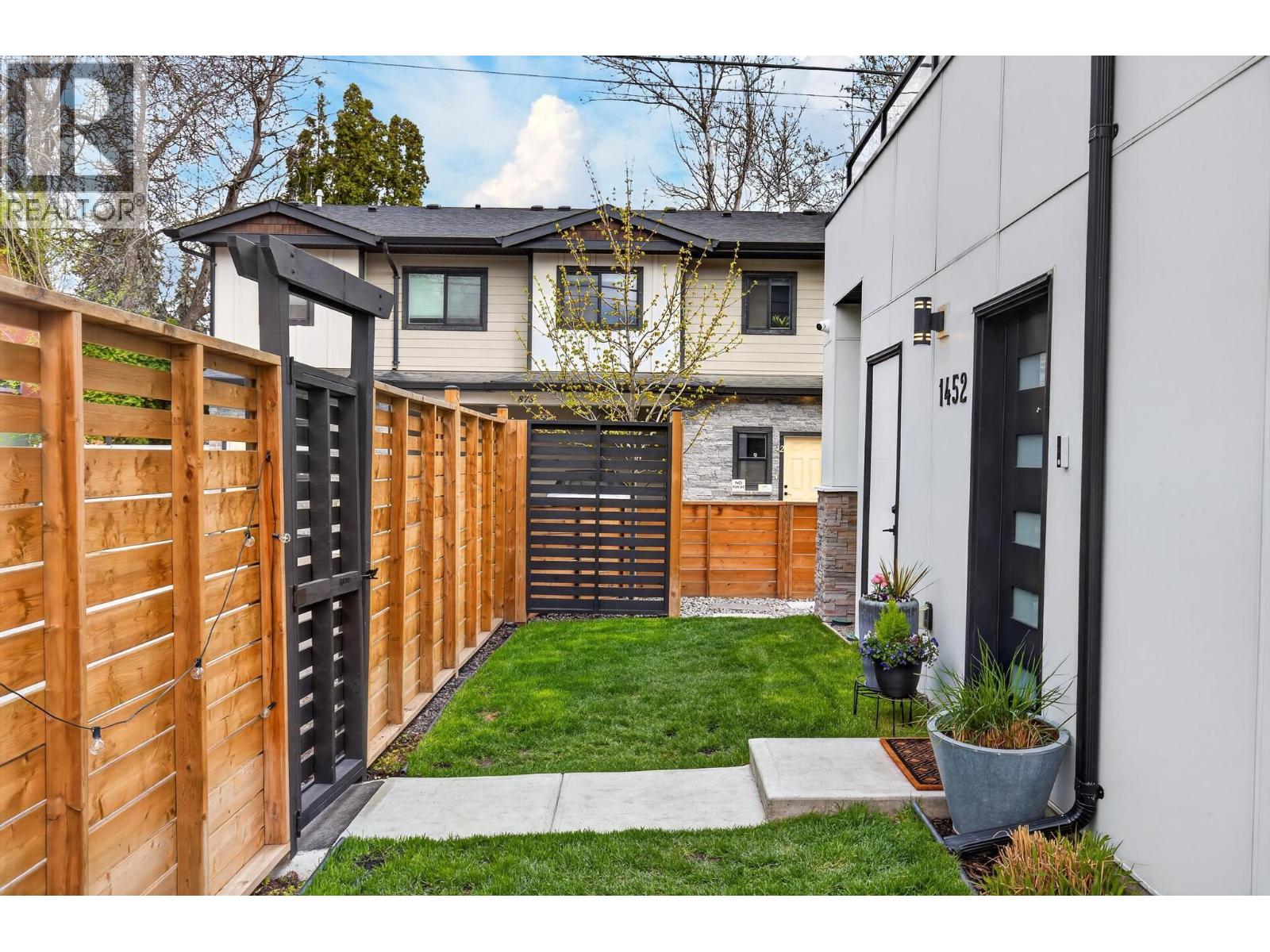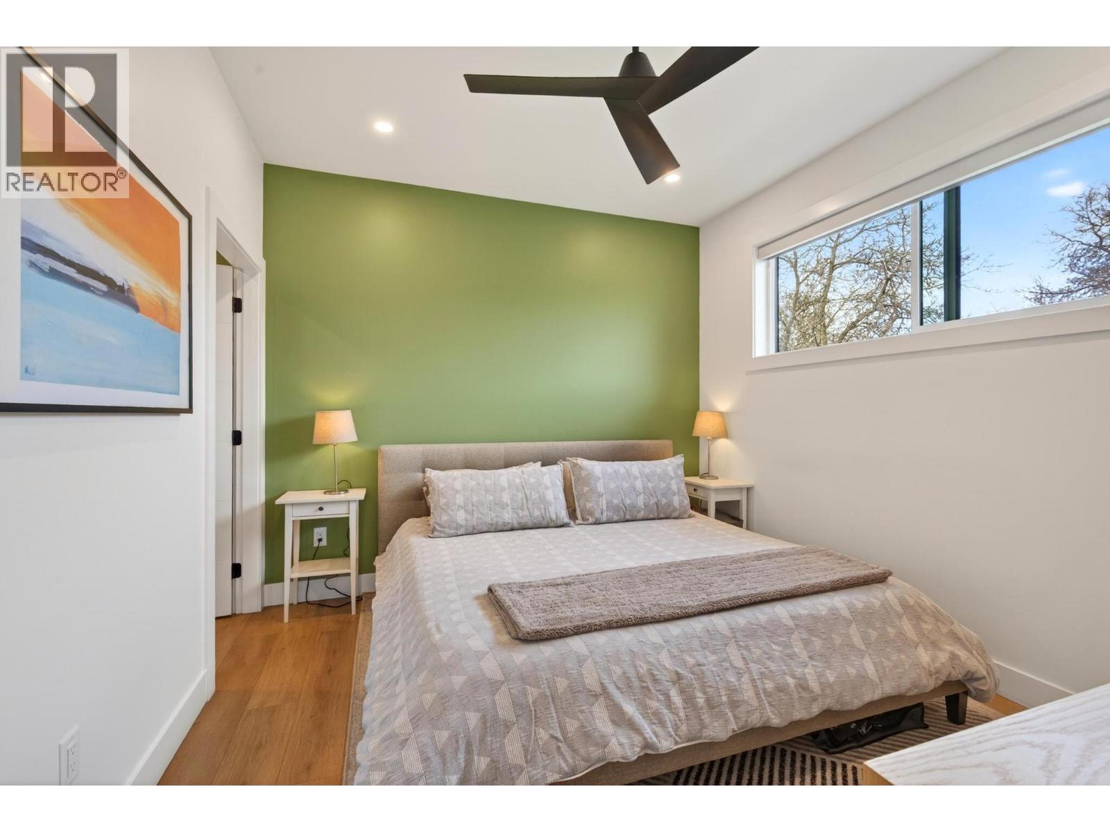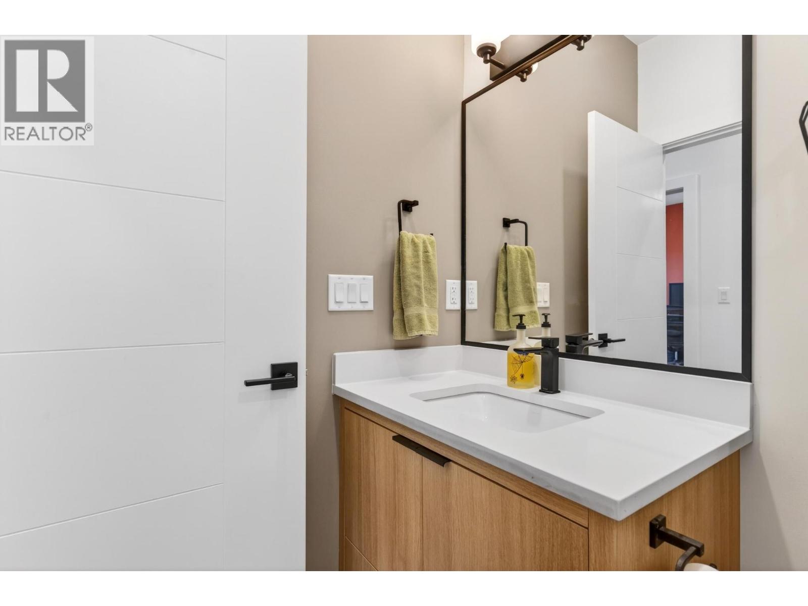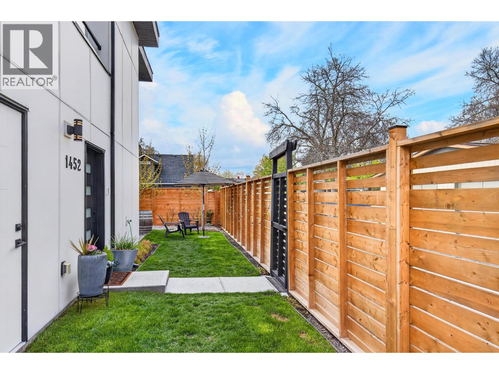 Rare 1,800 sq ft, 4-bed, 3-bath townhome in Downtown Kelowna — and this one comes completely turnkey! The sellers have added post-possession upgrades so you skip the landscaping, fencing, blinds, paint, and finish work that most new builds leave for year one. Upgrades include a custom fenced courtyard with gate and low-maintenance rock-scaping; automated blinds throughout; a designer paint package with accent walls and a full-height staircase feature wall; a custom mural wallpaper and black ceiling in the powder room; Ecobee thermostat; ceiling fan in the primary; added shelving in the foyer closet and kitchen; and a built-out garage with bike hangars. The entry level offers three bedrooms, a full bath, laundry, interior access to the private attached garage, and EV charger ready. Upstairs features 9-foot ceilings, oversized energy-efficient windows, a 10-foot quartz waterfall island, Fisher & Paykel panel-ready appliances, custom cabinetry, and a built-in bar with wine cooler. Living and dining open onto a covered patio with natural gas and built-in speakers. The primary suite is upstairs with a walk-through closet and 5-piece ensuite. Pet-friendly. Mountain and city views. Walking distance to everything downtown. (id:62999)